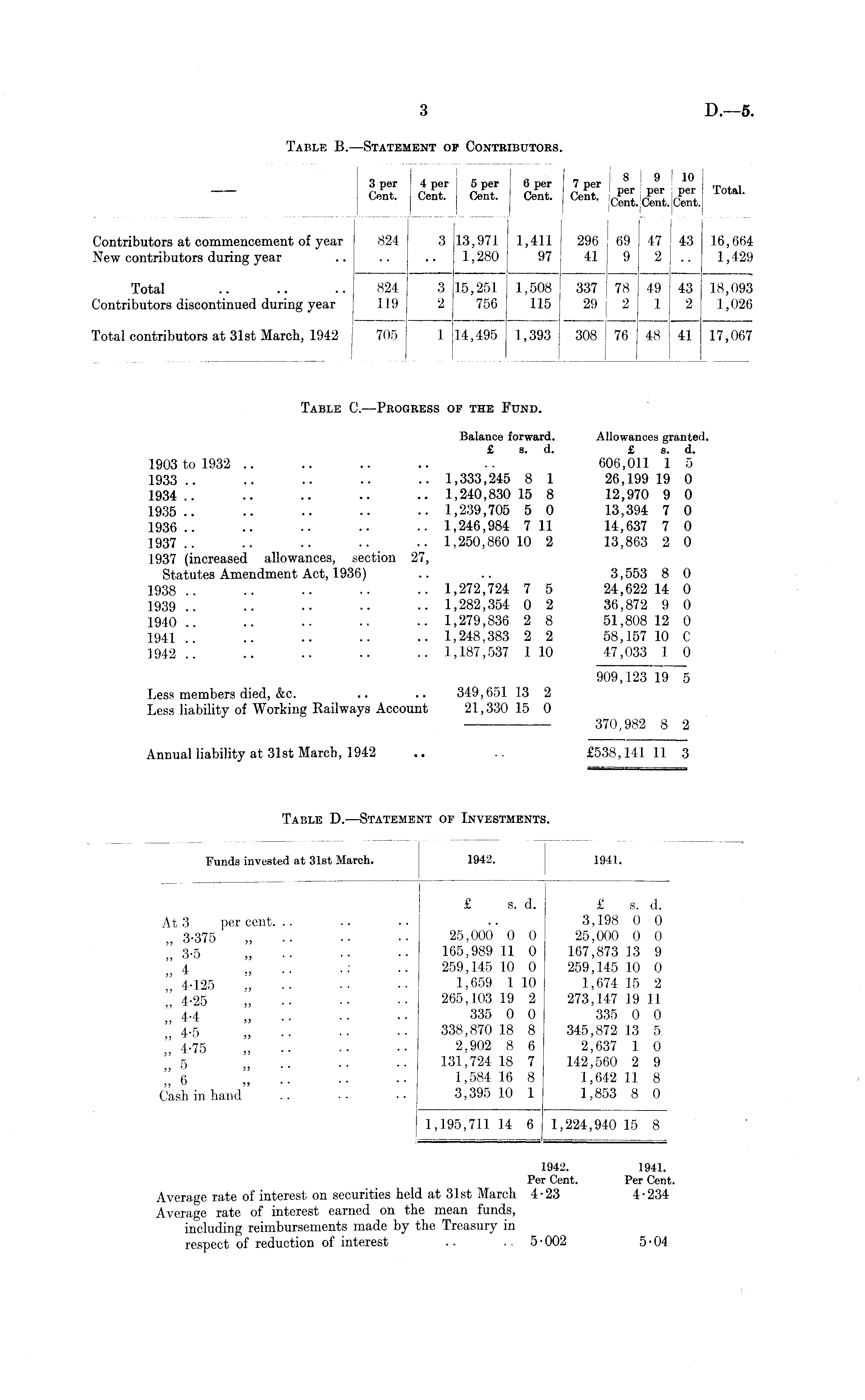 Table C. —Progress of the Fund. Balance forward. Allowances granted. £ s. d. £ s. d. 1903 to 1932 .. .. .. .. .. 606,011 1 5 1933.. .. .. •• •• 1,333,245 8 1 26,199 19 0 1934.. 1,240,830 15 8 12,970 9 0 1935.. .. •• 1,239,705 5 0 13,394 7 0 1936.. .. .. •• 1,246,984 7 11 14,637 7 0 1937.. .. .. •• •• 1,250,860 10 2 13,863 2 0 1937 (increased allowances, section 27, Statutes Amendment Act, 1936) .. .. 3,553 8 0 1938 1,272,724 7 5 24,622 14 0 1939 .. .. •• •• •• 1,282,354 0 2 36,872 9 0 1940.. .. •• •• •• 1,279,836 2 8 51,808 12 0 1941 .. .. •• •• 1,248,383 22 58,157 10 C 1942 .. .. .. 1,187,537 1 10 47,033 1 0 909,123 19 5 Less members died, &c. .. .. 349,651 13 2 Less liability of Working Railways Account 21,330 15 0 370,982 8 2 Annual liability at 31st March, 1942 .. .. £538,141 11 3