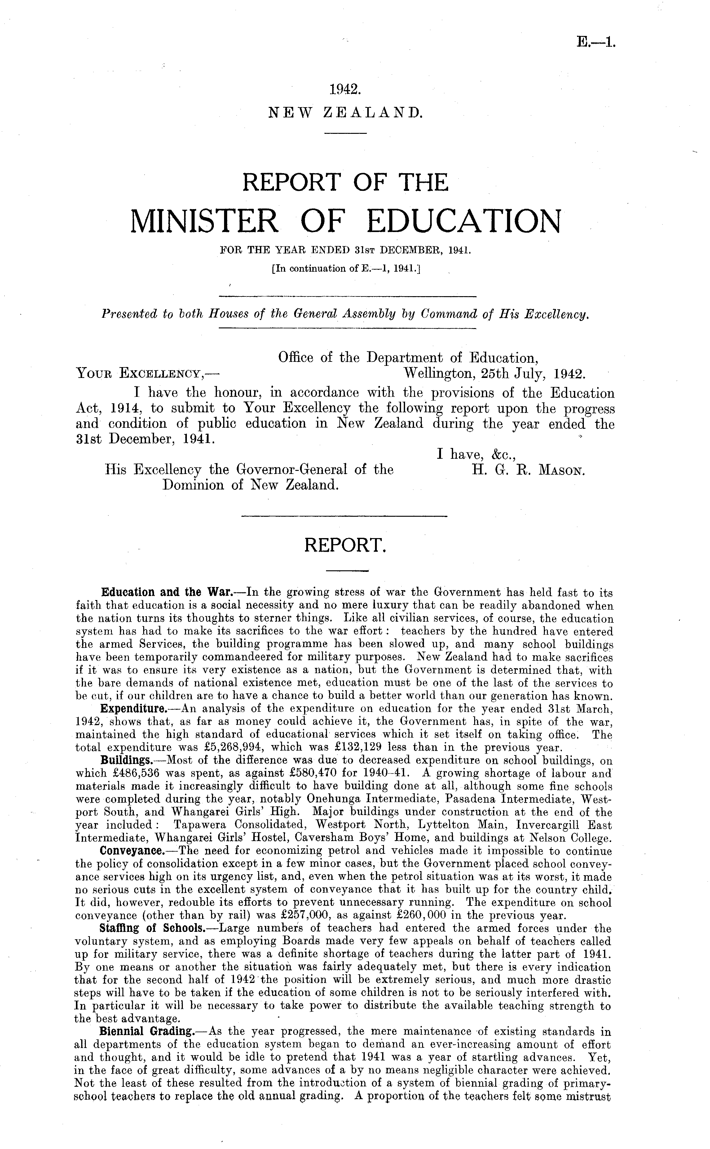 REPORT OF THE MINISTER OF EDUCATION FOR THE YEAR ENDED 31st DECEMBER, 1941. [In continuation of E.—1, 1941.]