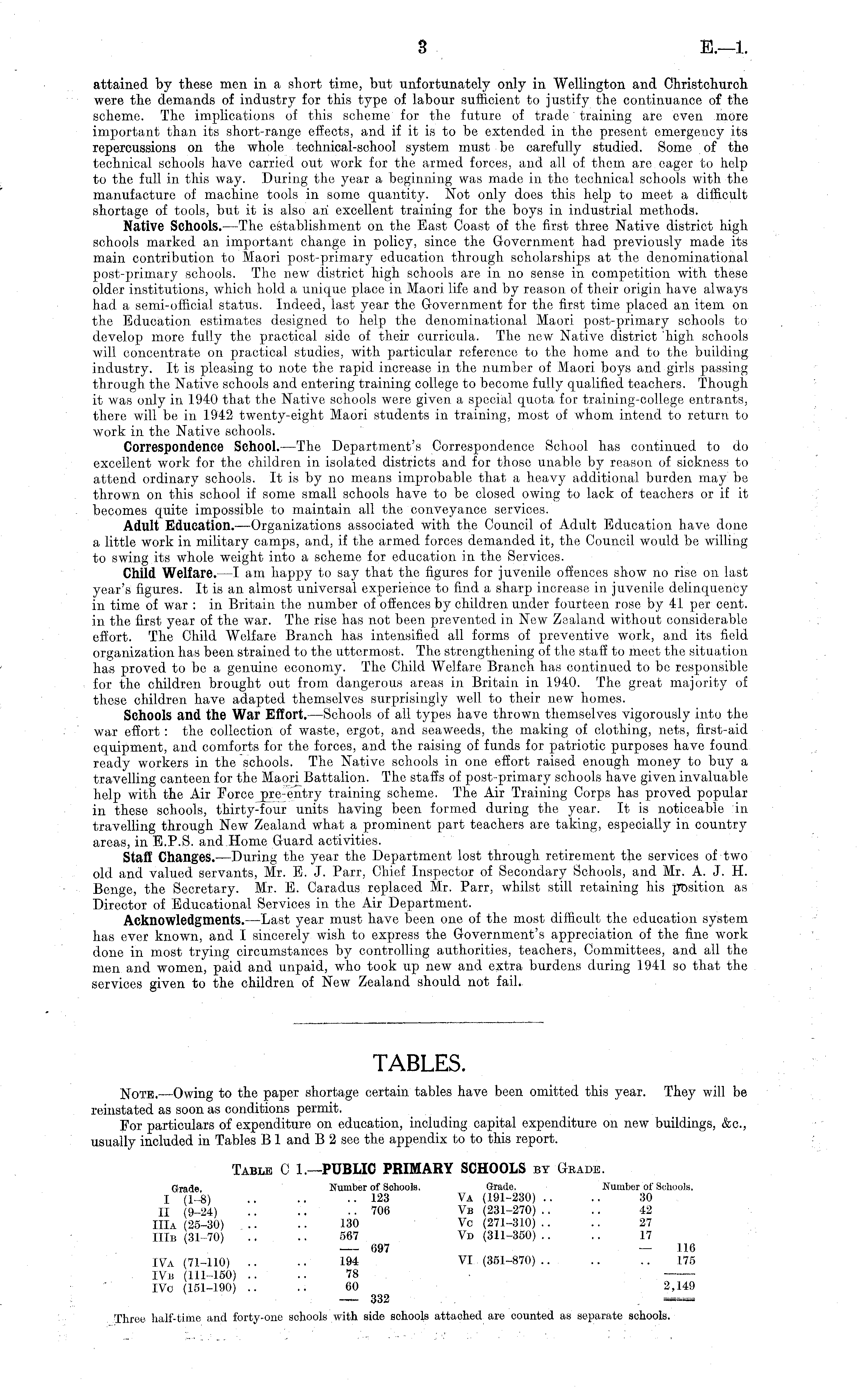 attained by these men in a short time, but unfortunately only in Wellington and Christchurch were the demands of industry for this type of labour sufficient to justify the continuance of the scheme. The implications of this scheme for the future of trade training are even more important than its short-range effects, and if it is to be extended in the present emergency its repercussions on the whole technical-school system must be carefully studied. Some of the technical schools have carried out work for the armed forces, and all of them are eager to help to the full in this way. During the year a beginning was made in the technical schools with the manufacture of machine tools in some quantity. Not only does this help to meet a difficult shortage of tools, but it is also an excellent training for the boys in industrial methods. Native Schools. -The establishment on the East Coast of the first three Native district high schools marked an important change in policy, since the Government had previously made its main contribution to Maori post-primary education through scholarships at the denominational post-primary schools. The new district high schools are in no sense in competition with these older institutions, which hold a unique place in Maori life and by reason of their origin have always had a semi-official status. Indeed, last year the Government for the first time placed an item on the Education estimates designed to help the denominational Maori post-primary schools to develop more fully the practical side of their curricula. The new Native district high schools will concentrate on practical studies, with particular reference to the home and to the building industry. It is pleasing to note the rapid increase in the number of Maori boys and girls passing through the Native schools and entering training college to become fully qualified teachers. Though it was only in 1940 that the Native schools were given a special quota for training-college entrants, there will be in 1942 twenty-eight Maori students in training, most of whom intend to return to work in the Native schools. Correspondence School. -The Department's Correspondence School has continued to do excellent work for the children in isolated districts and for those unable by reason of sickness to attend ordinary schools. It is by no means improbable that a heavy additional burden may be thrown 011 this school if some small schools have to be closed owing to lack of teachers or if it becomes quite impossible to maintain all the conveyance services. Adult Education. - -Organizations associated with the Council of Adult Education have done a little work in military camps, and, if the armed forces demanded it, the Council would be willing to swing its whole weight into a scheme for education in the Services. Child Welfare. —I am happy to say that the figures for juvenile offences show 110 rise 011 last year's figures. It is an almost universal experience to find a sharp increase in juvenile delinquency in time of war : in Britain the number of offences by children under fourteen rose by 41 per cent, in the first year of the war. The rise has not been prevented in New Zealand without considerable effort. The Child Welfare Branch has intensified all forms of preventive work, and its field organization has been strained to the uttermost. The strengthening of the staff to meet the situation has proved to be a genuine economy. The Child Welfare Branch has continued to bo responsible for the children brought out from dangerous areas in Britain in 1940. The great majority of these children have adapted themselves surprisingly well to their new homes. Schools and the War Eifort. —Schools of all types have thrown themselves vigorously into the war effort : the collection of waste, ergot, and seaweeds, the making of clothing, nets, first-aid equipment, and comforts for the forces, and the raising of funds for patriotic purposes have found ready workers in the schools. The Native schools in one effort raised enough money to buy a travelling canteen for the Maori Battalion. The staffs of post-primary schools have given invaluable help with the Air Force pre-entry training scheme. The Air Training Corps has proved popular in these schools, thirty-four units having been formed during the year. It is noticeable in travelling through New Zealand what a prominent part teachers are taking, especially in country areas, in E.P.S. and Home Guard activities. Staff Changes.—During the year the Department lost through retirement the services of two old and valued servants, Mr. E. J. Parr, Chief Inspector of Secondary Schools, and Mr. A. J. H. Bcnge, the Secretary. Mr. E. Caradus replaced Mr. Parr, whilst still retaining his position as Director of Educational Services in the Air Department. Acknowledgments.—Last year must have been one of the most difficult the education system has ever known, and I sincerely wish to express the Government's appreciation of the fine work done in most trying circumstances by controlling authorities, teachers, Committees, and all the men and women, paid and unpaid, who took up new and extra burdens during 1941 so that the services given to the children of New Zealand should not fail.