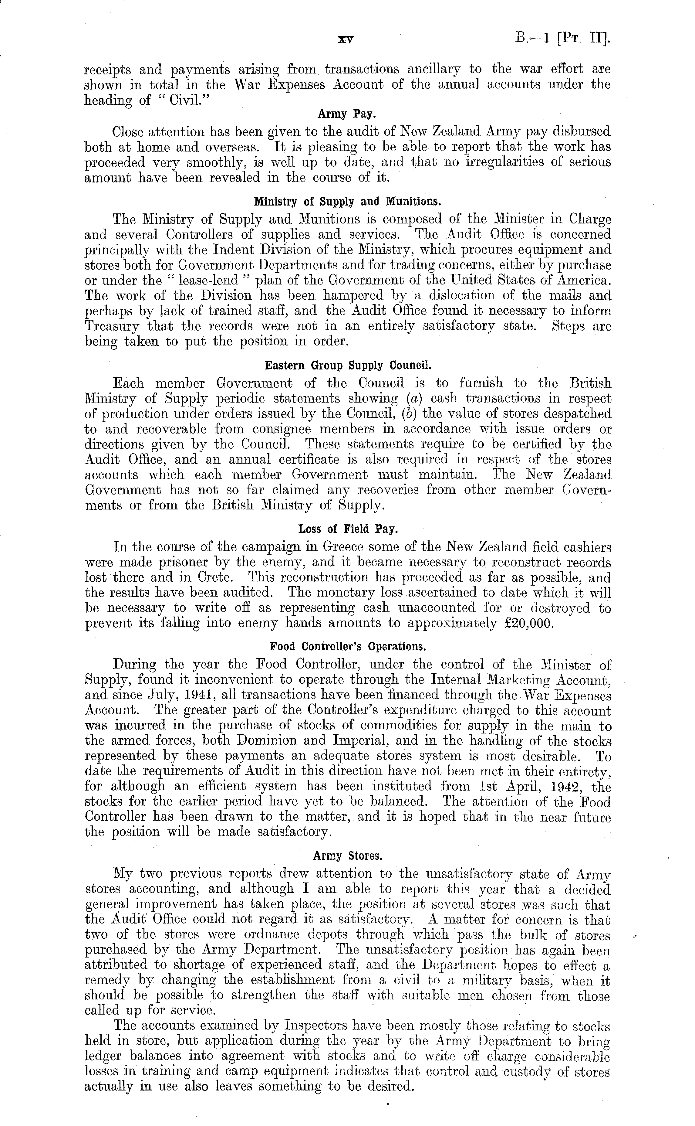 receipts and payments arising from transactions ancillary to the war effort are shown in total in the War Expenses Account of the annual accounts under the heading of " Civil." Army Pay. Close attention has been given to the audit of New Zealand Army pay disbursed both at home and overseas. It is pleasing to be able to report that the work has proceeded very smoothly, is well up to date, and that no irregularities of serious amount have been revealed in the course of it. Ministry of Supply and Munitions. The Ministry of Supply and Munitions is composed of the Minister in Charge and several Controllers of supplies and services. The Audit Office is concerned principally with the Indent Division of the Ministry, which procures equipment and stores both for Government Departments and for trading concerns, either by purchase or under the " lease-lend " plan of the Government of the United States of America. The work of the Division has been hampered by a dislocation of the mails and perhaps by lack of trained staff, and the Audit Office found it necessary to inform Treasury that the records were not in. an entirely satisfactory state. Steps are being taken to put the position in order. Eastern Group Supply Council. Each member Government of the Council is to furnish to the British Ministry of Supply periodic statements showing (a) cash transactions in respect of production under orders issued by the Council, (b) the value of stores despatched to and recoverable from consignee members in accordance with issue orders or directions given by the Council. These statements require to be certified by the Audit Office, and an annual certificate is also required in respect of the stores accounts which each member Government must maintain. The New Zealand Government has not so far claimed any recoveries from other member Governments or from the British Ministry of Supply. Loss of Field Pay. In the course of the campaign in Greece some of the New Zealand field cashiers were made prisoner by the enemy, and it became necessary to reconstruct records lost there and in Crete. This reconstruction has proceeded as far as possible, and the results have been audited. The monetary loss ascertained to date which it will be necessary to write off as representing cash unaccounted for or destroyed to prevent its falling into enemy hands amounts to approximately £20,000. Food Controller's Operations. During the year the Food Controller, under the control of the Minister of Supply, found it inconvenient to operate through the Internal Marketing Account, and since July, 1941, all transactions have been financed through the War Expenses Account. The greater part of the Controller's expenditure charged to this account was incurred in the purchase of stocks of commodities for supply in the main to the armed forces, both Dominion and Imperial, and in the handling of the stocks represented by these payments an adequate stores system is most desirable. To date the requirements of Audit in this direction have not been met in their entirety, for although an efficient system has been instituted from Ist April, 1942, the stocks for the earlier period have yet to be balanced. The attention of the Food Controller has been drawn to the matter, and it is hoped that in the near future the position will be made satisfactory. Army Stores. My two previous reports drew attention to the unsatisfactory state of Army stores accounting, and although I am able to report this year that a decided general improvement has taken place, the position at several stores was such that the Audit Office could not regard it as satisfactory. A matter for concern is that two of the stores were ordnance depots through which pass the bulk of stores purchased by the Army Department. The unsatisfactory position lias again been, attributed to shortage of experienced staff, and the Department hopes to effect a remedy by changing the establishment from a civil to a military basis, when it should be possible to strengthen the staff with suitable men chosen from those called up for service. The accounts examined by Inspectors have been mostly those relating to stocks held in store, but application during the year by the Army Department to bring ledger balances into agreement with stocks and to write off charge considerable losses in training and camp equipment indicates that control and custody of stores actually in use also leaves something to be desired.