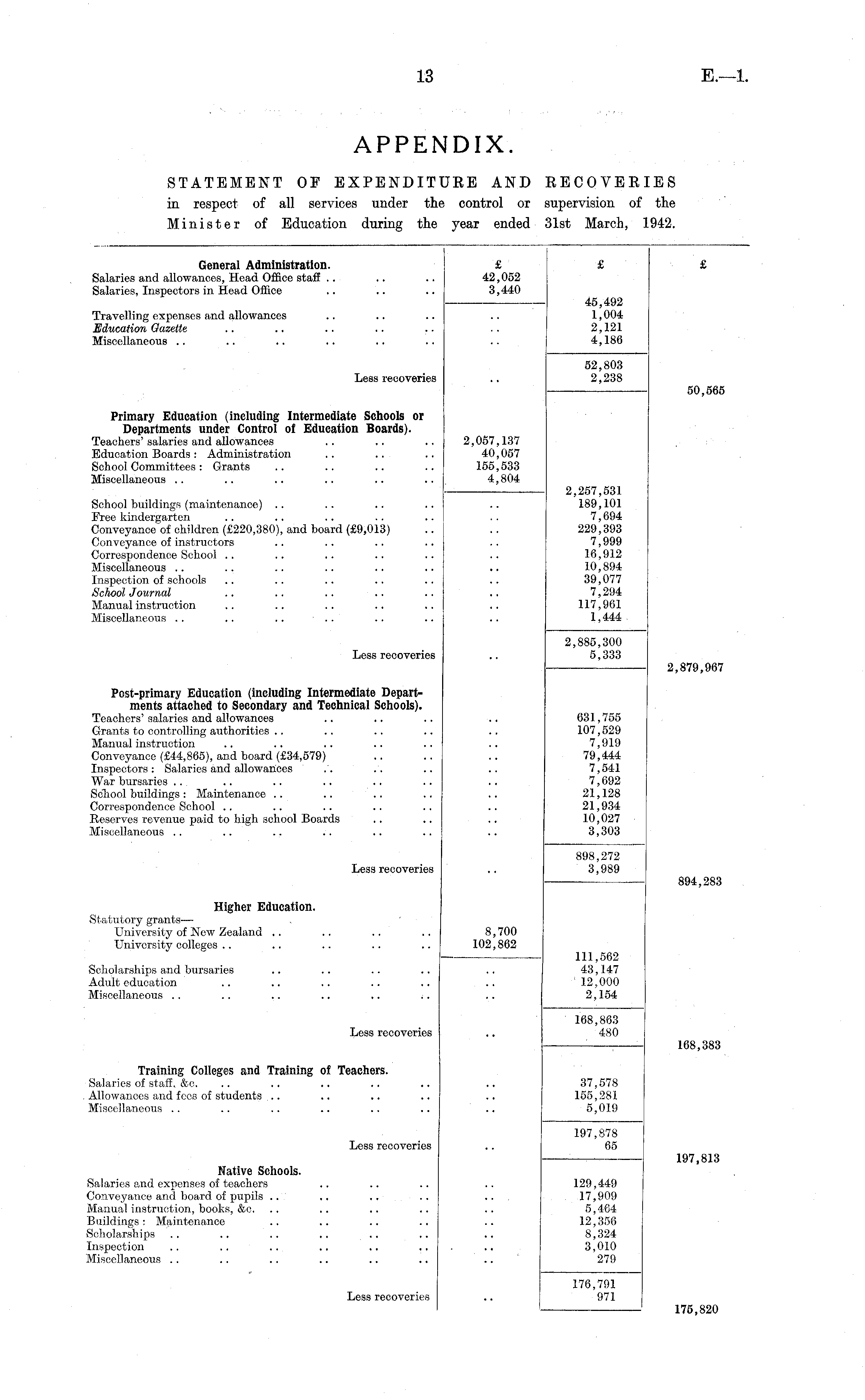 APPENDIX. STATEMENT OF EXPENDITURE AND RECOVERIES in respect of all services under the control or supervision of the Minister of Education during the year ended 31st March, 1942.