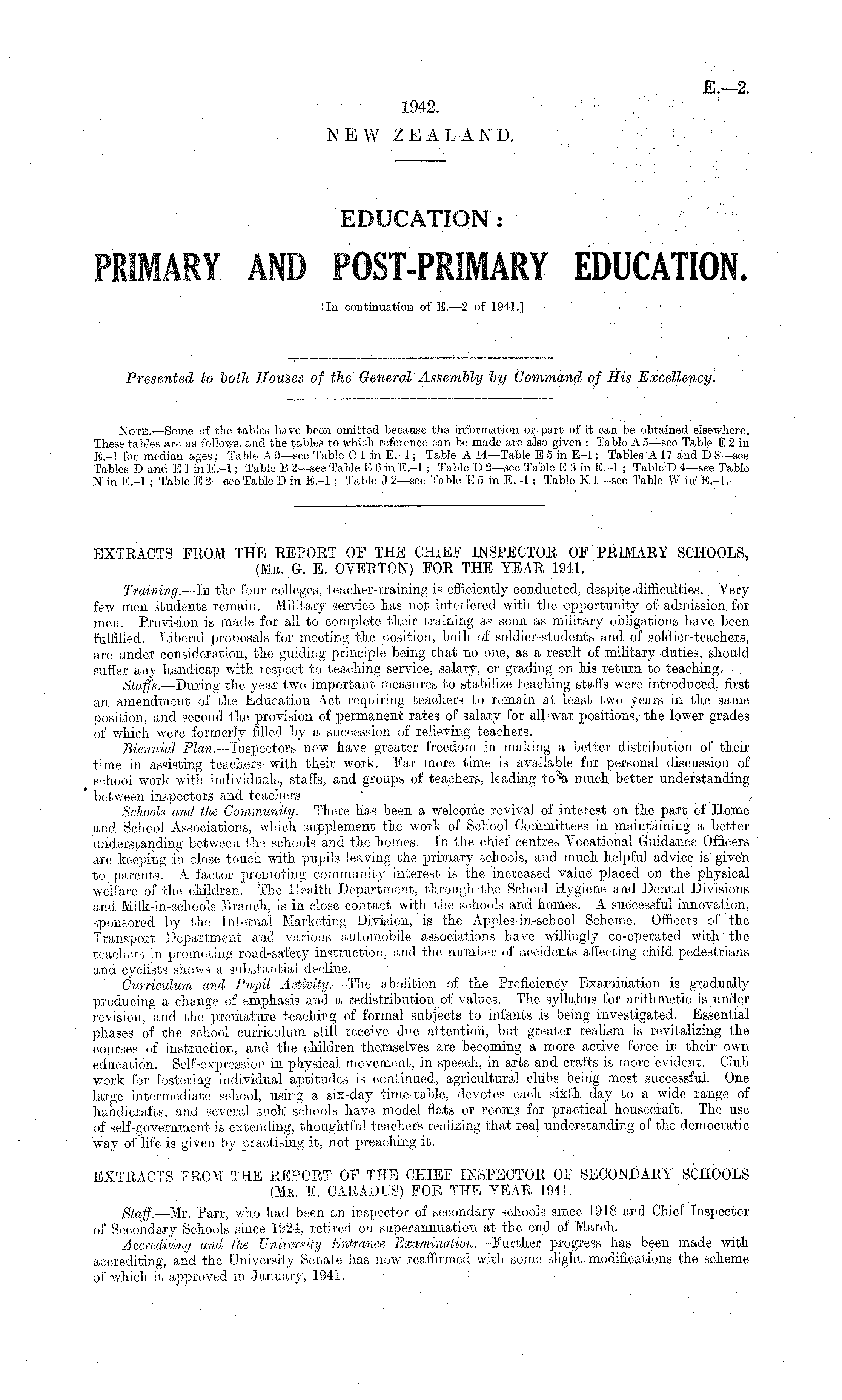 EXTRACTS FROM THE REPORT OE THE CHIEF INSPECTOR OF PRIMARY SCHOOLS, (Mr. G. E. OVERTON) FOR THE YEAR 1941. Training.—ln the four colleges, teacher-training is efficiently conducted, despite-difficulties. Very few men students remain. Military service has not interfered with the opportunity of admission for men. Provision is made for all to complete their training as soon as military obligations have been fulfilled. Liberal proposals for meeting the position, both of soldier-students and of soldier-teachers, are under consideration, the guiding principle being that no one, as a result of military duties, should suffer any handicap with respect to teaching service, salary, or grading on his return to teaching. Staffs. —During the year two important measures to stabilize teaching staffs were introduced, first an amendment of the Education Act requiring teachers to remain at least two years in the same position, and second the provision of permanent rates of salary for all war positions, the lower grades of which were formerly filled by a succession of relieving teachers. Biennial Plan. —Inspectors now have greater freedom in making a better distribution of their time in assisting teachers with their work. Far more time is available for personal discussion of school work with individuals, staffs, and groups of teachers, leading to\ much better understanding between inspectors and teachers. Schools and the Community. —There has been a welcome revival of interest on the part of Home and School Associations, which Supplement the work of School Committees in maintaining a better understanding between the schools and the homes. In the chief centres Vocational Guidance Officers are keeping in close touch with pupils leaving the primary schools, and much helpful advice is given to parents. A factor promoting community interest is the increased value placed on the physical welfare of the children. The Health Department, through the School Hygiene and Dental Divisions and Milk-in-schoois Branch, is in close contact with the schools and homes. A successful innovation, sponsored by the Internal Marketing Division, is the Apples-in-school Scheme. Officers of the Transport Department and various automobile associations have willingly co-operated with the teachers in promoting road-safety instruction, and the number of accidents affecting child pedestrians and cyclists shows a substantial decline. Curriculum and Pupil Activity. —The abolition of the Proficiency Examination is gradually producing a change of emphasis and a redistribution of values. The syllabus for arithmetic is under revision, and the premature teaching of formal subjects to infants is being investigated. Essential phases of the school curriculum still receive due attention, but greater realism is revitalizing the courses of instruction, and the children themselves are becoming a more active force in their own education. Self-expression in physical movement, in speech, in arts and crafts is more evident. Club work for fostering individual aptitudes is continued, agricultural clubs being most successful. One large intermediate school, usirg a six-day time-table, devotes each sixth day to a wide range of handicrafts, and several such schools have model flats or rooms for practical housecraft. The use of self-government is extending, thoughtful teachers realizing that real understanding of the democratic way of life is given by practising it, not preaching it. EXTRACTS FROM THE REPORT OF THE CHIEF INSPECTOR OF SECONDARY SCHOOLS (Mr. E. CARADUS) FOR THE YEAR 1941. Staff. —Mr. Parr, who had been an inspector of secondary schools since 1918 and Chief Inspector of Secondary Schools since 1924, retired on superannuation at the end of March. Accrediting and the University Entrance Examination. —Further progress has been made with accrediting, and the University Senate has now reaffirmed with some slight modifications the scheme of which it approved in January, 1941.