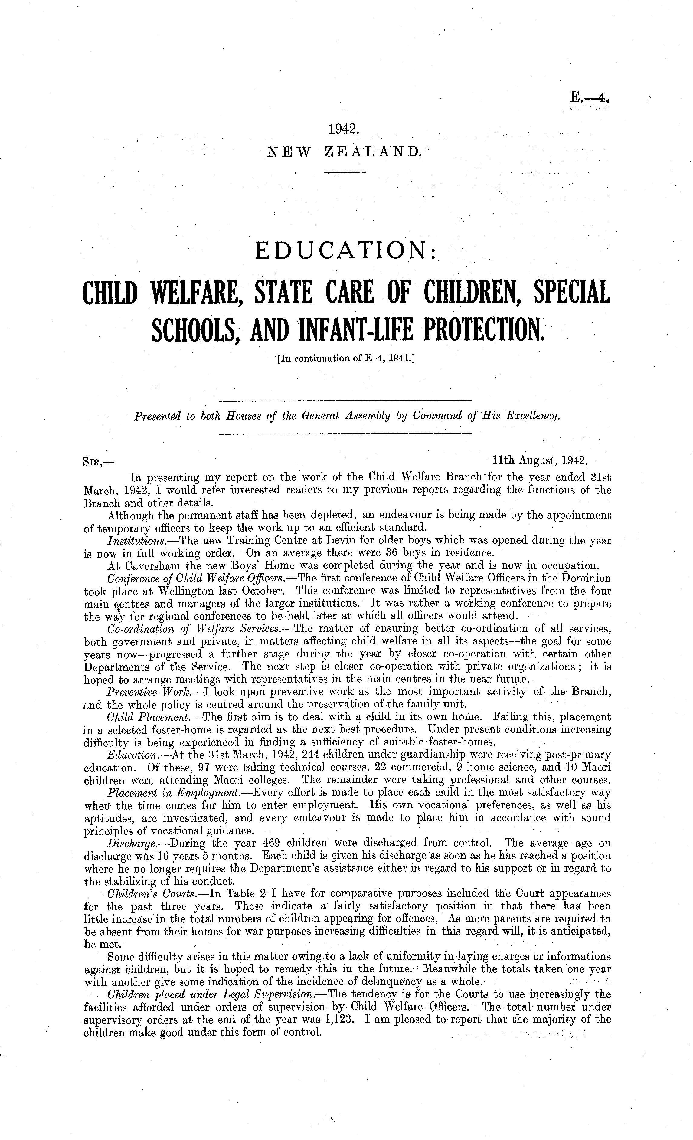 EDUCATION: CHILD WELFARE, STATE CARE OF CHILDREN, SPECIAL SCHOOLS, AND INFANT-LIFE PROTECTION. [In continuation of E-4, 1941.]
