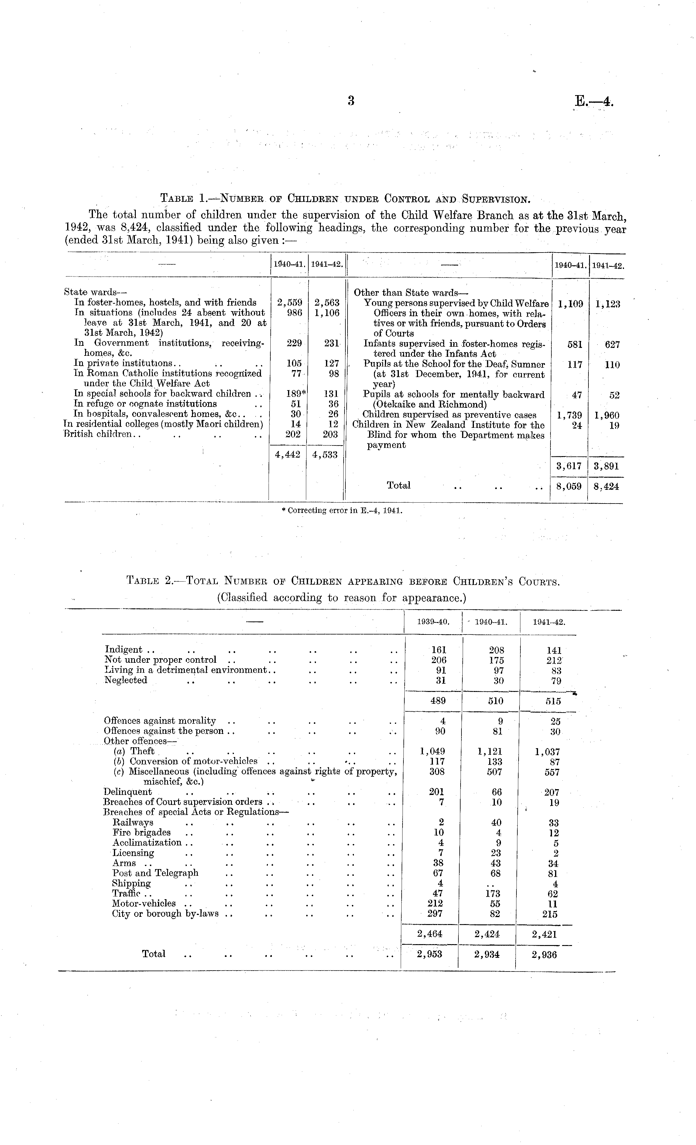 Table 1. —Number of Children under Control and Supervision. The total number of children under the supervision of the Child Welfare Branch as at the 31st March, 1942, was 8,424, classified under the following headings, the corresponding number for the previous year (ended 31st March, 1941) being also given : —
