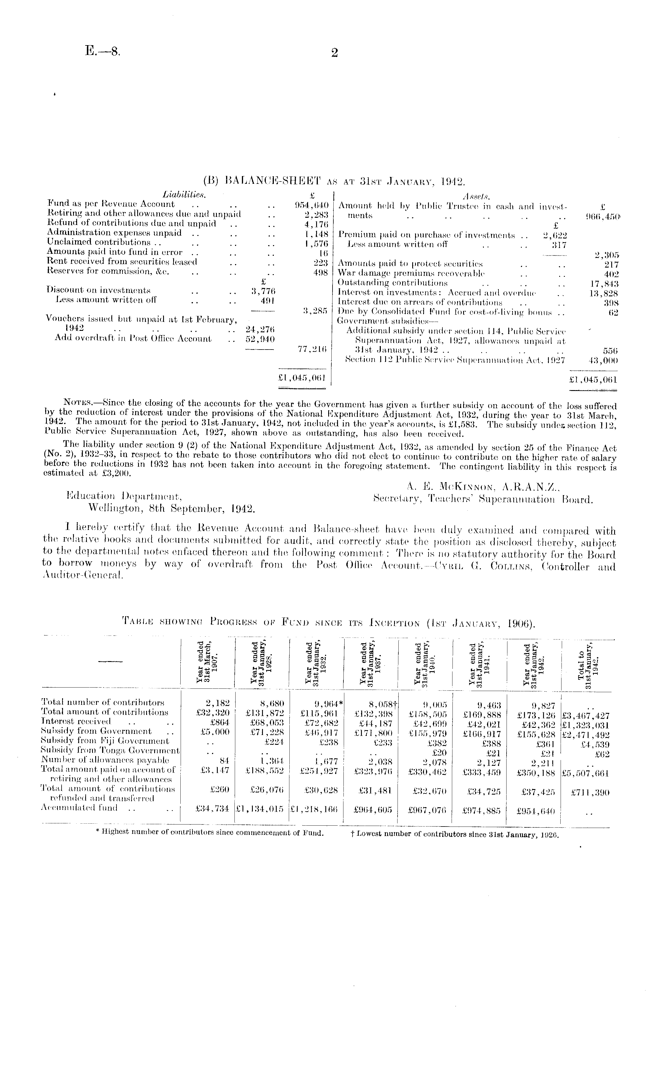 (B) BALANCE-SHEET as at 31st January, 1942. Liabilities. £ ssets. Fund as per Revenue Account .. .. .. 954,640 Amount held by Public Trustee in cash and invest- £ Retiring and other allowances due and unpaid .. 2,283 ments .. .. .. .. .. 966 450 Refund of contributions due and unpaid .. .. 4,176 £ Administration expenses unpaid .. .. .. 1,148 Premium paid on purchase of investments .. 2,622 Unclaimed contributions .. .. .. .. 1,576 Less amount written off .. .. 317 Amounts paid into fund in error .. .. .. 16 % 305 Rent received from securities leased .. .. 223 Amounts paid to protect s( jcurities .. .. 217 Reserves for commission, &c. .. .. .. 498 War damage premiums recoverable .. .. 402 . £ Outstanding contributions .. .. .. 17,843 Discount on investments .. .. 3,776 Interest on investments: Accrued and overdue .. 13,828 Less amount written off .. .. 491 I nterest due on arrears of contributions .. .. 398 — 3,285 Due by Consolidated Fund for cost-of-living bonus .. 02 Vouchers issued but unpaid at Ist February, Government subsidies — •; • • • • • • 24,276 Additional subsidy under section 114, Public Service Add overdraft in Post Office Account .. 52,940 Superannuation Act, 1927, allowances unpaid at 77,216 31st January, 1942 .. .. .. .. 556 Section 112 Public Service Superannuation Act, 1927 43,000 £1,045,061 £1,045,061 Notes. Since the closing of the accounts for the year the Government has given a further subsidy on account of the loss suffered by the reduction of interest under the provisions of the National Expenditure Adjustment Act, 1932, during the year to 31st March, 1942. The amount for the period to 31st January, 1942, not included in the year's accounts, is £1,583. The subsidy under, section 112' Public Service Superannuation Act, 1927, shown above as outstanding, has also been received. The liability under section 9 (2) of the National Expenditure Adjustment Act, 1932, as amended by section 25 of the Finance Act (No. 2), 1932-33, in respect to the rebate to those contributors who did not elect to continue to contribute on the higher rate of salary before the reductions in 1932 has not been taken into account in the foregoing statement. The contingent liability in this resnect is estimated at £3,200. r A,. E. Mc-Kinnon, A.R.A.N.Z., Education Department, Secretary, Teachers' Superannuation Board. Wellington, Bth September, 1942. I hereby certify that the Revenue Account and Balanoe-sheet have been duly examined and compared with the relative books and documents submitted for audit, and correctly state the position as disclosed thereby, subject to the departmental notes enfaced thereon and the following comment : There is no statutory authority for the Board to borrow moneys by way of overdraft from the Post Office Account.—Cyril G. Collins, Controller and Auditor-General.