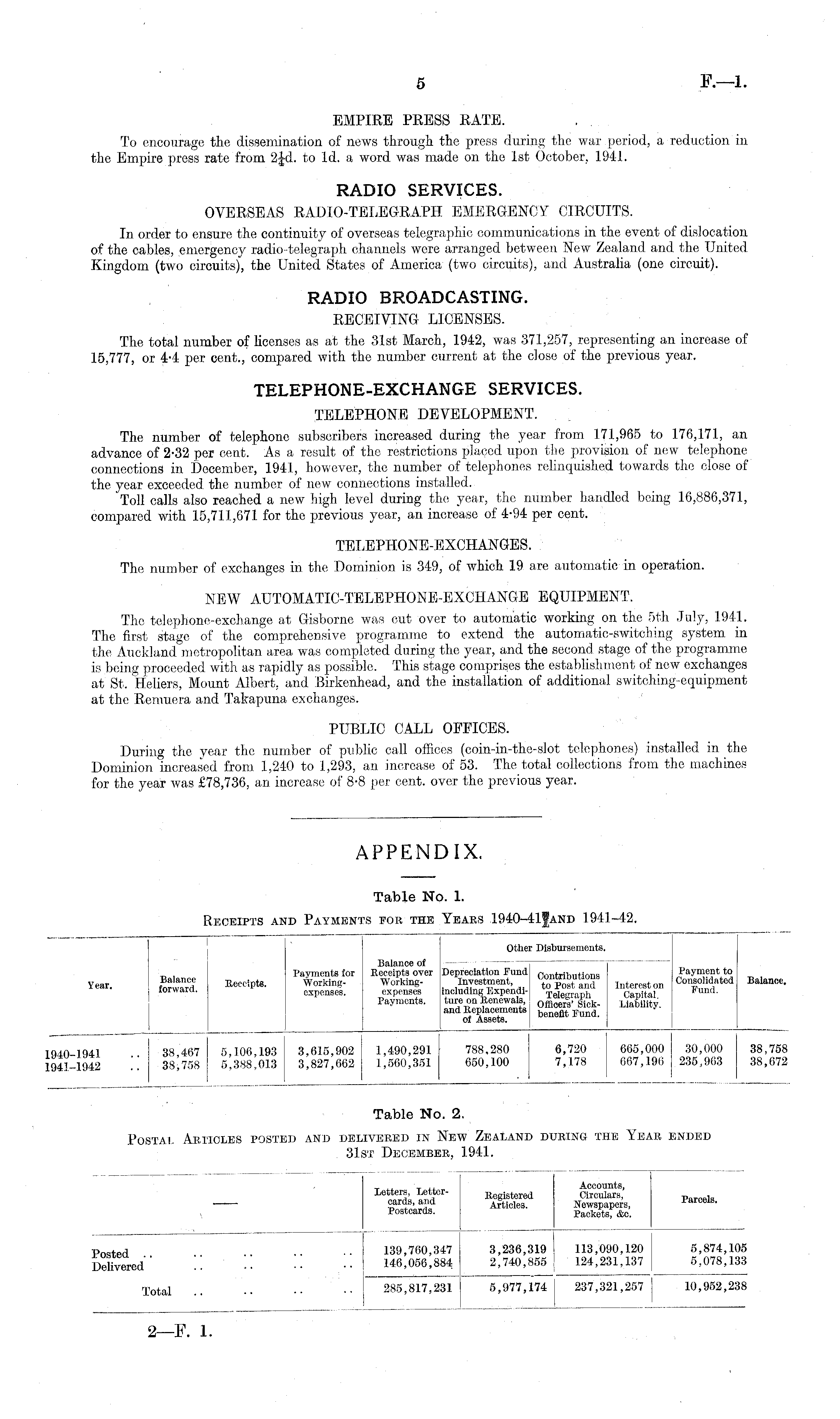 EMPIRE PRESS RATE. To encourage the dissemination of news through the press during the war period, a reduction in the Empire press rate from 2Jd. to Id. a word was made on the Ist October. 1941. RADIO SERVICES. OVERSEAS RADIO-TELEGRAPH EMERGENCY CIRCUITS. In order to ensure the continuity of overseas telegraphic communications in the event of dislocation of the cables, emergency radio-telegraph channels were arranged between New Zealand and the United Kingdom (two circuits), the United States of America (two circuits), and Australia (one circuit). RADIO BROADCASTING. RECEIVING LICENSES. The total number of licenses as at the 31st March, 1942, was 371,257, representing an increase of 15,777, or 4-4 per cent., compared with the number current at the close of the previous year. TELEPHONE-EXCHANGE SERVICES. TELEPHONE DEVELOPMENT. The number of telephone subscribers increased during the year from 171,965 to 176,171, an advance of 2-32 per cent. As a result of the restrictions placed upon the provision of new telephone connections in December, 1941, however, the number of telephones relinquished towards the close of the year exceeded the number of new connections installed. Toll calls also reached a new high level during the year, the number handled being 16,886,371, compared with 15,711,671 for the previous year, an increase of 4-94 per cent. TELEPHONE-EXCHANGES. The number of exchanges in the Dominion is 349, of which 19 are automatic in operation. NEW AUTOMATIC-TELEPHONE-EXCHANGE EQUIPMENT. The telephone-exchange at Gisborne was out over to automatic working on the sth July, 1941. The first stage of the comprehensive programme to extend the automatic-switching system in the Auckland metropolitan area was completed during the year, and the second stage of the programme is being proceeded with as rapidly as possible. This stage comprises the establishment of new exchanges at St. Heliers, Mount Albert, and Birkenhead, and the installation of additional switching-equipment at the Rcniuera and Takapuna exchanges. PUBLIC CALL OFFICES. During the year the number of public call offices (coin-in-the-slot telephones) installed in the Dominion increased from .1,240 to 1,293, an increase of 53. The total collections from the machines for the year was £78,736, an increase of 8-8 per cent, over the previous year.