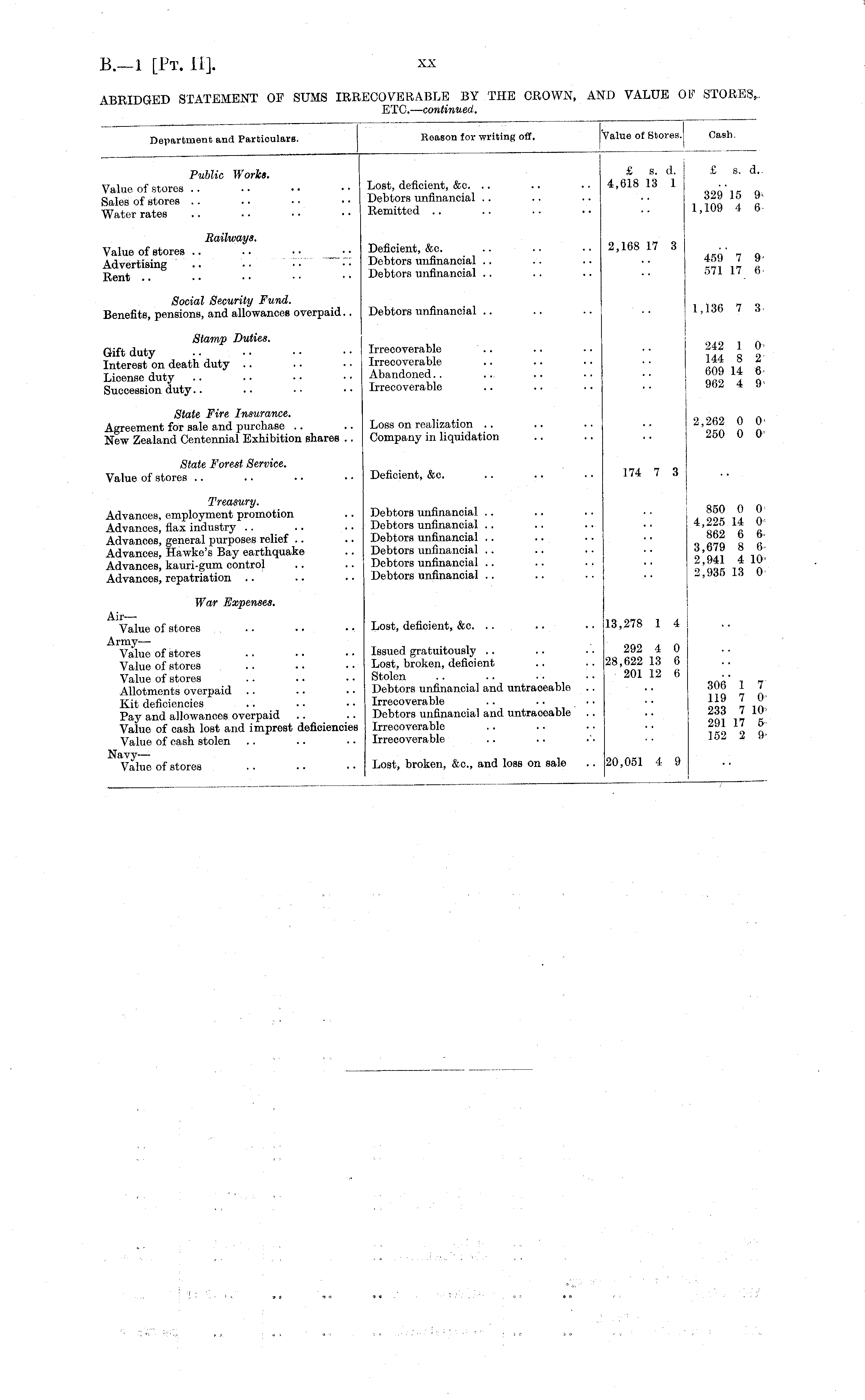 Department and Particulars. Reason for writing off. Value of Stores. Cash. Public Works. £ s - s ' Value of stores .. .. .. •• Lost, deficient, 4sc. .. .. .. 4,618 13 1 .. Sales of stores Debtors unfinancial ■■ , Yno ? « Water rates .. •• •• Remitted .. .. •• •• 1.109 4 6 Value of stores .. •• •• Deficient, &c. 2,168 17 3 .. Advertising .. • • •• •• Debtors unfinancial .. .. .. .. 48y / »• jj en t _ .. .. Debtors unfinancial .. .. .. •• oil n o Social Security Fund. Benefits, pensions, and allowances overpaid.. Debtors unfinancial .. .. •• 1,1 db Stamp Duties. Gift duty .. ■ • • • • • Irrecoverable .. .. ■ ■ • • l u Interest on death duty .. .. Irrecoverable .. .. ■■ ■■ 144 8 2 T.inpnsp diitiv .. .. Abandoned.. .. .. •• •• ouy 14 0 Succession duty.. .. •• Irrecoverable .. .. ■■ •• 962 4 9 State Fire Insurance. Agreement for sale and purchase .. .. Loss on realization .. .. .. •• 'oka n n New Zealand Centennial Exhibition shares .. Company in liquidation .. .. • • 250 U U State Forest Service. Value of stores .. .. •• •• Deficient, &c. .. .. •• 174 7 3 Treasury. I _ Advances, employment promotion .. Debtors unfinancial .. .. .. •• »BU U u Advances, flax industry .. .. •. Debtors unfinancial .. .. .. •• 14 U Advances, general purposes relief .. .. Debtors unfinancial .. . • •• ° b Advances, Hawke's Bay earthquake .. Debtors unfinancial .. .. .. •• 3,b79 8 b kauri-gum control .. .. Debtors unfinancial .. .. .. •• o'oor it n Advances, repatriation .. .. Debtors unfinancial .. .. .. •• -,•«» h* u War Expenses. A Value of stores .. .. •• Lost, deficient, &c. .. .. 13,278 1 4 Army— n Value of stores .. .. . • Issued gratuitously .. .. .. 292 4 u Value of stores .. .. •• Lost, broken, deficient .. .. 28,622 13 b Value of stores .. .. •• Stolen .. .. •• 201 12 6 .. Allotments overpaid .. .. • • Debtors unfinancial and untraoeablo .. .. .sub I I Kit deficiencies .. .. •• Irrecoverable .. .. •• •• J I Pay and allowances overpaid .. .. Debtors unfinancial and untraceable .. .. J u ' Value of cash lost and imprest deficiencies Irrecoverable .. .. • • • • iro o q Value of cash stolen .. .. ■■ Irrecoverable .. .. •• 15L, 2 y Navy— Value of stores .. •• Lost, broken, &c., and loss on sale .. 20,051 4 9