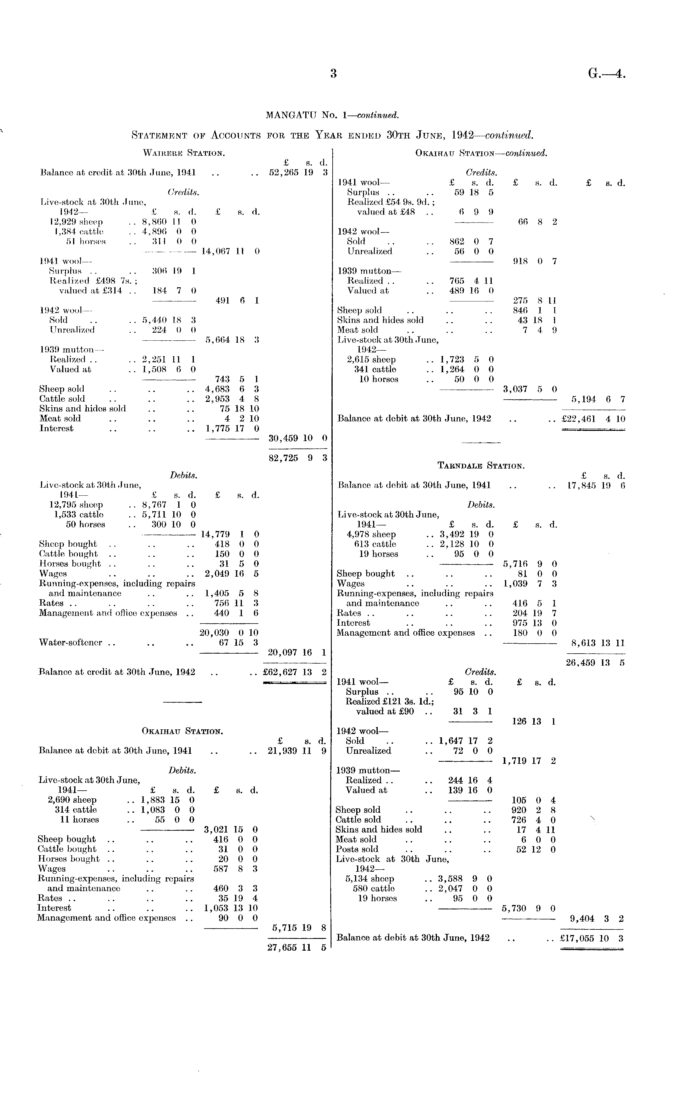 MANGATU No. I—continued. Statement of Accounts fob the Year ended 30th June, 1942—continued. Waikeiie Station. Okaihatt Station—continued. £ 8. d. Balance at credit at 30th June, 1941 .. .. 52,265 19 3 Credits. 1941 wool— £ s. d. £ s. d. £ s. d. Credits. Surplus .. .. 59 18 5 Live-stock at 30th June, Realized £54 9s. 9d.; 1942 — £ s. d. £ s. d. valued at £48 .. 6 9 9 12,929 sheep .. 8,860 11 0 66 8 2 1,384 cattle ..4,896 0 0 1942 wool— 51 horses .. 311 0 0 Sold .. .. 862 0 7 14,067 11 0 Unrealized .. 56 0 0 1941 wool— 918 0 7 Surplus .. .. 306 19 1 1939 mutton— Realized £498 7s. ; Realized .. .. 765 4 11 valued at £314 .. 184 7 0 Valued at .. 489 16 0 491 6 1 275 8 11 1942 wool— Sheep sold .. .. .. 846 1 1 Sold .. .. 5,440 18 3 Skins and hides sold .. .. 43 18 1 Unrealized .. 224 0 0 Meat sold .. .. .. 7 4 9 5,664 18 3 Live-stock at 30th June, 1939 mutton— 1942— Realized .. .. 2,251 11 1 2,615 sheep .. 1,723 5 0 Valued at .. 1,508 6 0 341 cattle .. 1,264 0 0 743 5 1 10 horses .. 50 0 0 Sheep sold .. .. .. 4,683 6 3 3,037 5 0 Cattle sold .. .. .. 2,953 4 8 5,194 6 7 Skins and hides sold .. .. 75 18 10 Meat sold .. .. .. 4 2 10 Balance at debit at 30th June, 1942 .. .. £22,461 4 10 Interest .. .. .. 1,775 17 0 — 30,459 10 0 82,725 9 3 Tarndale Station. Debits. £ s. d. Live-stock at 30th June, Balance at debit at 30th June, 1941 .. .. 17,845 19 6 1941— £ s. d. £ s. d. 12,795 shoep .. 8,767 1 0 Debits. 1,533 cattle .. 5,711 10 0 Live-stock at 30th June, 50 horses .. 300 10 0 1941— £ s. d. £ s. d. 14,779 1 0 4,978 sheep .. 3,492 19 0 Sheep bought .. .. .. 418 0 0 613 cattle .. 2,128 10 0 Cattle bought .. .. .. 150 0 0 19 horses .. 95 0 0 Horses bought .. .. .. 31 5 0 5,716 9 0 Wages .. .. .. 2,049 16 5 Sheep bought .. .. .. 81 0 0 Running-expenses, including repairs Wages .. .. .. 1,039 7 3 and maintenance .. .. 1,405 5 8 Running-expenses, including repairs Rates .. .. .. .. 756 11 3 and maintenance .. .. 416 5 1 Management and office expenses .. 440 1 6 Rates .. .. .. .. 204 19 7 Interest .. .. .. 975 13 0 20,030 0 10 Management and office expenses .. 180 0 0 Water-softener .. .. .. 67 15 3 8,613 13 11 20,097 16 1 26,459 13 5 Balance at credit at 30th June, 1942 .. .. £62,627 13 2 Credits. ■ 1941 wool— £ s. d. £ s. d. Surplus .. .. 95 10 0 Realized £121 3s. Id.; valued at £90 .. 31 3 1 126 13 1 Okaihatt Station. 1942 wool— £ s. d. Sold .. .. 1,647 17 2 Balance at debit at 30th June, 1941 .. .. 21,939 11 9 Unrealized .. 72 0 0 1,719 17 2 Debits. 1939 mutton — Live-stoek at 30 th June, Realized.. .. 244 16 4 1941— £ s. d. £ s. d. Valued at .. 139 16 0 2,690 sheep .. 1,883 15 0 105 0 4 314 cattle .. 1,083 0 0 Sheep sold .. .. .. 920 2 8 11 horses .. 55 0 0 Cattle sold .. .. .. 726 4 0 3,021 15 0 Skins and hides sold .. .. 17 4 11 Sheep bought .. .. .. 416 0 0 Meat sold .. .. .. 6 0 0 Cattle bought .. .. .. 31 0 0 Posts sold .. .. .. 52 12 0 Horses bought .. .. .. 20 0 0 Live-stock at 30th June, Wages .. .. .. 587 8 3 1942— Running-expenses, including repairs 5,134 sheep .. 3,588 9 0 and maintenance .. .. 460 3 3 580 cattle .. 2,047 0 0 Rates .. .. .. .. 35 19 4 19 horses .. 95 0 0 Interest .. .. .. 1,053 13 10 5,730 9 0 Management and office expenses .. 90 0 0 9,404 3 2 5,715 19 8 Balance at debit at 30th June, 1942 .. .. £17,055 10 3 27,655 11 5 ===_=.