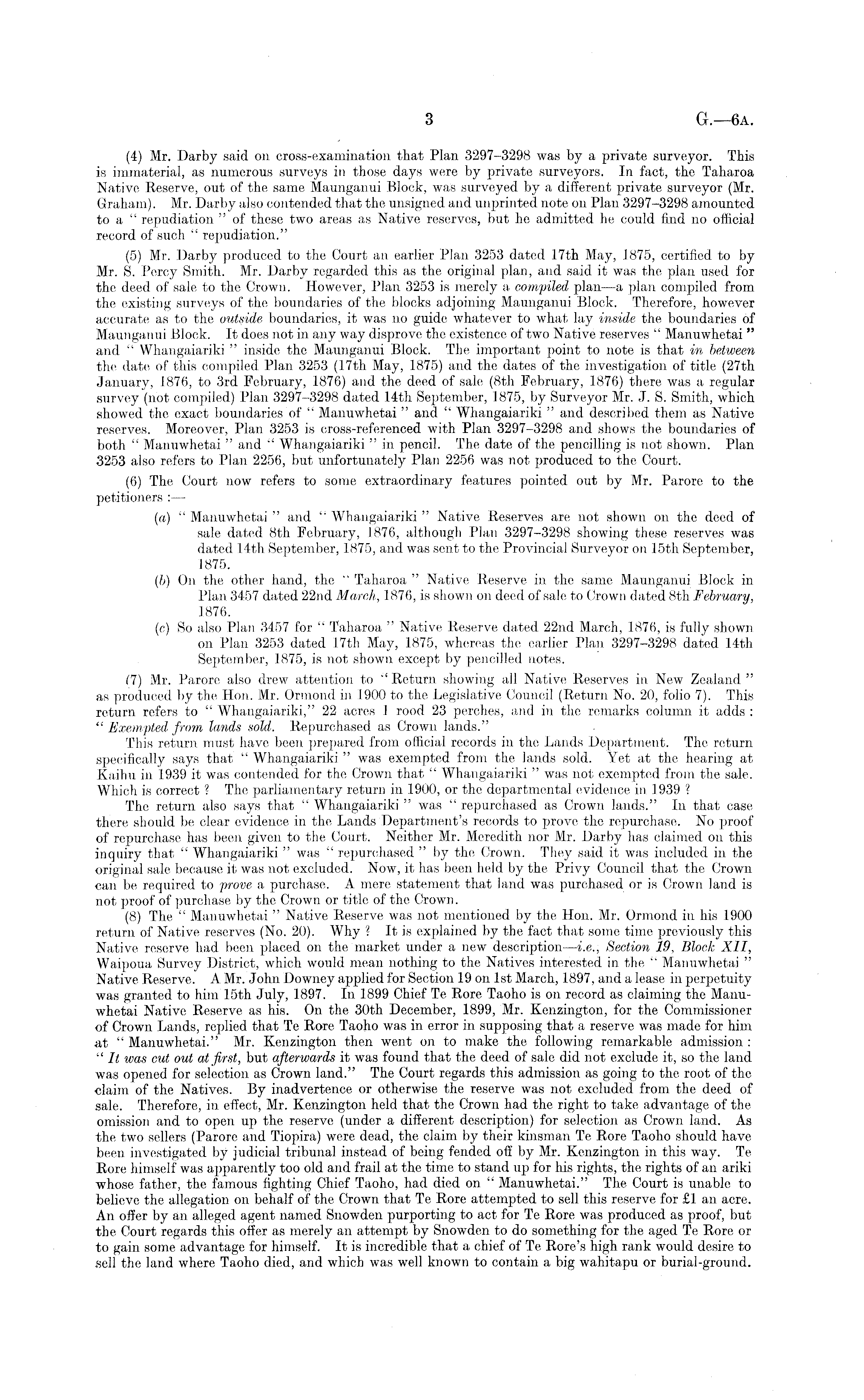 (4) Mr. Darby said on cross-examination that Plan 3297-3298 was by a private surveyor. This is immaterial, as numerous surveys in those days were by private surveyors. In fact, the Taharoa Native Reserve, out of the same Maunganui Block, was surveyed by a different private surveyor (Mr. Graham). Mr. Darby also contended that the unsigned and unprinted note on Plan 3297-3298 amounted to a " repudiation " of these two areas as Native reserves, but he admitted he could find no official record of such " repudiation." (5) Mr. Darby produced to the Court an earlier Plan 3253 dated 17th May, 1875, certified to by Mr. S. Percy Smith. Mr. Darby regarded this as the original plan, and said it was the plan used for the deed of sale to the Crown. However, Plan 3253 is merely a compiled plan —a plan compiled from the existing surveys of the boundaries of the blocks adjoining Maunganui Block. Therefore, however accurate as to the outside boundaries, it was no guide whatever to what lay inside the boundaries of Maunganui Block. It does not in any way disprove the existence of two Native reserves " Manuwhetai " and " Whangaiariki " inside the Maunganui Block. The important point to note is that in between the date of this compiled Plan 3253 (17th May, 1875) and the dates of the investigation of title (27th January, 1876, to 3rd February, 1876) and the deed of sale (Bth February, 1876) there was a regular survey (not compiled) Plan 3297-3298 dated 14th September, 1875, by Surveyor Mr. J. S. Smith, which showed the exact boundaries of " Manuwhetai " and " Whangaiariki " and described them as Native reserves. Moreover, Plan 3253 is cross-referenced with Plan 3297-3298 and shows the boundaries of both " Manuwhetai " and " Whangaiariki "in pencil. The date of the pencilling is not shown. Plan 3253 also refers to Plan 2256, but unfortunately Plan 2256 was not produced to the Court. (6) The Court now refers to some extraordinary features pointed out by Mr. Parore to the petitioners : — (а) " Manuwhetai " and " Whangaiariki " Native Reserves are not shown on the deed of sale dated Bth February, 1876, although Plan 3297-3298 showing these reserves was dated 14th September, 1875, and was sent to the Provincial Surveyor on 15th September, 1875. (б) On the other hand, the " Taharoa " Native Reserve in the same Maunganui Block in Plan 3457 dated 22nd March, 1876, is shown on deed of sale to Crown dated Bth February, 1876. (c) So also Plan 3457 for " Taharoa " Native Reserve dated 22nd March, 1876, is fully shown on Plan 3253 dated 17th May, 1875, whereas the earlier Plan 3297-3298 dated 14th September, 1875, is not shown except by pencilled notes. (7) Mr. Parore also drew attention to "Return showing all Native Reserves in New Zealand " as produced by the Hon. Mr. Ormond in 1900 to the Legislative Council (Return No. 20, folio 7). This return refers to " Whangaiariki," 22 acres 1 rood 23 perches, and in the remarks column it adds : " Exempted from lands sold. Repurchased as Crown lands." This return must have been prepared from official records in the Lands Department. The return specifically says that " Whangaiariki " was exempted from the lands sold. Yet at the hearing at Kaihu in 1939 it was contended for the Crown that " Whangaiariki " was not exempted from the sale. Which is correct ? The parliamentary return in 1900, or the departmental evidence in 1939 ? The return also says that " Whangaiariki " was " repurchased as Crown lands." In that case there should be clear evidence in the Lands Department's records to prove the repurchase. No proof of repurchase has been given to the Court. Neither Mr. Meredith nor Mr. Darby has claimed on this inquiry that " Whangaiariki " was " repurchased "by the Crown. They said it was included in the original sale because it was not excluded. Now, it has been held by the Privy Council that the Crown can be required to prove a purchase. A mere statement that land was purchased or is Crown land is not proof of purchase by the Crown or title of the Crown. (8) The " Manuwhetai " Native Reserve was not mentioned by the Hon. Mr. Ormond in his 1900 return of Native reserves (No. 20). Why ? It is explained by the fact that some time previously this Native reserve had been placed on the market under a new description —-i.e., Section 19, Block XII, Waipoua Survey District, which would mean nothing to the Natives interested in the " Manuwhetai " Native Reserve. A Mr. John Downey applied for Section 19 on Ist March, 1897, and a lease in perpetuity was granted to him 15th July, 1897. In 1899 Chief Te Rore Taoho is on record as claiming the Manuwhetai Native Reserve as his. On the 30th December, 1899, Mr. Kenzington, for the Commissioner of Crown Lands, replied that Te Rore Taoho was in error in supposing that a reserve was made for him at " Manuwhetai." Mr. Kenzington then went on to make the following remarkable admission : " It was cut out at first, but afterwards it was found that the deed of sale did not exclude it, so the land was opened for selection as Crown land." The Court regards this admission as going to the root of the claim of the Natives. By inadvertence or otherwise the reserve was not excluded from the deed of sale. Therefore, in effect, Mr. Kenzington held that the Crown had the right to take advantage of the omission and to open up the reserve (under a different description) for selection as Crown land. As the two sellers (Parore and Tiopira) were dead, the claim by their kinsman Te Rore Taoho should have been investigated by judicial tribunal instead of being fended off by Mr. Kenzington in this way. Te Rore himself was apparently too old and frail at the time to stand up for his rights, the rights of an ariki whose father, the famous fighting Chief Taoho, had died on " Manuwhetai." The Court is unable to believe the allegation on behalf of the Crown that Te Rore attempted to sell this reserve for £1 an acre. An offer by an alleged agent named Snowden purporting 