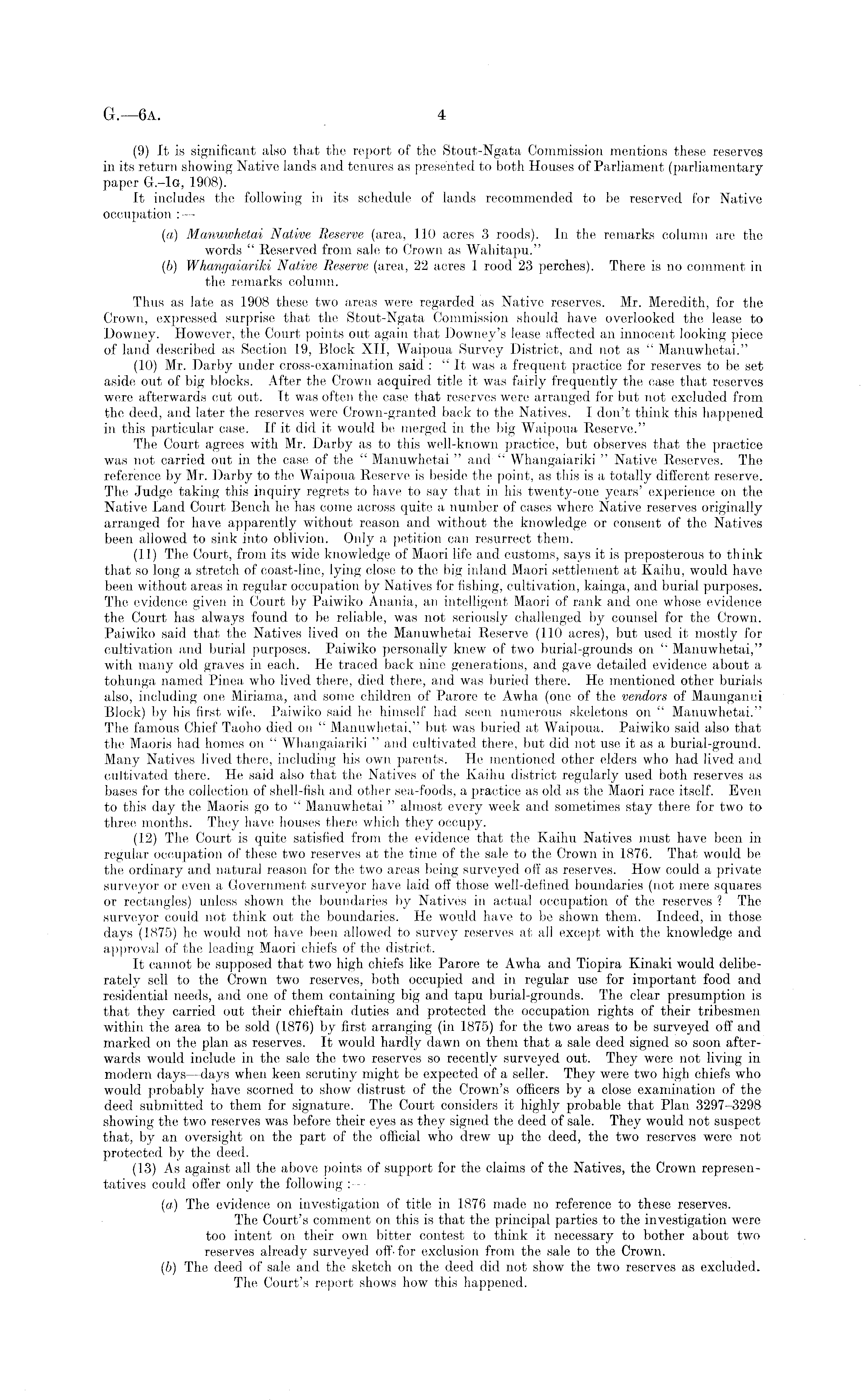 (9) It is significant also that the report of the Stout-Ngata Commission mentions these reserves in its return showing Native lands and tenures as presented to both Houses of Parliament (parliamentary paper G.-Ig, 1908). It includes the following in its schedule of lands recommended to be reserved for Native occupation : — (a) Manuwhetai Native Reserve (area, 110 acres 3 roods). In the remarks column are the words " Reserved from sale to Crown as Wahitapu." (b) W hant/aiariki Native Reserve (area, 22 acres 1 rood 23 perches). There is no comment in the remarks column. Thus as late as 1908 these two areas were regarded as Native reserves. Mr. Meredith, for the Crown, expressed surprise that the Stout-Ngata Commission should have overlooked the lease to Downey. However, the Court points out again that Downey's lease affected an innocent looking piece of land described as Section 19, Block XII, Waipoua Survey District, and not as " Manuwhetai." (10) Mr. Darby under cross-examination said : "It was a frequent practice for reserves to be set aside out of big blocks. After the Crown acquired title it was fairly frequently the case that reserves were afterwards cut out. It was often the case that reserves were arranged for but not excluded from the deed, and later the reserves were Crown-granted back to the Natives. I don't think this happened in this particular case. If it did it would be merged in the big Waipoua Reserve." The Court agrees with Mr. Darby as to this well-known practice, but observes that the practice was not carried out in the case of the " Manuwhetai " and " Whangaiariki " Native Reserves. The reference by Mr. Darby to the Waipoua Reserve is beside the point, as this is a totally different reserve. The Judge taking this inquiry regrets to have to say that in his twenty-one years' experience on the Native Land Court Bench he has come across quite a number of cases where Native reserves originally arranged for have apparently without reason and without the knowledge or consent of the Natives been allowed to sink into oblivion. Only a petition can resurrect them. (11) The Court, from its wide knowledge of Maori life and customs, says it is preposterous to think that so long a stretch of coast-line, lying close to the big inland Maori settlement at Kaihu, would have been without areas in regular occupation by Natives for fishing, cultivation, kainga, and burial purposes. The evidence given in Court by Paiwiko Anania, an intelligent Maori of rank and one whose evidence the Court has always found to be reliable, was not seriously challenged by counsel for the Crown. Paiwiko said that the Natives lived on the Manuwhetai Reserve (110 acres), but used it mostly for cultivation and burial purposes. Paiwiko personally knew of two burial-grounds on " Manuwhetai," with many old graves in each. He traced back nine generations, and gave detailed evidence about a tohunga named Pinea who lived there, died there, and was buried there. He mentioned other burials also, including one Miriama, and some children of Parore te Awha (one of the vendors of Maunganui Block) by his first wife. Paiwiko said he himself had seen numerous skeletons on " Manuwhetai." The famous Chief Taoho died on " Manuwhetai," but was buried at Waipoua. Paiwiko said also that the Maoris had homes on " Whangaiariki " and cultivated there, but did not use it as a burial-ground. Many Natives lived there, including his own parents. He mentioned other elders who had lived and cultivated there. He said also that the Natives of the Kaihu district regularly used both reserves as bases for the collection of shell-fish and other sea-foods, a practice as old as the Maori race itself. Even to this day the Maoris go to " Manuwhetai " almost every week and sometimes stay there for two to three months. They have houses there which they occupy. (12) The Court is quite satisfied from the evidence that the Kaihu Natives must have been in regular occupation of these two reserves at the time of the sale to the Crown in 1876. That would be the ordinary and natural reason for the two areas being surveyed off as reserves. How could a private surveyor or even a Government surveyor have laid off those well-defined boundaries (not mere squares or rectangles) unless shown the boundaries by Natives in actual occupation of the reserves ? The surveyor could not think out the boundaries. He would have to be shown them. Indeed, in those days (1875) he would not have been allowed to survey reserves at all except with the knowledge and approval of the leading Maori chiefs of the district. It cannot be supposed that two high chiefs like Parore te Awha and Tiopira Kinaki would deliberately sell to the Crown two reserves, both occupied and in regular use for important food and residential needs, and one of them containing big and tapu burial-grounds. The clear presumption is that they carried out their chieftain duties and protected the occupation rights of their tribesmen within the area to be sold (1876) by first arranging (in 1875) for the two areas to be surveyed off and marked on the plan as reserves. It would hardly dawn on them that a sale deed signed so soon afterwards would include in the sale the two reserves so recently surveyed out. They were not living in modern days —days when keen scrutiny might be expected of a seller. They were two high chiefs who would probably have scorned to show distrust of the Crown's officers by a close examination of the deed submitted to them for signature. The Court considers it highly probable that Plan 3297-3298 showing the two reserves was before their eyes as they signed the deed of sale. They would not suspect that, by an oversight on the part of the official who drew up the deed, the two reserves were not protected by the deed. (13) As against all the above points of support for the claims of the Natives, the Crown representatives could offer only the following ■ (a) The evidence on investigation of title 
