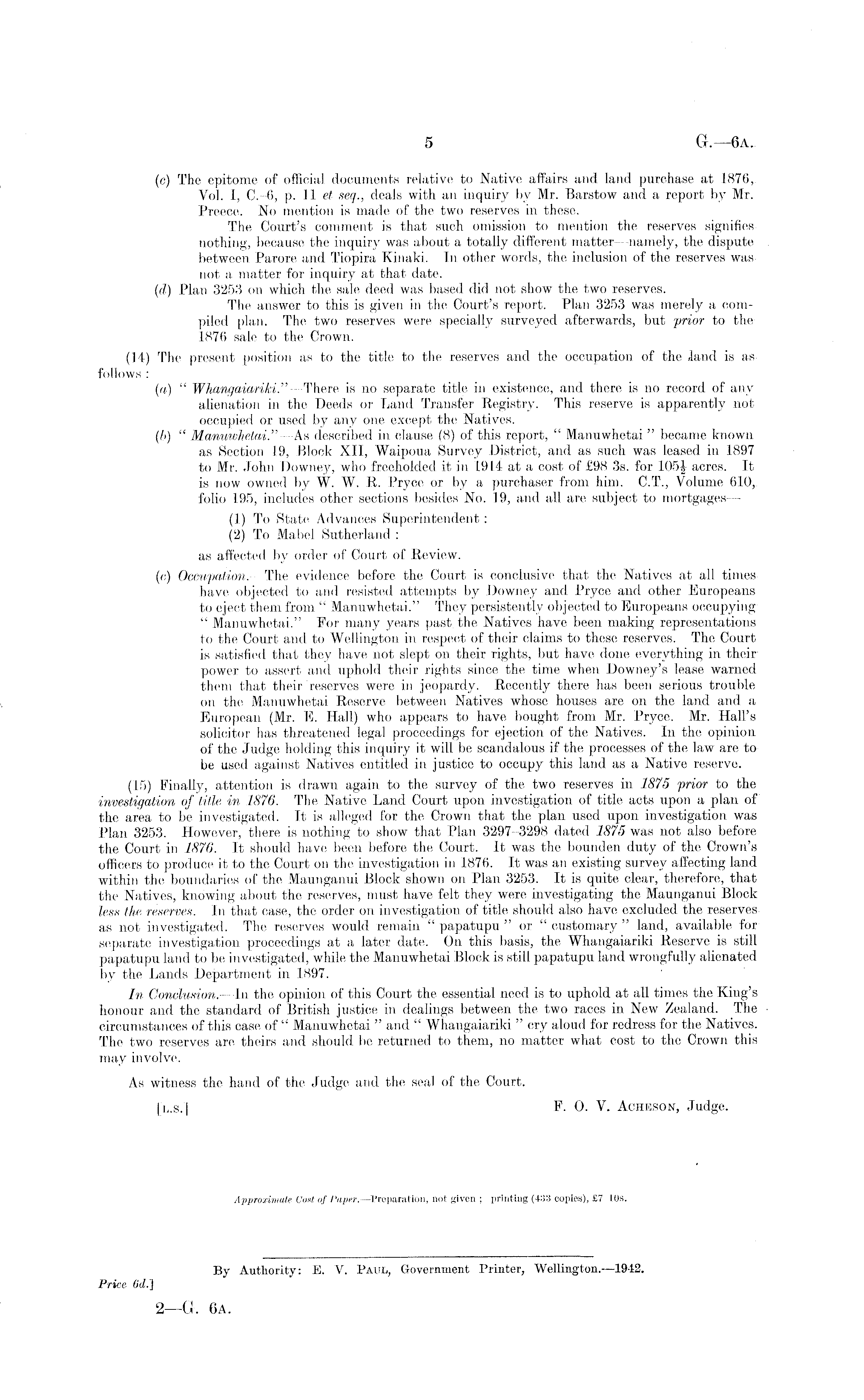 (c) The epitome of official, documents relative to Native affairs and land purchase at 1876, Vol. I, C.-6, p. 11 et seq., deals with an inquiry by Mr. Barstow and a report by Mr. Preece. No mention is made of the two reserves in these. The Court's comment is that such omission to mention the reserves signifies nothing, because the inquiry was about a totally different matter—namely, the dispute between Parore and Tiopira Kinaki. In other words, the inclusion of the reserves was not a matter for inquiry at that date. (d) Plan 3253 on which the sale deed was based did not show the two reserves. The answer to this is given in the Court's report. Plan 3253 was merely a compiled plan. The two reserves were specially surveyed afterwards, but prior to the 1876 sale to the Crown. (14) The present position as to the title to the reserves and the occupation of the .land is as follows : (a) " Whangaiariki."—There is no separate title in existence, and there is no record of any alienation in the Deeds or Land Transfer Registry. This reserve is apparently not occupied or used by any one except the Natives. (/>) " Manuwhetai."—As described in clause (8) of this report, " Manuwhetai " became known as Section 19, Block XII, Waipoua Survey District, and as such was leased in 1897 to Mr. John Downey, who freeholded it in 1914 at a cost of £98 3s. for 105§ acres. It is now owned by W. W. R. Pryce or. by a purchaser from him. C.T., Volume 610, folio 195, includes other sections besides No. 19, and all are subject to mortgages — (1) To State Advances Superintendent: (2) To Mabel Sutherland : as affected by order of Court of Review. (c) Occupation. The evidence before the Court is conclusive that the Natives at all times have objected to and resisted attempts by Downey and Pryce and other Europeans to eject them from " Manuwhetai." They persistently objected to Europeans occupying " Manuwhetai." For many years past the Natives have been making representations to the Court and to Wellington in respect of their claims to these reserves. The Court is satisfied that they have not slept on their rights, but have done everything in their power to assert and uphold their rights since the time when Downey's lease warned them that their reserves were in jeopardy. Recently there has been serious trouble on the Manuwhetai Reserve between Natives whose houses are on the land and a European (Mr. E. Hall) who appears to have bought from Mr. Pryce. Mr. Hall's solicitor has threatened legal proceedings for ejection of the Natives. In the opinion of the Judge holding this inquiry it will be scandalous if the processes of the law are to be used against Natives entitled in justice to occupy this land as a Native reserve. (15) Finally, attention is drawn again to the survey of the two reserves in 1875 prior to the investigation of title in 1876. The Native Land Court upon investigation of title acts upon a plan of the area to be investigated. It is alleged for the Crown that the plan used upon investigation was Plan 3253. However, there is nothing to show that Plan 3297-3298 dated 1875 was not also before the Court in 1876. It should have been before the Court. It was the bounden duty of the Crown's officers to produce it to the Court on the investigation in 1876. It was an existing survey affecting land within the boundaries of the Maunganui Block shown on Plan 3253. It is quite clear, therefore, that the Natives, knowing about the reserves, must have felt they were investigating the Maunganui Block less the reserves. In that case, the order on investigation of title should also have excluded the reserves as not investigated. The reserves would remain " papatupu " or " customary " land, available for separate investigation proceedings at a later date. On this basis, the Whangaiariki Reserve is still papatupu land to be investigated, while the Manuwhetai Block is still papatupu land wrongfully alienated by the Lands Department in 1897. In Conclusion. —In the opinion of this Court the essential need is to uphold at all times the King's honour and the standard of British justice in dealings between the two races in New Zealand. The circumstances of this case of " Manuwhetai " and " Whangaiariki " cry aloud for redress for the Natives. The two reserves are theirs and should be returned to them, no matter what cost to the Crown this may involve. As witness the hand of the Judge and the seal of the Court. [l.s. | F. 0. V. Achisson, Judge. Approximate Cost of Paper.—Preparation, not given ; printing (433 copies), £7 10s.