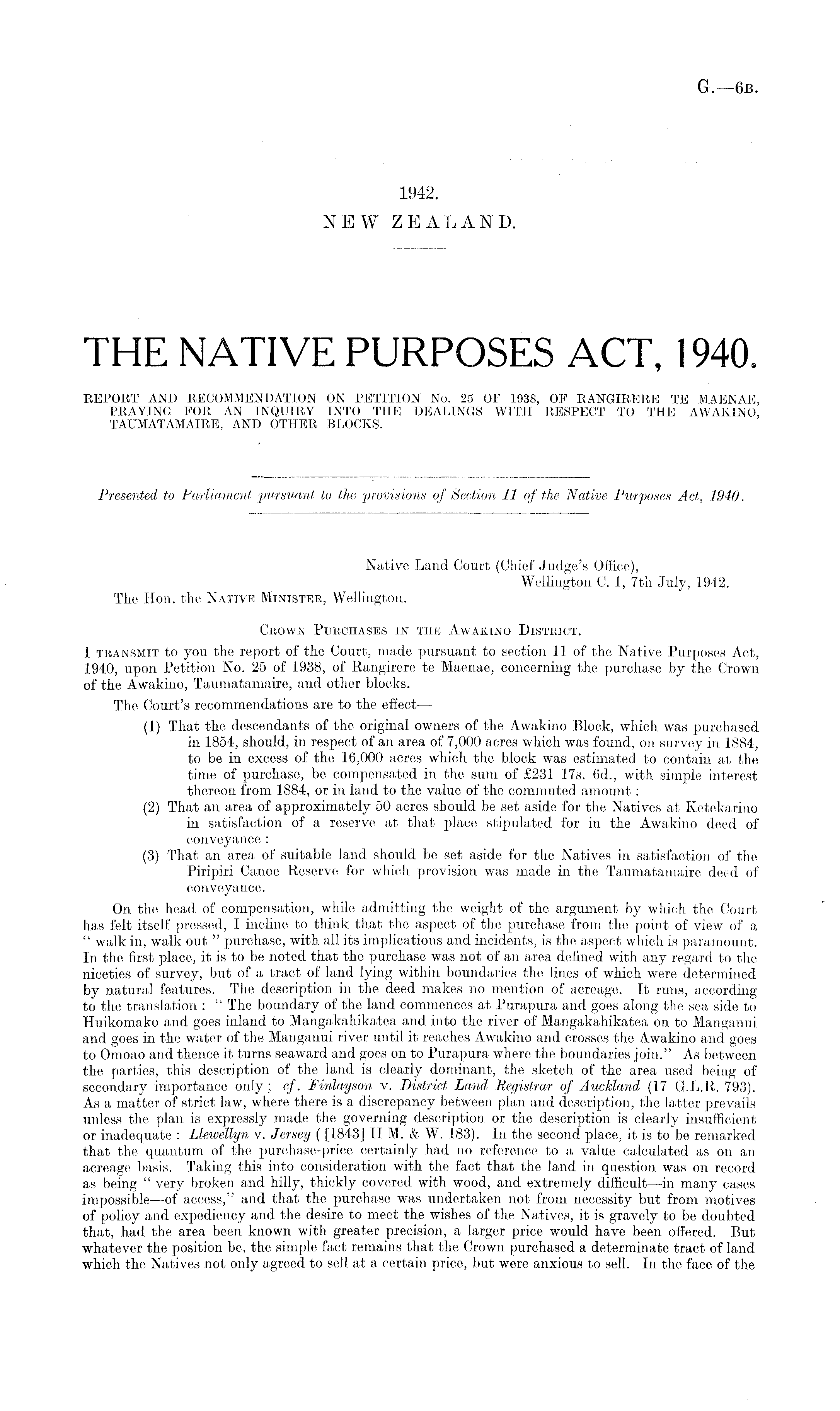 THE NATIVE PURPOSES ACT, 1940. REPORT AND RECOMMENDATION ON PETITION No. 25 OF 1938, OF RANGIRERE TE MAENAE, PRAYING FOR AN INQUIRY INTO THE DEALINGS WITH RESPECT TO THE AWAKINO, TAUMATAMAIRE, AND OTHER BLOCKS.