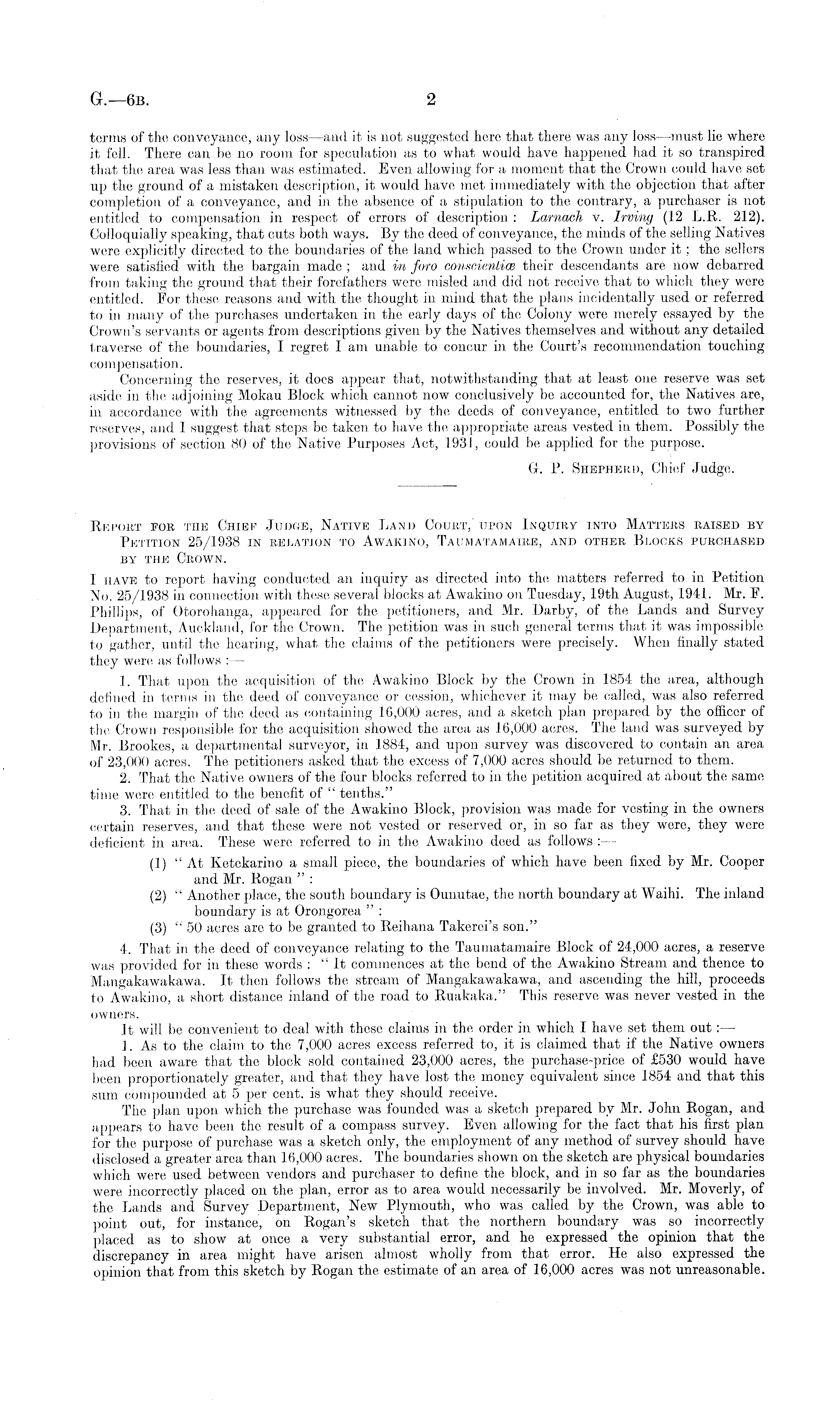 terms of the conveyance, any loss—and it is not suggested here that there was any loss —must lie where it fell. There can be no room for speculation as to what would have happened had it so transpired that the area was less than was estimated. Even allowing for a moment that the Crown could have set up the ground of a mistaken description, it would have met immediately with the objection that after completion of a conveyance, and in the absence of a stipulation to the contrary, a purchaser is not entitled to compensation in respect of errors of description : Larnacli v. Irving (12 L.R. 212). Colloquially speaking, that cuts both ways. By the deed of conveyance, the minds of the selling Natives were explicitly directed to the boundaries of the land which passed to the Crown under it ; the sellers were satisfied with the bargain made ; and in foro conscientice their descendants are now debarred from taking the ground that their forefathers were misled and did not receive that to which they were entitled. For these reasons and with the thought in mind that the plans incidentally used or referred to in many of the purchases undertaken in the early days of the Colony were merely essayed by the Crown's servants or agents from descriptions given by the Natives themselves and without any detailed traverse of the boundaries, I regret I am unable to concur in the Court's recommendation touching compensation. Concerning the reserves, it does appear that, notwithstanding that at least one reserve was set aside in the adjoining Mokau Block which cannot now conclusively be accounted for, the Natives are, in accordance with the agreements witnessed by the deeds of conveyance, entitled to two further reserves, and I suggest that steps be taken to have the appropriate areas vested in them. Possibly the provisions of section 80 of the Native Purposes Act, 1931, could be applied for the purpose. G. P. Shepherd, Chief Judge. Report for the Chief Judge, Native Land Court,' upon Inquiry into Matters raised by Petition 25/1938 in relation to Awakino, Taumatamaire, and other Blocks purchased by the Crown. I have to report having conducted an inquiry as directed into the matters referred to in Petition No. 25/1938 in connection with these several blocks at Awakino on Tuesday, 19th August, 1941. Mr. F. Phillips, of Otorohanga, appeared for the petitioners, and Mr. Darby, of the Lands and Survey Department, Auckland, for the Crown. The petition was in such general terms thjat it was impossible to gather, until the hearing, what the claims of the petitioners were precisely. When finally stated they were as follows : — 1. That upon the acquisition of the Awakino Block by the Crown in 1854 the area, although defined in terms in the deed of conveyance or cession, whichever it may be called, was also referred to in the margin of the deed as containing 16,000 acres, and a sketch plan prepared by the officer of the Crown responsible for the acquisition showed the area as 16,000 acres. The land was surveyed by Mr. Brookes, a departmental surveyor, in 1884, and upon survey was discovered to contain an area of 23,000 acres. The petitioners asked that the excess of 7,000 acres should be returned to them. 2. That the Native owners of the four blocks referred to in the petition acquired at about the same time were entitled to the benefit of " tenths." 3. That in the deed of sale of the Awakino Block, provision was made for vesting in the owners certain reserves, and that these were not vested or reserved or, in so far as they were, they were deficient in area. These were referred to in the Awakino deed as follows (1) " At Ketekarino a small piece, the boundaries of which have been fixed by Mr. Cooper and Mr. Rogan " : (2) " Another place, the south boundary is Ounutae, the north boundary at Waihi. The inland boundary is at Orongorea " : (3) " 50 acres are to be granted to Reihana Takerei's son." 4. That in the deed of conveyance relating to the Taumatamaire Block of 24,000 acres, a reserve was provided for in these words : " It commences at the bond of the Awakino Stream and thence to Mangakawakawa. It then follows the stream of Mangakawakawa, and ascending the hill, proceeds to Awakino, a short distance inland of the road to Ruakaka." This reserve was never vested in the owners. It will be convenient to deal with these claims in the order in which I have set them out: — 1. As to the claim to the 7,000 acres excess referred to, it is claimed that if the Native owners had been aware that the block sold contained 23,000 acres, the purchase-price of £530 would have been proportionately greater, and that they have lost the money equivalent since 1854 and that this sum compounded at 5 per cent, is what they should receive. The plan upon which the purchase was founded was a sketch prepared by Mr. John Rogan, and appears to have been the result of a compass survey. Even allowing for the fact that his first plan for the purpose of purchase was a sketch only, the employment of any method of survey should have disclosed a greater area than 16,000 acres. The boundaries shown on the sketch are physical boundaries which were used between vendors and purchaser to define the block, and in so far as the boundaries were incorrectly placed on the plan, error as to area would necessarily be involved. Mr. Moverly, of the Lands and Survey Department, New Plymouth, who was called by the Crown, was able to point out, for instance, on Rogan's sketch that the northern boundary was so incorrectly placed as to show at once a very substantial error, and he expressed the opinion that the discrepancy in area might have arisen almost wholly from that error. He also expressed the opinion that from this sketch by Rogan the estimate of an area of 16,000 acres was not unreasonable.