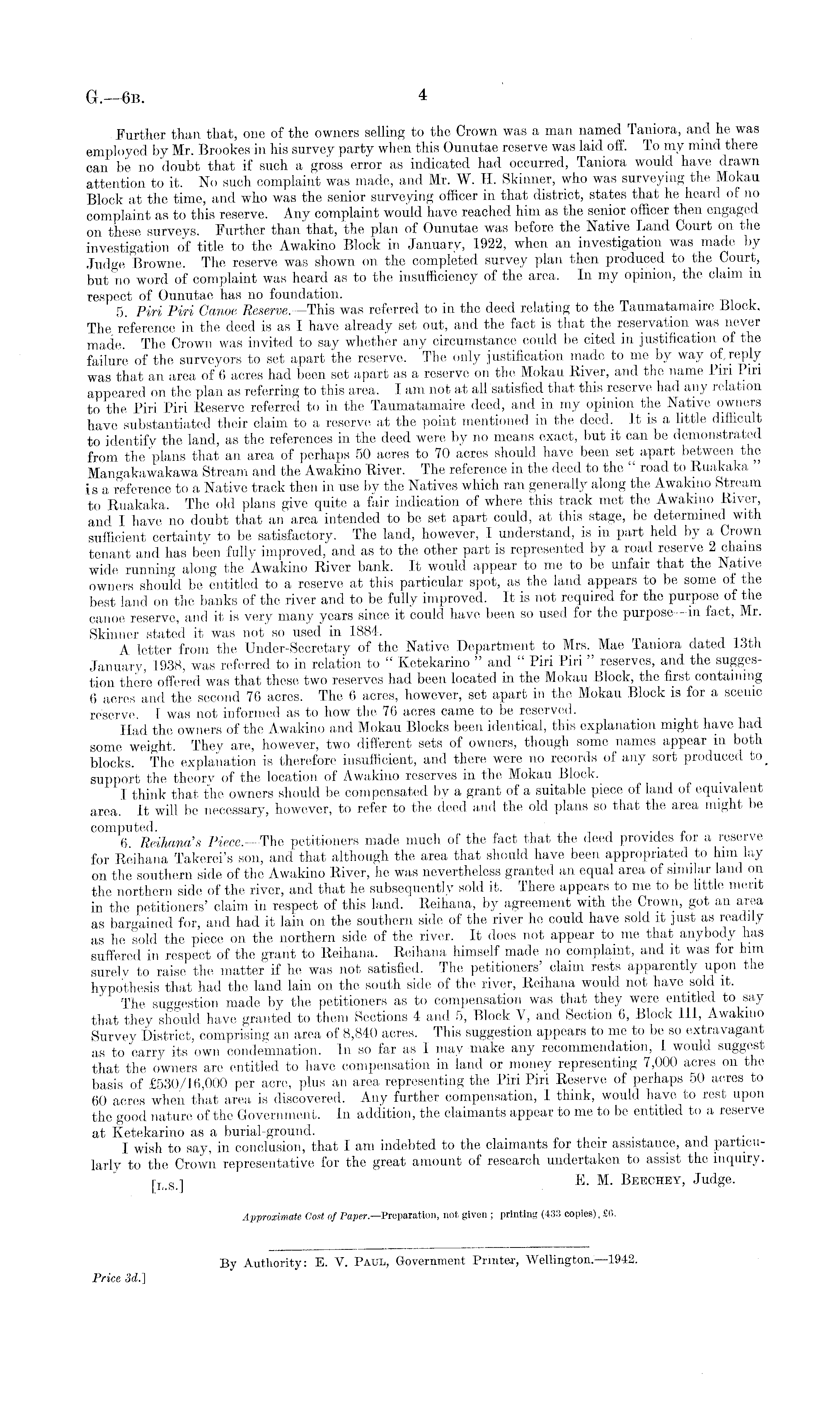 Further than that, one of the owners selling to the Crown was a man named Taniora, and he was employed by Mr. Brookes in his survey party when this Ounutae reserve was laid off. To my mind there can be no doubt that if such a gross error as indicated had occurred, Taniora would have drawn attention to it. No such complaint was made, and Mr. W. H. Skinner, who was surveying the Mokau Block at the time, and who was the senior surveying officer in that district, states that he heard of no complaint as to this reserve. Any complaint would have reached him as the senior officer then engaged on these surveys. Further than that, the plan of Ounutae was before the Native Land Court on the investigation of title to the Awakino Block in January, 1922, when an investigation was made by Judge Browne. The reserve was shown on the completed survey plan then produced to the Court, but no word of complaint was heard as to the insufficiency of the area. In my opinion, the claim in respect of Ounutae has no foundation. m | 5. Piri Piri Canoe Reserve. —This was referred to in the deed relating to the Taumatamaire. Block, The reference in the deed is as I have already set out, and the fact is that the reservation was never made. The Crown was invited to say whether any circumstance could be cited in justification of the failure of the surveyors to set apart the reserve. The only justification made to me by way of, reply was that an area of 6 acres had been set apart as a reserve on the Mokau River, and the name Piri Piri appeared on the plan as referring to this area. lam not at all satisfied that this reserve had any relation to the Piri Piri Reserve referred to in the Taumatamaire deed, and in iny opinion the Native owners have substantiated their claim to a reserve at the point mentioned in the deed. It is a little difficult to identify the land, as the references in the deed were by no means exact, but it can be demonstrated from the plans that an area of perhaps 50 acres to 70 acres should have been set apart between the Mangakawakawa Stream and the Awakino River. The reference in the deed to the " road to Ruakaka is a reference to a Native track then in use by the Natives which ran generally along the Awakino Stream to Ruakaka. The old plans give quite a fair indication of where this track met the Awakino River, and I have no doubt that an area intended to be set apart could, at this stage, be determined with sufficient certaintv to be satisfactory. The land, however, I understand, is in part held by a Crown tenant and has been fully improved, and as to the other part is represented by a road reserve 2 chains wide running along the Awakino River bank. It would appear to me to be unfair that the Native owners should be entitled to a reserve at this particular spot, as the land appears to be some of the best land on the banks of the river and to be fully improved. It is not required for the purpose of the canoe reserve, and it is very many years since it could have been so used for the purpose—in fact, Mr. Skinner stated it was not so used" in 1884. A letter from the Under-Secretary of the Native Department to Mrs. Mae lamora dated 13th January, 1938, was referred to in relation to " Ketekarino " and " Piri Piri " reserves, and the suggestion there offered was that these two reserves had been located in the Mokau Block, the first containing 6 acres and the second 76 acres. The 6 acres, however, set apart in the Mokau Block is for a scenic reserve. I was not informed as to how the 76 acres came to be reserved. Had the owners of the Awakino and Mokau Blocks been identical, this explanation might have had some weight. They are, however, two different sets of owners, though some names appear in both blocks. The explanation is therefore insufficient, and there were no records of any sort produced to_ support the theory of the location of Awakino reserves in the Mokau Block. I think that the owners should be compensated by a grant of a suitable piece of land of equivalent area. It will be necessary, however, to refer to the deed and the old plans so that the area might be computed. . . 6. Reihana's Piece.-The petitioners made much of the fact that the deed provides lor a reserve for Reihana Takerei's son, and that although the area that should have been appropriated to him lay on the southern side of the Awakino River, he was nevertheless granted an equal area of similar land on the northern side of the river, and that he subsequently sold it. There appears to me to be little merit in the petitioners' claim in respect of this land. Reihana, by agreement with the Crown, got an area as bargained for, and had it lain on the southern side of the river he could have sold it ]ust as readily as he sold the piece on the northern side of the river. It does not appear to me that anybody has suffered in respect of the grant to Reihana. Eeihana himself made no complaint, and it was for him surely to raise the matter if he was not satisfied. The petitioners claim rests apparently upon the hypothesis that had the land lain on. the south side of the river, Reihana would not have sold it. The suggestion made by the petitioners as to compensation was that they were entitled to say that they should have granted to them Sections 4 and 5, Block V, and Section 6, Block 111, Awakino Survey District, comprising an area of 8,840 acres. This suggestion appears to me to be so extravagant as to carry its own condemnation. In so far as I may make any recommendation, 1 would suggest that the owners are entitled to have compensation in land or money representing 7,000 acres on the basis of £530/16,000 per acre, plus an area representing the Piri Piri Reserve of perhaps 50 acres to 60 acres when that area is discovered. Any further compensation, I think, would have to rest upon the good nature of the Government. In addition, the claimants appear to me to be entitled to a reserve at Ketekarino as a burial-ground. _ ... ~ I wish to say,