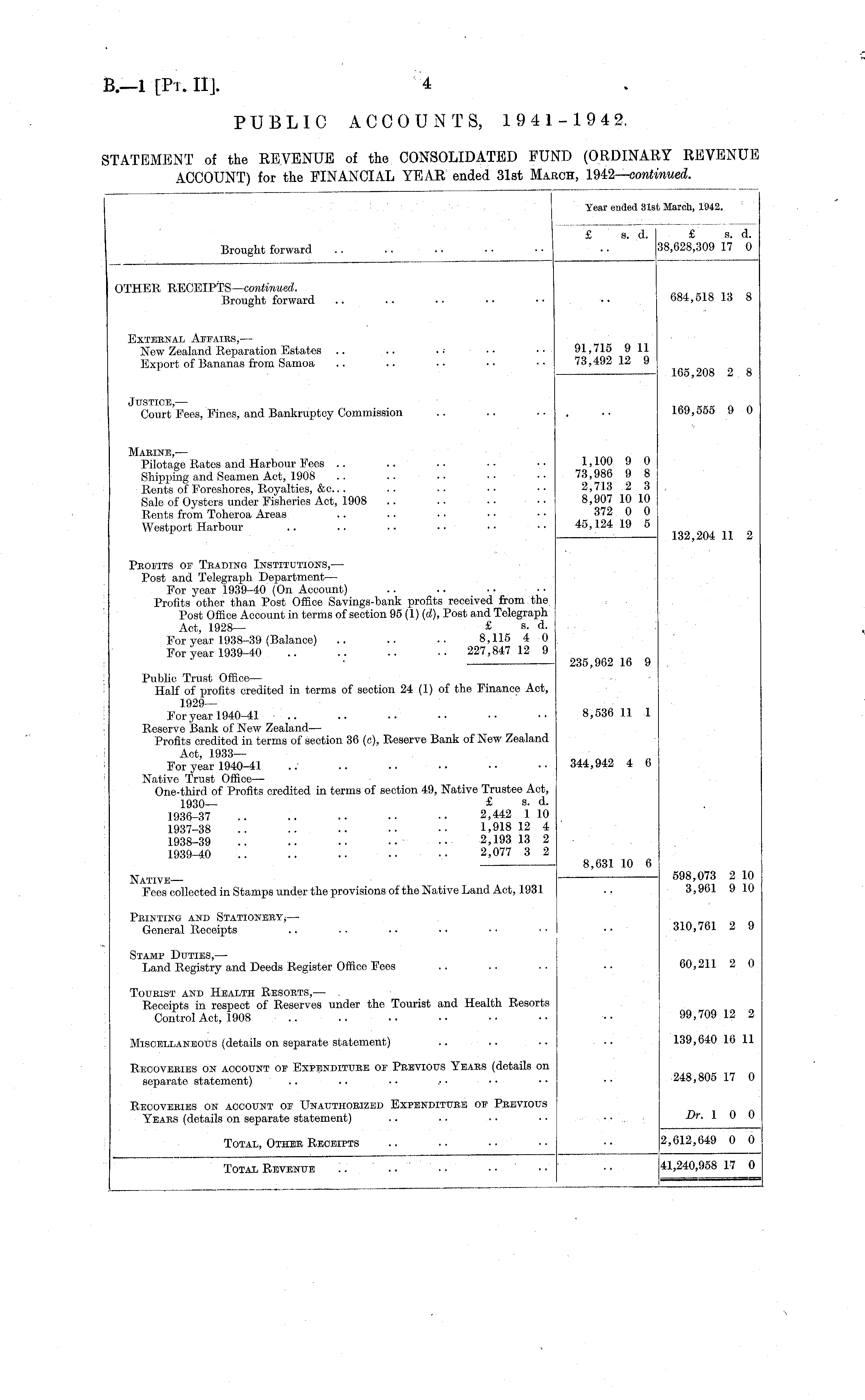 Year ended 81st March, 1942. £ s. d. £ s. d. Brought forward .. .. • • • ■ ■ • • • 38,628,309 17 0 OTHER RECEIPTS —continued. Brought forward .. .. .. •• •• •• 684,518 13 8 External Affairs, — New Zealand Reparation Estates .. .. . •• 91,715 9 11 Export of Bananas from Samoa .. .. •• 73,492 12 9 1 165,208 2 8 Justice,— Court Fees, Pines, and Bankruptcy Commission .. .. •• .. 1 by,855 y U Marine, — Pilotage Rates and Harbour Fees .. .. • • • • • • I > 100 9 0 Shipping and Seamen Act, 1908 .. ■■ •• 73,986 9 8 Rents of Foreshores, Royalties, &c... .. ■■ 2,713 2 3 Sale of Oysters under Fisheries Act, 1908 . . . • ■ ■ • • 8,907 10 10 Rents from Toheroa Areas .. . ■ • • • ■ • • 372 0 0 Westport Harbour .. .. •• •• •• •• 45,124 19 5 F 132,204 11 2 Profits of Trading Institutions, —■ Post and Telegraph Department— For year 1939-40 (On Account) Profits other than Post Office Savings-bank profits received from the Post Office Account in terms of section 95 (1) (d), Post and Telegraph Act, 1928— £ a - d - For year 1938-39 (Balance) .. .. •• 8,115 4 0 For year 1939-40 .. .. .. •• 227,847 12 9 235,962 16 9 Public Trust Office— Half of profits credited in terms of section 24 (1) of the Finance Act, 1929— For year 1940-41 .. .. •• •• •• •• 8,536 11 1 Reserve Bank of New Zealand— Profits credited in terms of section 36 (c), Reserve Bank of New Zealand Act, 1933— For year 1940-41 .. .. .. . • •• •• 344,942 4 6 Native Trust Office — One-third of Profits credited in terms of section 49, Native Trustee Act, 1930— £ s. d. 1936-37 .. .. .. •• •• 2,442 1 10 1937-38 .. .. .. •• -• 1,918 12 4 1938-39 .. .. .. •• •• 2,193 13 2 1939-40 2,077 3 2 — 8,631 10 6 Native — 598,073 2 10 Fees collected in Stamps under the provisions of the Native Land Act, 1931 .. 3,961 9 10 Printing and Stationery;— General Receipts .. •• •• 310,761 2 J Stamp Duties, — Land Registry and Deeds Register Office Fees .. •• •• 60,-1120 Tourist and Health Resorts, — Receipts in respect of Reserves under the Tourist and Health Resorts Control Act, 1908 .. .. .. •• •• •• •• 99,709 12 2 Miscellaneous (details on separate statement) .. .. •• ■■ 139,640 16 11 Recoveries on account of Expenditure of Previous Years (details on separate statement) .. .. •• •• 248,805 17 0 Recoveries on account of Unauthorized Expenditure of Previous Years (details on separate statement) .. •. • • • • • ■ Dr. 10 0 Total, Other Receipts .. .. •• •• 2,612,649 0 0 Total Revenue .. .. • ■ ■ ■ • • • ■ 41,240,958 17 0
