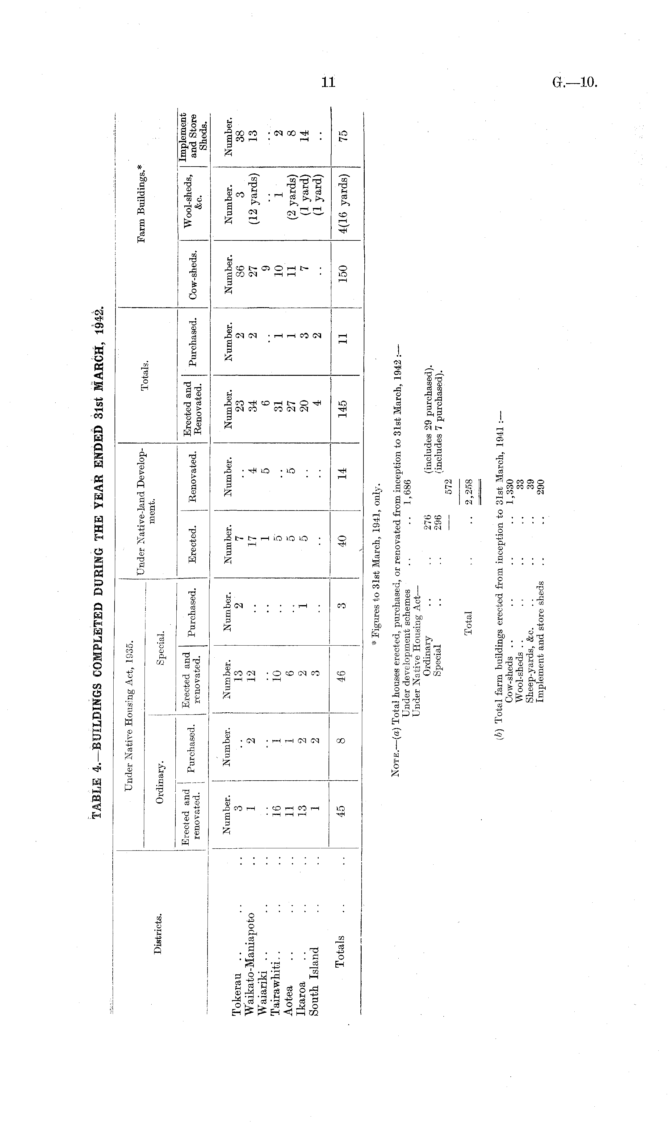 Note.—(a) Tota! houses erected, purchased, or renovated from inception to 31st March, 1942 Under development schemes .. .. 1,686 Under Native Housing Act— Ordinary .. . , 276 (includes 29 purchased). Special .. .. 296 (includes 7 purchased). 572 Total .. 2,258 (b) Total farm buildings erected from inception to 31st March, 1941 :— Cow-sheds .. .. .. 1,330 Wool-sheds .. .. .. .. 33 Sheep-yards, &c. .. .. .. 39 Implement and store sheds .. .. 290