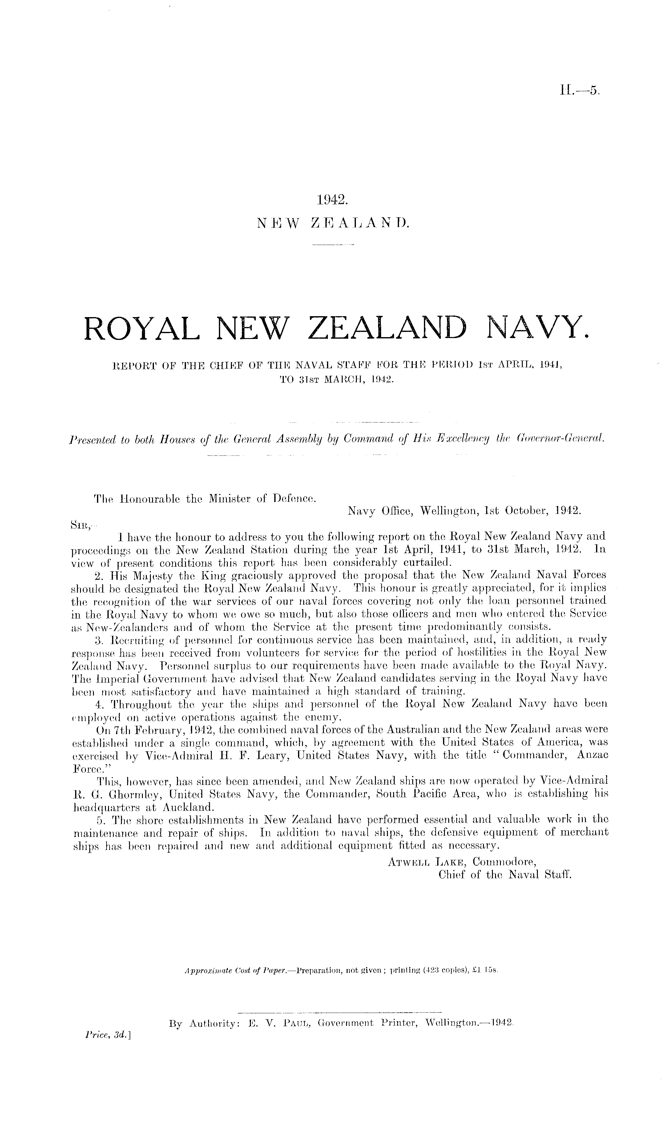 Presented to both Houses of the General Assembly by Command of His Excellency the Governor-General. The Honourable the Minister of Defence. Navy Office, Wellington, Ist October, 1942. Sir, — I have the honour to address to you the following report on the Royal New Zealand Navy and proceedings on the New Zealand Station during the year Ist April, 1941, to 31st March, 1942. In view of present conditions this report has been considerably curtailed. 2. His Majesty the King graciously approved the proposal that the New Zealand Naval Forces should be designated the Royal New Zealand Navy. This honour is greatly appreciated, for it implies the recognition of the war services of our naval forces covering not only the loan personnel trained in the Royal Navy to whom we owe so much, but also those officers and men who entered the Service as New-Zealanders and of whom the Service at the present time predominantly consists. 3. Recruiting of personnel for continuous service has been maintained, and, in addition, a ready response has been received from volunteers for service for the period of hostilities in the Royal New Zealand Navy. Personnel surplus to our requirements have been made available to the Royal Navy. The Imperial Government have advised that New Zealand candidates serving in the Royal Navy have been most satisfactory and have maintained a high standard of training. 4. Throughout the year the ships and personnel of the Royal New Zealand Navy have been employed on active operations against the enemy. On 7th February, 1942, the combined naval forces of the Australian and the New Zealand areas were established under a single command, which, by agreement with the United States of America, was exercised by Vice-Admiral H. F. Leary, United States Navy, with the title " Commander, Anzac Force." This, however, has since been amended, and New Zealand ships are now operated by Vice-Admiral R. G. Ghormley, United States Navy, the Commander, South Pacific Area, who is establishing his headquarters at Auckland. 5. The shore establishments in New Zealand have performed essential and valuable work in the maintenance and repair of ships. In addition to naval ships, the defensive equipment of merchant ships has been repaired and new and additional equipment fitted as necessary. Atwell Lake, Commodore, Chief of the Naval Staff. Approximate Cost of Paper.—Preparation, not given; printing (423 copies), £1 15s.