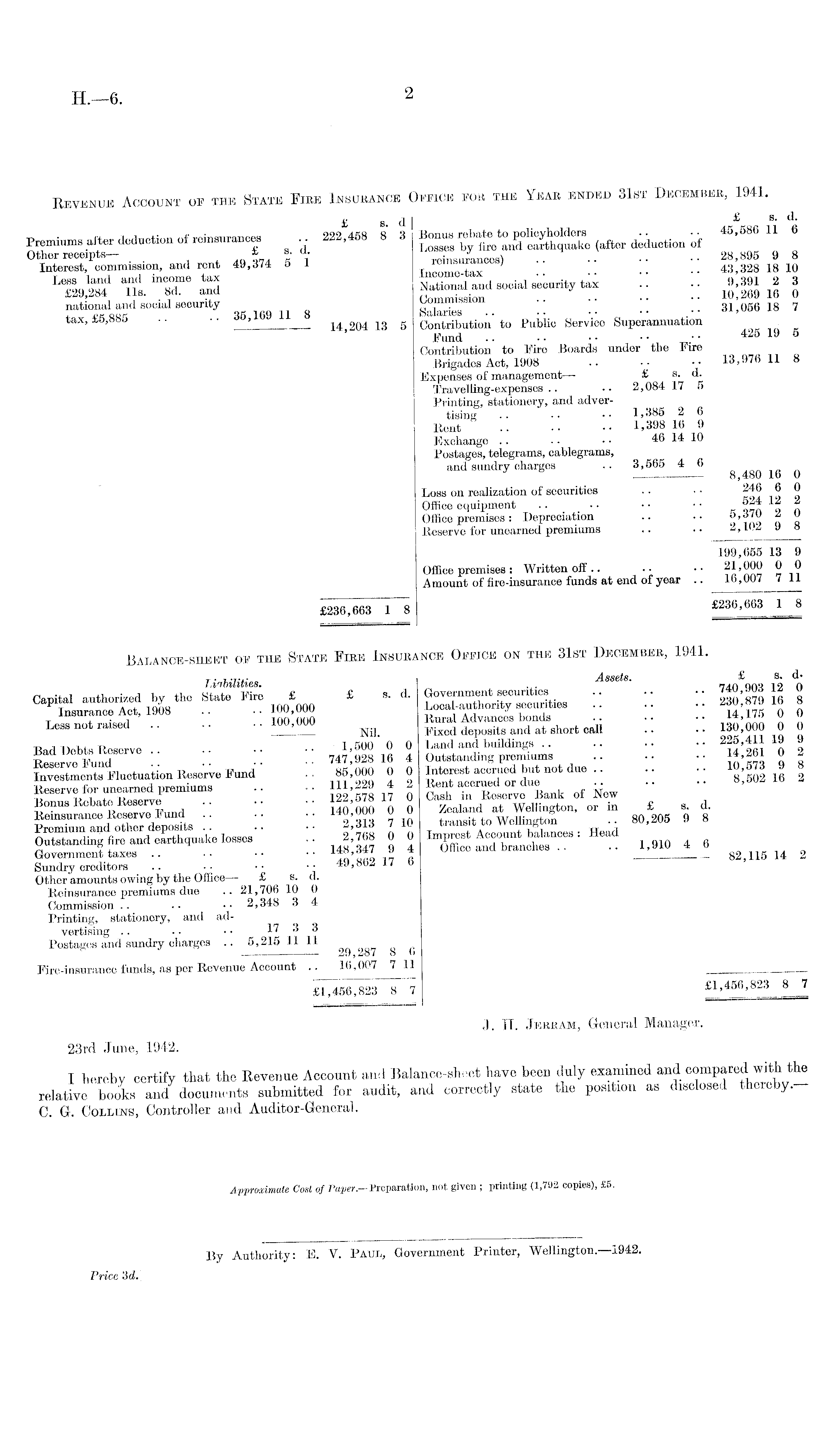 Revenue Accoott ot ran State Fibe Ihsobahcb Oefice fob the Teab ekbsd 31st Decembbb, 1941. .. mm SJ 4S ' 588 " ' °S='—. »j«» d i Sr £.~) .. - ;; ;; Sill? '-iSTi'—s .. .. iSlnational and social security g • • .. .. 31,056 18 7 tax, t0,885 .. •• 14,204 13 5 Contribution to Public Service Superannuation - Fund • • 425 19 5 Contribution to Fire Boards under the Fire Brigades Act, 1908 •• ■■ 13,976 11 8 Expenses of management — £ s. d. Travelling-expenses.. •• 2,084 17 5 Printing, stationery, and advertising .. •• 1.385 2 6 Bent 1,398 16 9 Exchange .. . • • • 46 14 10 Postages, telegrams, cablegrams, and sundry charges .. 3,565 4 6 . —— 8,400 Id U Loss on realization of securities .. • ■ 246 6 0 Office equipment .. .. • • • • 7 Office premises: Depreciation .. •• o ino a s Beserve for unearned premiums .. •• 2,1022 J s 199,655 13 9 Office premises : Written off .. •• ?1' 922 S n ? Amount of fire-insurance funds at end of year .. 10,007 7 £236,663 1 8 £236,663 1 8 Balance-sheet or the State Fire Insurance Office on the 31st December, 1941. Liabilities. Assets. 12 0 c n^r^% b 4 th \ stateFire ioo!ooo £ s - d :: :: :: ; T i •„j 100 000 Bural Advances bonds .. •• •• ~! „ , Less not raise .. •• Fixed deposits and at short call .. .. 130,000 0 0 DbMs Reserve •• •• 1,500 0 0 Land and buildings .. .. •• •• 225,<111 19 9 Beserve Fund " 747,928 16 4 Outstanding premiums 14,261 0 2 Fluctuation Beserve Fund ■■ 85,000 (, 0 .! " " " > Beserve for unearned premiums .. .. 11,229 .4 2 Bent accrued «du :: :: :: 140,000 0 0 « * 80 f 205 s 9 d 8 :: jfe .. « ~0.... Government taxes .. •• •• •• x 82,115 14 2 Sundry creditors .. • • • • • • 49,80« 1/ o Other amounts owing by the Office — £ s. d. Beinsurance premiums due .. 21,706 10 0 Commission .. •• 2,348 3 4 Printing, stationery, and advertising .. • • • • 17 3 3 Postages and sundry charges .. 5,215 11 11 — — Zv, Zo7 o D Fire-insurance funds, as per Bevenue Account .. 16,007 711 £1,456,823 8 7 £1,456,823 8 7 J. H. Jerram, General Manager. 23rd June, 1942. I hereby certify that the Revenue Account and Balance-sheet have been duly examined and compared with the relative books and documents submitted for audit, and correctly state the position as disclosed thereby.C. G. Collins, Controller and Auditor-General. Approximate Cost of Paper—Preparation, not given ; printing (1,792 copies), £5.