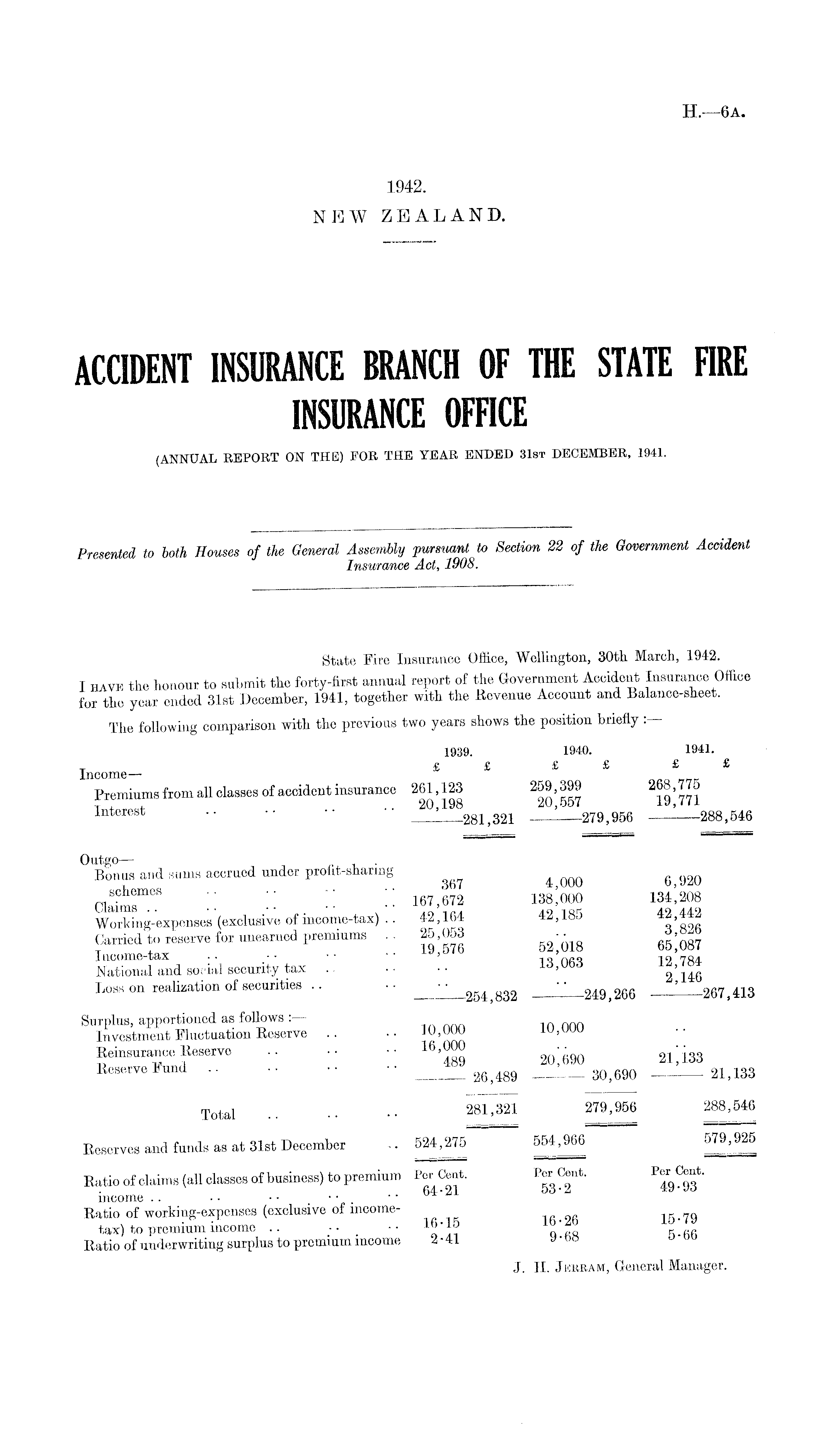 State Fire Insurance Office, Wellington, 30tli March, 194-2. I have the honour to submit the forty-first annual report of the Government Accident Insurance Office for the year ended 31st December, 1941, together with the Revenue Account and Balance-sheet. The following comparison with the previous two years shows the position briefly . 1939. 1940. 1941. T £ £ £ £ £ £ Income — Premiums from all classes of accident insurance 261,123 iq'wi t x, i. 20,iy0 zujODI Interest 281,321 279,956 288,546 Outgo — , . Bonus and sums accrued under profit-sharing nmir 68 !! !! •• ■ • 167,672 138' 000 134',208 Working-expenses (exclusive of income-tax) .. 42,164 42,185 Carried to reserve for unearned premiums .. 25,053 W Income-tax .. •• •• •• iq'arq 19 784 National and social security tax .. •• id.UM Loss on realization of securities .. -• 11-249,266 267,413 Surplus, apportioned as follows Investment Fluctuation Reserve .. •• 10,000 Reinsurance Reserve > " 21 " 133 Reserve Bund 2Mgg > 3 0 690 21133 Total .. •• 281,32 1 279,956 288,546 Reserves and funds as at 31st December 524,275 554,966 079,925 Ratio of claims (all classes of business) to premium Per Cent. income .. • • • • Ratio of working-expenses (exclusive of income- Ifi 26 15-79 tax) to premium income .. •• •• _ fifi Ratio of underwriting surplus to premium income J. H. Jerkam, General Manager.