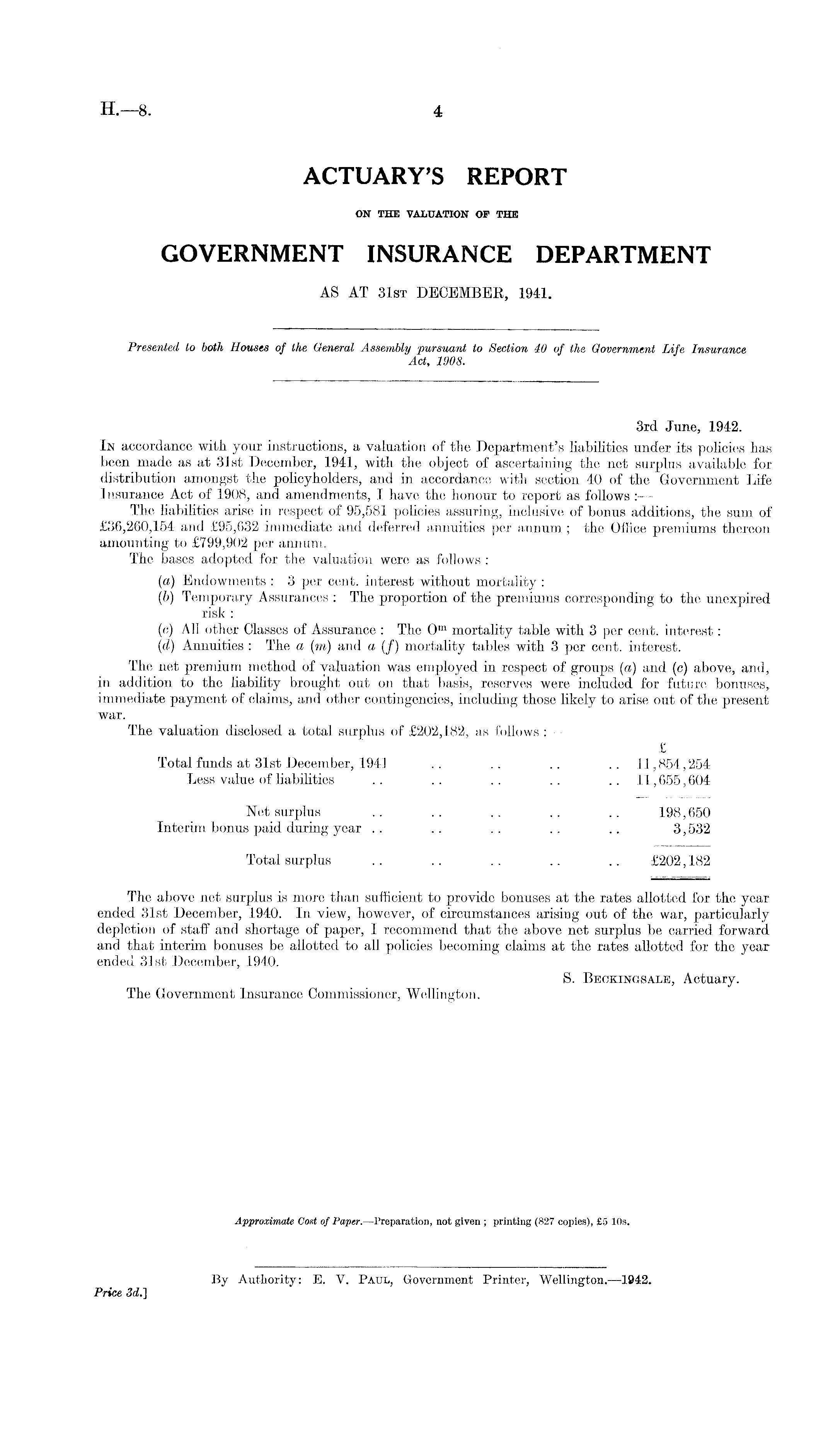 ACTUARY'S REPORT ON THE VALUATION OF THE GOVERNMENT INSURANCE DEPARTMENT AS AT 31st DECEMBEK, 194-1. Presented to both Houses of the General Assembly pursuant to Section 40 of the Government Life Insurance Act, 1908. 3rd June, 1942. In accordance with your instructions, a valuation of the Department's liabilities under its policies has been made as at 31st December, 1941, with the object of ascertaining the net surplus available for distribution amongst the policyholders, and in accordance with section 40 of the Government Life Insurance Act of 1908, and amendments, I have the honour to report as follows : — The liabilities arise in respect of 95,581 policies assuring, inclusive of bonus additions, the sum of £36,260,154 and £95,632 immediate and deferred annuities per annum ; the Office premiums thereon amounting to £799,902 per annum. The bases adopted for the valuation were as follows :— (a) Endowments : 3 per cent, interest without mortality : (b) Temporary Assurances : The proportion of the premiums corresponding to the unexpired risk : (c) All other Classes of Assurance : The O m mortality table with 3 per cent, interest: (d) Annuities : The a (m) and a (/) mortality tables with 3 per cent, interest. The net premium method of valuation was employed in respect of groups (a) and (c) above, and, in addition to the liability brought out on that basis, reserves were included for future bonuses, immediate payment of claims, and other contingencies, including those likely to arise out of the present war. The valuation disclosed a total surplus of £202,182, as follows : — £ Total funds at 31st December, 1941 .. .. .. .. 11,854,254 Less value of liabilities .. .. .. .. .. 11,655,604 Net surplus .. .. .. .. .. 198,650 Interim bonus paid during year .. .. .. .. .. 3,532 Total surplus .. .. .. .. .. £202,182 The above net surplus is more than sufficient to provide bonuses at the rates allotted for the year ended 31st December, 1940. In view, however, of circumstances arising out of the war, particularly depletion of staff and shortage of paper, I recommend that the above net surplus be carried forward and that interim bonuses be allotted to all policies becoming claims at the rates allotted for the year ended 31st December, 1940. S. Beckingsale, Actuary. The Government Insurance Commissioner, Wellington. Approximate Cost of Paper.—Preparation, not given ; printing (827 copies), £5 10s.
