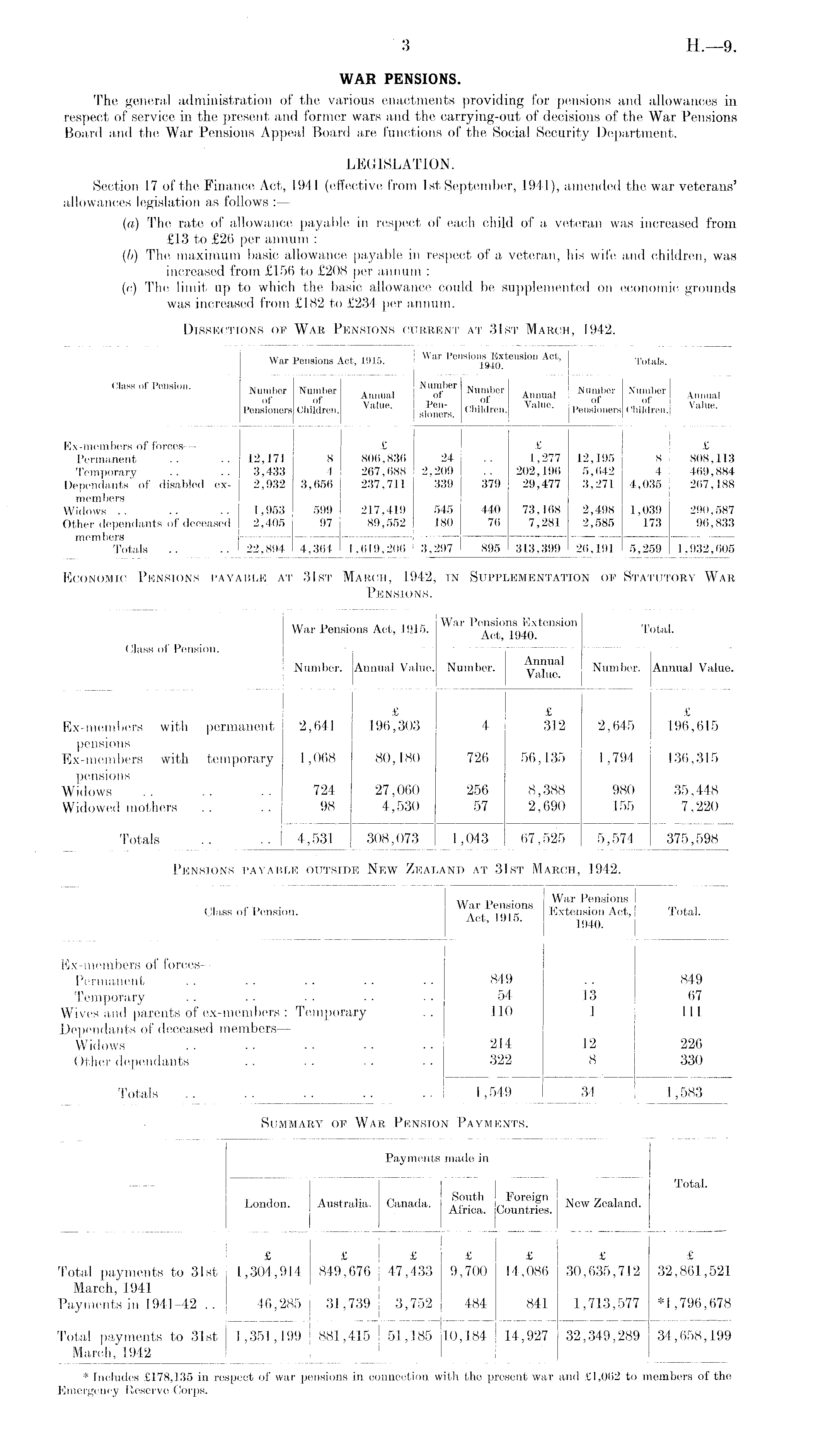 WAR PENSIONS. The general administration of the various enactments providing for pensions and allowances in respect of service in the present and former wars and the carrying-out of decisions of the War Pensions Board and the War Pensions Appeal Board are functions of the Social Security Department. LEGISLATION. Section 17 of the Finance Act, 1941 (effective from Ist September, 1941), amended the war veterans' allowances legislation as follows : — (a) The rate of allowance payable in respect of each child of a veteran was increased from £13 to £26 per annum : (b) The maximum basic allowance payable in respect of a veteran, his wife and children, was increased from £156 to £208 per annum : (ci) The limit up to which the basic allowance could be supplemented on economic grounds was increased from £182 to £234 per annum.
