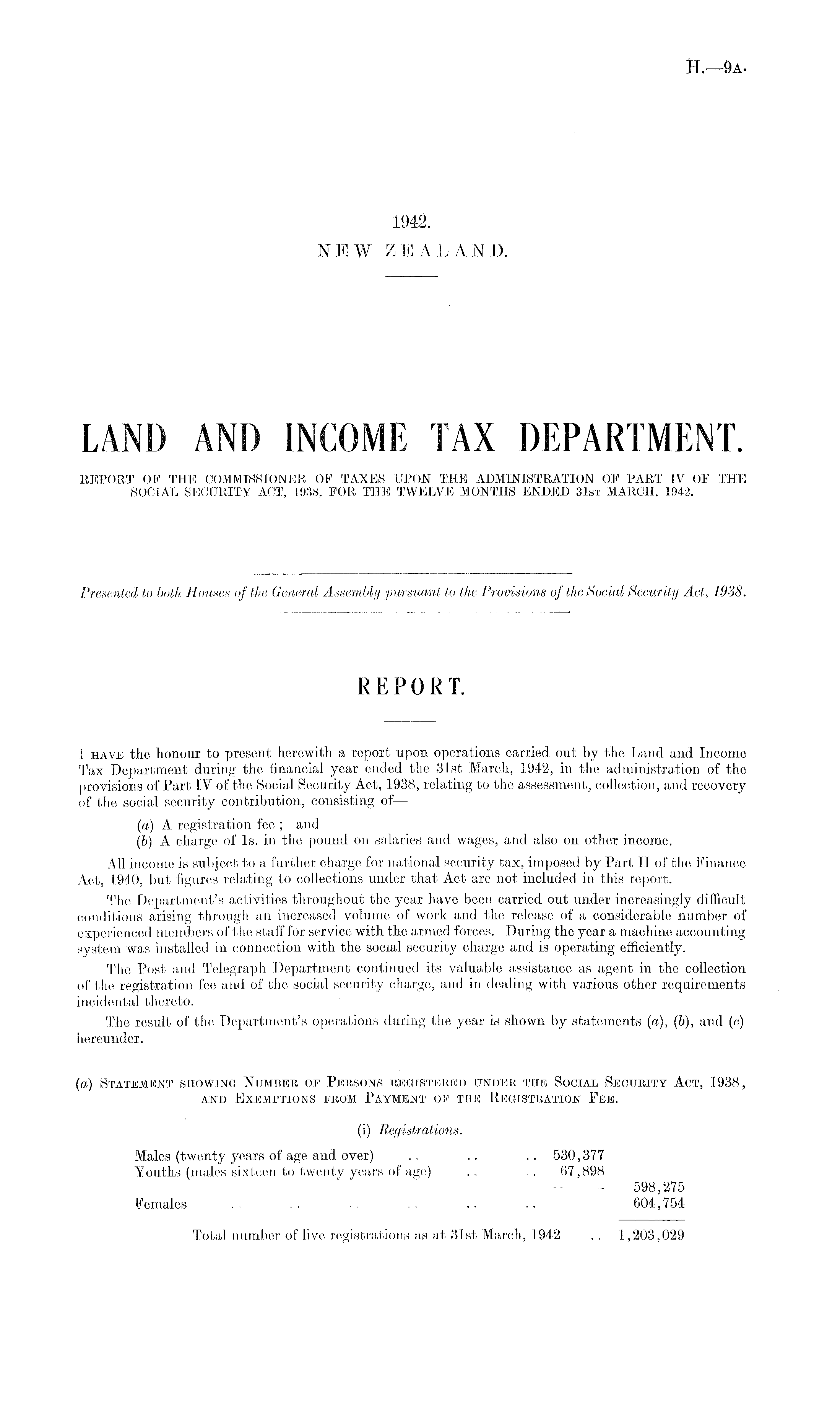I have the honour to present herewith a report upon operations carried out by the Land and Income Tax Department during the financial year ended the 31st March, 1942, in the administration of the provisions of Part IV of the Social Security Act, 1938, relating to the assessment, collection, and recovery of the social security contribution, consisting of— (a) A registration fee ; and (b) A charge of Is. in the pound on salaries and wages, and also on other income. All income is subject to a further charge for national security tax, imposed by Part II of the Finance Act, 1940, but figures relating to collections under that Act are not included in this report. The Department's activities throughout the year have been carried out under increasingly difficult conditions arising through an increased volume of work and the release of a considerable number of experienced members of the staff for service with the armed forces. During the year a machine accounting system was installed in connection with the social security charge and is operating efficiently. . The Post and Telegraph Department continued its valuable assistance as agent in the collection of the registration fee and of the social security charge, and in dealing with various other requirements incidental thereto. The result of the Department's operations during the year is shown by statements (a), (b), and (c) hereunder. (a) Statement showing Number of Persons registered under the Social Security Act, 1938, and Exemptions from Payment of the Registration Fee. (i) Registrations. Males (twenty years of age and over) .. .. .. 530,377 Youths (males sixteen to twenty years of age) .. .. 67,898 598,275 Females .. .. .. .. .. 604,754 Total number of live registrations as at 31st March, 1942 .. 1,203,029