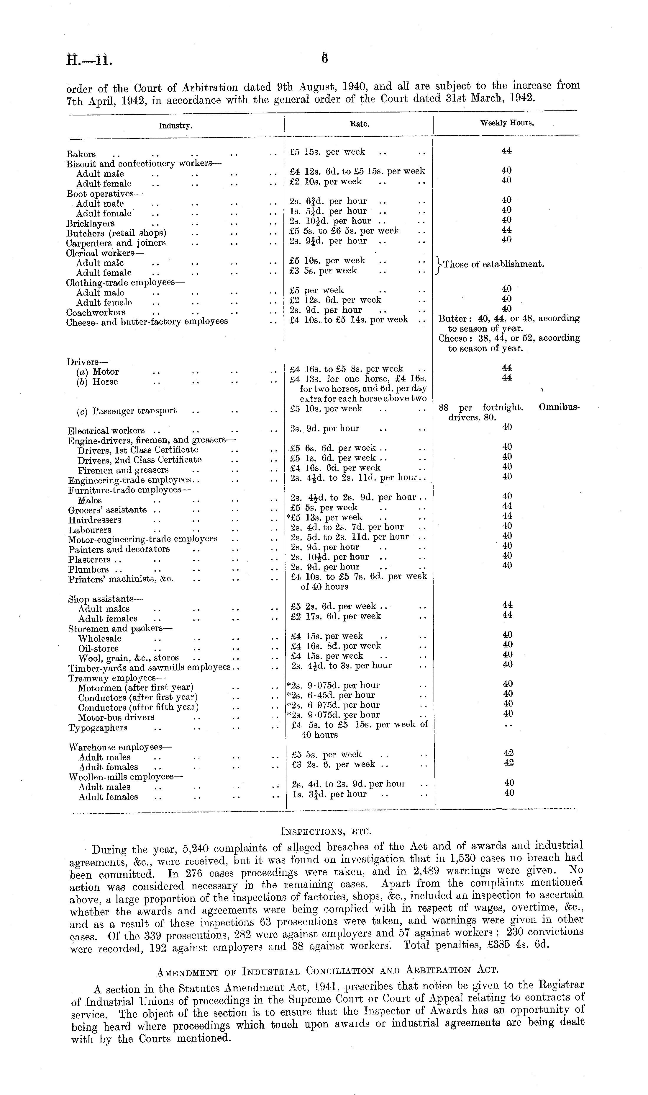 Inspections, etc. During the year, 5,240 complaints of alleged breaches of the Act and of awards and industrial agreements, &c., were received, but it was found on investigation that in 1,530 cases no breach had been committed. In 276 cases proceedings were taken, and in 2,489 warnings were given. No action was considered necessary in the remaining cases. Apart from the complaints mentioned above, a large proportion of the inspections of factories, shops, &c., included an inspection to ascertain whether the awards and agreements were being complied with in respect of wages, overtime, &c., and as a result of these inspections 63 prosecutions were taken, and warnings were given in other cases. Of the 339 prosecutions, 282 were against employers and 57 against workers ; 230 convictions were recorded, 192 against employers and 38 against workers. Total penalties, £385 4s. 6d. Amendment of Industrial Conciliation and Arbitration Act. A section in the Statutes Amendment Act, 1941, prescribes that notice be given to the Registrar of Industrial Unions of proceedings in the Supreme Court or Court of Appeal relating to contracts of service. The object of the section is to ensure that the Inspector of Awards has an opportunity of being heard where proceedings which touch upon awards or industrial agreements are being dealt with by the Courts mentioned.