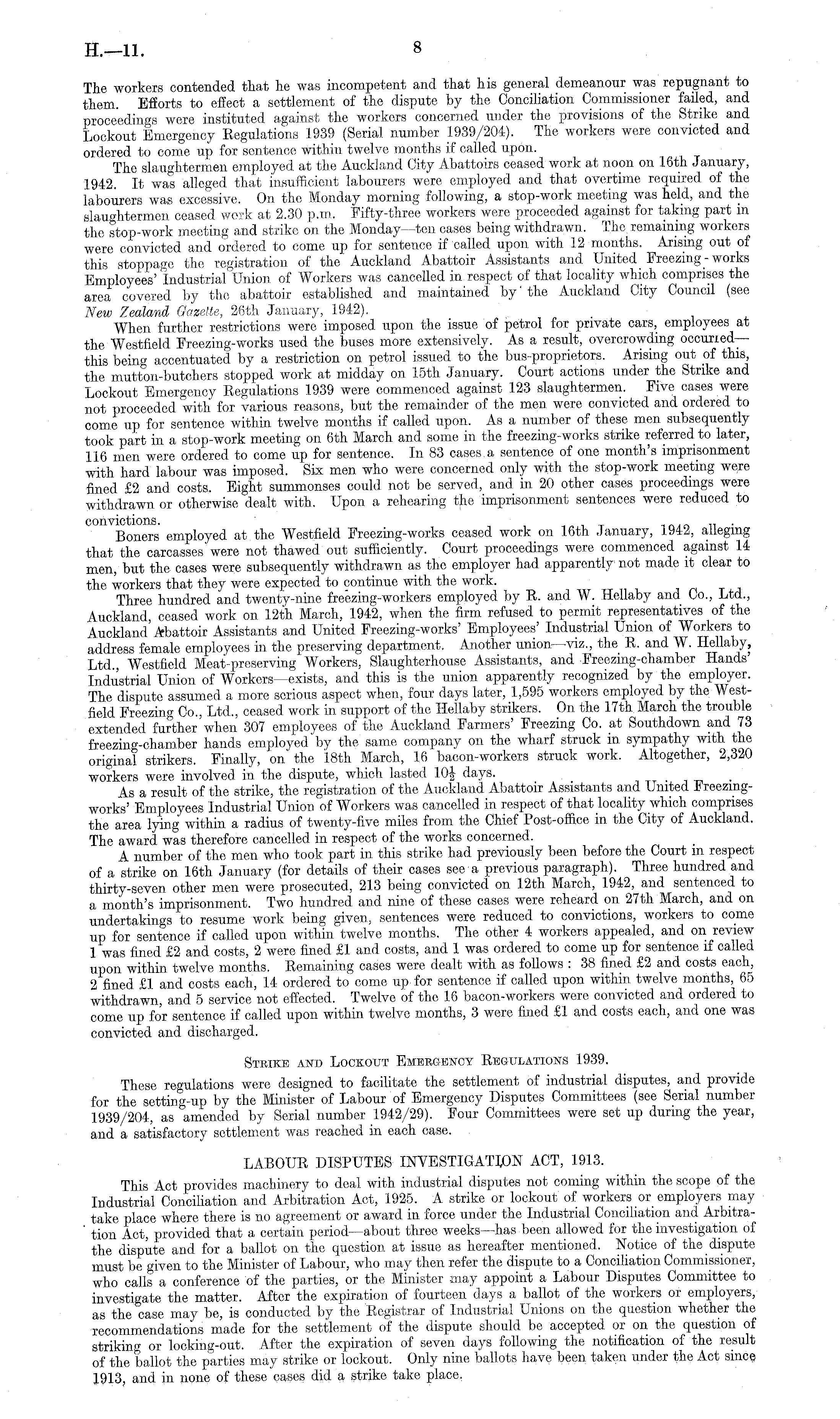 The workers contended that he was incompetent and that his general demeanour was repugnant to them. Efforts to effect a settlement of the dispute by the Conciliation Commissioner failed, and proceedings were instituted against the workers concerned under the provisions of the Strike and Lockout Emergency Regulations 1939 (Serial number 1939/204). The workers were convicted and ordered to come up for sentence within twelve months if called upon. The slaughtermen employed at the Auckland City Abattoirs ceased work at noon on 16th January, 1942. It was alleged that insufficient labourers were employed and that overtime required of the labourers was excessive. On the Monday morning following, a stop-work meeting was held, and the slaughtermen ceased work at 2.30 p.m. Fifty-three workers were proceeded against for taking part m the stop-work meeting and strike on the Monday —ten cases being withdrawn. )be remaining workers were convicted and ordered to come up for sentence if called upon with 12 months. Arising out of this stoppage the registration of the Auckland Abattoir Assistants and United Freezing -works Employees' Industrial Union of Workers was cancelled in respect of that locality which comprises the area covered by the abattoir established and maintained by the Auckland City Council (see New Zealand Gazette, 26th January, 1942). When further restrictions were imposed upon the issue of petrol for private cars, employees at the Westfield Freezing-works used the buses more extensively. As a result, overcrowding occurred— this being accentuated by a restriction on petrol issued to the bus-proprietors. Arising out of this, the mutton-butchers stopped work at midday on 15th January. Court actions under the Strike and Lockout Emergency Regulations 1939 were commenced against 123 slaughtermen. Five cases were not proceeded with for various reasons, but the remainder of the men were convicted and ordered to come up for sentence within twelve months if called upon. As a number of these men subsequently took part in a stop-work meeting on 6th March and some in the freezing- works strike referred, to later, 116 men were ordered to come up for sentence. In 83 cases, a sentence of one month's imprisonment with hard labour was imposed. Six men who were concerned only with the stop-work meeting were fined £2 and costs. Eight summonses could not be served, and in 20 other cases proceedings were withdrawn or otherwise dealt with. Upon a rehearing the imprisonment sentences were reduced to convictions. , , _ _ . Boners employed at the Westfield Freezing-works ceased work on 16th January, 1942, alleging that the carcasses were not thawed out sufficiently. Court proceedings were commenced against 14 men, but the cases were subsequently withdrawn as the employer had apparently not made it clear to the workers that they were expected to continue with the work. Three hundred and twenty-nine freezing-workers employed by R. and W. Hellaby and Co., Ltd., Auckland, ceased work on 12th March, 1942, when the firm refused to permit representatives of the Auckland' Abattoir Assistants and United Freezing-works' Employees' Industrial Union of Workers to address female employees in the preserving department. Another union—viz., the R. and W. Hellaby, Ltd., Westfield Meat-preserving Workers, Slaughterhouse Assistants, and Freezing-chamber Hands Industrial Union of Workers—exists, and this is the union apparently recognized by the employer. The dispute assumed a more serious aspect when, four days later, 1,595 workers employed by the Westfield Freezing Co., Ltd., ceased work in support of the Hellaby strikers. On the 17th March the trouble extended further when 307 employees of the Auckland Farmers' Freezing Co. at Southdown and 73 freezing-chamber hands employed by the same company on the wharf struck in sympathy with the original strikers. Finally, on the 18th March, 16 bacon-workers struck work. Altogether, 2,320 workers were involved in the dispute, which lasted 10A days. As a result of the strike, the registration of the Auckland Abattoir Assistants and United Freezingworks' Employees Industrial Union of Workers was cancelled in respect of that locality which comprises the area lying within a radius of twenty-five miles from the Chief Post-office in the City of Auckland. The award was therefore cancelled in respect of the works concerned. A number of the men who took part in this strike had previously been before the Court in respect of a strike on 16th January (for details of their cases see a previous paragraph). Three hundred and thirty-seven other men were prosecuted, 213 being convicted on 12th March, 1942, and sentenced to a month's imprisonment. Two hundred and nine of these cases were reheard on 27th March, and on undertakings to resume work being given, sentences were reduced to convictions, workers to come up for sentence if called upon within twelve months. The other 4 workers appealed, and on review 1 was fined £2 and costs, 2 were fined £1 and costs, and 1 was ordered to come up for sentence if called upon within twelve months. Remaining cases were dealt with as follows : 38 fined £2 and costs each, 2 fined £1 and costs each, 14 ordered to come up for sentence if called upon within twelve months, 65 withdrawn, and 5 service not effected. Twelve of the 16 bacon-workers were convicted and ordered to come up for sentence if called upon within twelve months, 3 were fined £1 and costs each, and one was convicted and discharged. Strike and Lockout Emergency Regulations 1939. These regulations were designed to facilitate the settlement of industrial disputes, and provide for the setting-up by the Minister of Labour of Emergency Disputes Committees (see Serial number 1939/204, as amended by Serial number 1942/29). Four Committees were set up during the year, and a satisfactory settlement was reached in each case. LABOUR DISPUTES INVESTIGATION ACT, 1913. This Act provides machinery to deal with 