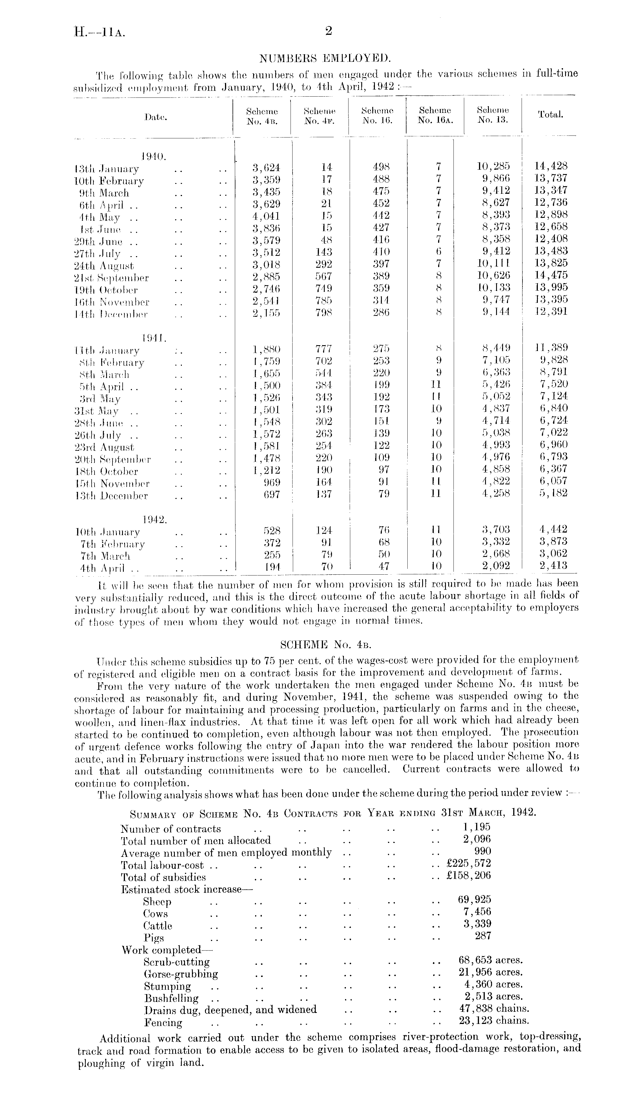 NUMBERS EMPLOYED. The following table shows the numbers of men engaged the various schemes in full-time subsidized employment from January, 1940, to 4th April, 1942 : —