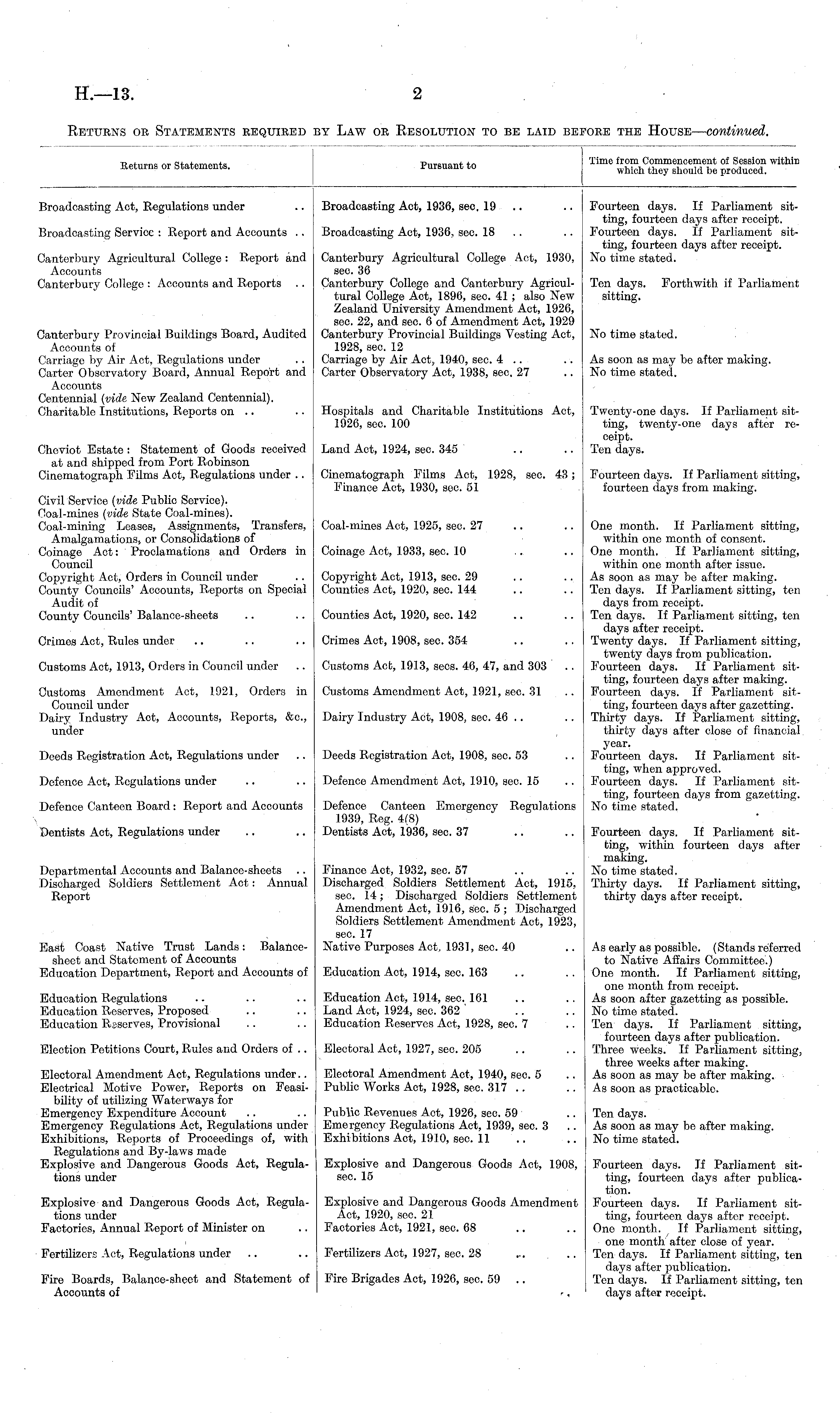 Rutin™ nr Statements Pursuant to Time £rom Commencement of Session within Keturns or btatements. l ursuant to whlch they shoul(i b() produced _ Broadcasting Act, Regulations under .. Broadcasting Act, 1936, sec. 19 .. Fourteen days. If Parliament sitting, fourteen days after receipt. Broadcasting Service : Report and Accounts .. Broadcasting Act, 1936, sec. 18 . . Fourteen days. If Parliament sitting, fourteen days after receipt. Canterbury Agricultural College : Report and Canterbury Agricultural College Act, 1930, No time stated. Accounts sec. 36 Canterbury College : Accounts and Reports .. Canterbury College and Canterbury Agricul- Ten days. Forthwith if Parliament tural College Act, 1896, sec. 41 ; also New sitting. Zealand University Amendment Act, 1926, sec. 22, and sec. 6 of Amendment Act, 1929 Canterbury Provincial Buildings Board, Audited Canterbury Provincial Buildings Vesting Act, No time stated. Accounts of 1928, sec. 12 Carriage by Air Act, Regulations under .. Carriage by Air Act, 1940, sec. 4 .. As soon as may be after making. Carter Observatory Board, Annual Report and Carter Observatory Act, 1938, see. 27 .. No time stated. Accounts Centennial (vide, New Zealand Centennial). Charitable Institutions, Reports on .. • • Hospitals and Charitable Institutions Act, Twenty-one days. If Parliament sit1920, sec. 100 ting, twenty-one days after receipt. Cheviot Estate : Statement of Goods received Land Act, 1924, sec. 345 .. . . Ten days. at and shipped from Port Robinson Cinematograph Films Act, Regulations under .. Cinematograph Films Act, 1928, sec. 43 ; Fourteen days. If Parliament sitting, Finance Act, 1930, sec. 51 fourteen days from making. Civil Service (vide Public Service). Coal-mines (vide State Coal-mines). Coal-mining Leases, Assignments, Transfers, Coal-mines Act, 1925, sec. 27 .. .. One month. If Parliament sitting, Amalgamations, or Consolidations of within one month of consent. Coinage Act: Proclamations and Orders in Coinage Act, 1933, see. 10 .. .. One month. If Parliament sitting, Council within one month after issue. Copyright Act, Orders in Council under .. Copyright Act, 1913, sec. 29 .. As soon as may be after making. County Councils' Accounts, Reports on Special Counties Act, 1920, sec. 144 .. .. Ten days. If Parliament sitting, ten Audit of days from receipt. County Councils' Balance-sheets .. .. Counties Act, 1920, sec. 142 .. .. Ten days. If Parliament sitting, ten days after receipt. Crimes Act, Rules under .. .. .. Crimes Act, 1908, sec. 354 .. . . Twenty days. If Parliament sitting, twenty days from publication. Customs Act, 1913, Orders in Council under .. Customs Act, 1913, sees. 46, 47, and 303 .. Fourteen days. If Parliament sitting, fourteen days after making. Customs Amendment Act, 1921, Orders in Customs Amendment Act, 1921, sec. 31 .. Fourteen days. If Parliament sitCouncil under ting, fourteen days after gazetting. Dairy Industry Act, Accounts, Reports, &c, Dairy Industry Act, 1908, sec. 46 .. .. Thirty days. If Parliament sitting, under thirty days after close of financial year. Deeds Registration Act, Regulations under .. Deeds Registration Act, 1908, sec. 53 .. Fourteen days. If Parliament sitting, when approved. Defence Act, Regulations under .. .. Defence Amendment Act, 1910, sec. 15 .. Fourteen days. If Parliament sitting, fourteen days from gazetting. Defence Canteen Board: Report and Accounts Defence Canteen Emergency Regulations No time stated. 1939, Reg. 4(8) Dentists Act, Regulations under .. .. Dentists Act, 1936, sec. 37 .. .. Fourteen days. If Parliament sitting, within fourteen days after making. Departmental Accounts and Balance-sheets .. Finance Act, 1932, sec. 57 .. .. No time stated. Discharged Soldiers Settlement Act: Annual Discharged Soldiers Settlement Act, 1915, Thirty days. If Parliament sitting, Report sec. 14; Discharged Soldiers Settlement thirty days after receipt. Amendment A.ct, 1916, sec. 5 ; Discharged Soldiers Settlement Amendment Act, 1923, sec. 17 East Coast Native Trust Lands: Balance- Native Purposes Act. 1931, sec. 40 .. As early as possible. (Stands referred sheet and Statement of Accounts to Native Affairs Committee.) Education Department, Report and Accounts of Education Act, 1914, sec. 163 .. . . One month. If Parliament sitting, one month from receipt. Education Regulations .. .. .. Education Act, 1914, sec. 161 .. As soon after gazetting as possible. Education Reserves, Proposed .. .. Land Act, 1924, sec. 362 .. .. No time stated. Education Reserves, Provisional . . .. Education Reserves Act, 1928, sec. 7 .. Ten days. If Parliament sitting, fourteen days after publication. Election Petitions Court, Rules and Orders of .. Electoral Act, 1927, sec. 205 .. .. Three weeks. If Parliament sitting, three weeks after making. Electoral Amendment Act, Regulations under.. Electoral Amendment Act, 1940, sec. 5 As soon as may be after making. Electrical Motive Power, Reports on Feasi- Public Works Act, 1928, sec. 317 .. As soon as practicable. bility of utilizing Waterways for Emergency Expenditure Account .. .. Public Revenues Act, 1926, sec. 59 .. Ten days. Emergency Regulations Act, Regulations under Emergency Regulations Act, 1939, see. 3 .. As soon as may be after making. Exhibitions, Reports of Proceedings of, with Exhibitions Act, 1910, sec. 11 .. .. No time stated. Regulations and By-laws made Explosive and Dangerous Goods Act, Regula- Explosive and Dangerous Goods Act, 1908, Fourteen days. If Parliament sittions under sec. 15 ting, fourteen da,ys after publication. Explosive and Dangerous Goods Act, Regula- Explosive and Dangerous Goods Amendment Fourteen days. If Parliament sittions under Act, 1920, sec. 21 ting, fourteen days after receipt. Factories, Annual Report of Minister on .. Factories Act, 1921, sec. 68 .. .. One month. If Parliament sitting, one month after close of year. Fertilizers Act, Regulations under .. .. Fertilizers Act, 1927, sec. 28 ... .. Ten days. If Parliament sitting, t
