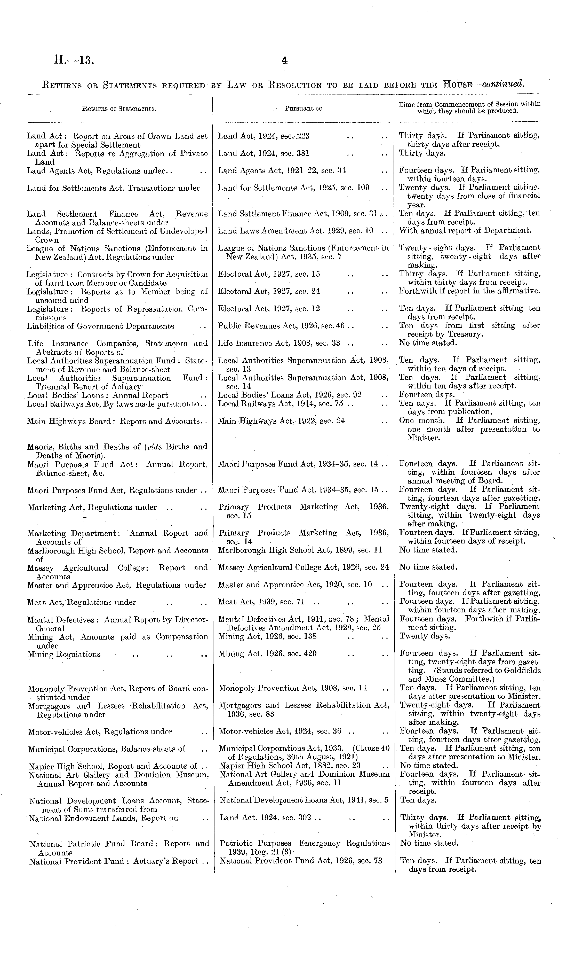 _ , _, , . .,.,_., Time from Commencement of Session within Returns or Statements. Pursuant to which they ahould be produced. Land Act: Report ou Areas of Crown Land set Laud Act, 1924, sec. 223 .. .. Thirty days. If Parliament sitting, apart for Special Settlement thirty days after receipt. Land Act: Reports re Aggregation of Private Land Act, 1924, sec. 381 .. .. Thirty days. Land Land Agents Act, Regulations under.. .. Land Agents Act, 1921-22, sec. 34 .. Fourteen days. If Parliament sitting, within fourteen days. Land for Settlements Act, Transactions under Land for Settlements Act, 1925, see. 109 .. Twenty days. If Parliament sitting, twenty days from close of financial year. Land Settlement Finance Act, Revenue Land Settlement Finance Act, 1909, sec. 31... Ten days. If Parliament sitting, ten Accounts and Balance-sheets under days from receipt. Lands, Promotion of Settlement of Undeveloped Land Laws Amendment Act, 1929, sec. 10 .. With annual report of Department. Crown League of Nations Sanctions (Enforcement in League of Nations Sanctions (Enforcement in Twenty - eight days. If Parliament New Zealand) Act, Regulations under Now Zealand) Act, 1935, see. 7 sitting, twenty-eight days after making. Legislature: Contracts by Crown for Acquisition Electoral Act, 1927, sec. 15 .. .. Thirty days. If Parliament sitting, of Land from Member or Candidate within thirty days from receipt. Legislature : Reports as to Member being of Electoral Act, 1927, see. 24 .. .. Forthwith if report in the affirmative. unsound mind Legislature : Reports of Representation Coin- Electoral Act, 1927, sec. 12 .. .. Ten days. If Parliament sitting ten missions days from receipt. Liabilities of Government Departments .. Public Revenues Act, 1920, sec. 40 .. .. Ten days from lirst sitting after receipt by Treasury. Life Insurance Companies, Statements and Life Insurance Act, 1908, sec. 33 .. . . No time stated. Abstracts of Reports of Local Authorities Superannuation Fund : State- Local Authorities Superannuation Act, 190S, Ten days. If Parliament sitting, merit of Revenue and Balance-sheet sec. 13 within ten days of receipt. Local. Authorities Superannuation Fund: Local Authorities Superannuation Act, 1908, Ten days. If Parliament sitting, Triennial Report of Actuary sec. 14 within ten days after receipt. Local Bodies' Loans : Annual Report . . Local Bodies' Loans Act, 1926, sec. 92 .. Fourteen days. Local Railways Act, By-laws made pursuant to.. Local Railways Act, 1914, sec. 75 .. .. Ten days. If Parliament sitting, ten days from publication. Main Highways Board • Report and Accounts.. Main Highways Act, 1922, sec. 24 .. One month. If Parliament sitting, one month after presentation to Minister. Maoris, Births and Deaths of (vide Births and Deaths of Maoris). Maori Purposes Fund Act: Annual Report, Maori Purposes Fund Act, 1934-35, sec. 14 .. Fourteen days. If Parliament sit-Balance-sheet, &c. ' ting, within fourteen days after annual meeting of Board. Maori Purposes Fund Act, Regulations under .. Maori Purposes Fund Act, 1934-35, sec. 15 .. Fourteen days. If Parliament sitting, fourteen days after gazetting. Marketing Act, Regulations under .. .. Primary Products Marketing Act, 1936, Twenty-eight days. If Parliament see. 1.5 sitting, within twenty-eight days after making. Marketing Department: Annual Report and Primary Products Marketing Act, 1936, Fourteen days. If Parliament sitting, Accounts of sec. 14 within fourteen days of receipt. Maryborough High School, Report and Accounts Marlborough High School Act, 1899, sec. 11 No time stated. of Massoy Agricultural College : Report and Massey Agricultural College Act, 1926, see. 24 No time stated. Accounts Master and Apprentice Act, Regulations under Master and Apprentice Act, 1920, sec. 10 .. Fourteen days. If Parliament sitting, fourteen days after gazetting. Meat Act, Regulations under .. .. Meat Act, 1939, sec. 71 .. .. .. Fourteen days. If Parliament sitting, within fourteen days after making. Mental Defectives : Annual Report by Director- Mental Defectives Act, 1911, sec. 78 ; Menial Fourteen days. Forthwith if ParliaGeneral Defectives Amendment Act, 1928, see. 25 ment sitting. Mining Act, Amounts paid as Compensation Mining Act, 1926, sec. 138 .. .. Twenty days. under Mining Regulations .. .. .. Mining Act, 1926, sec. 429 .. .. Fourteen, days. If Parliament sitting, twenty-eight days from gazetting. (Stands referred to Goldfields and Mines Committee.) Monopoly Prevention Act, Report of Board con- Monopoly Prevention Act, 1908, sec. 11 .. Ten days. If Parliament sitting, ten stituted under days after presentation to Minister. Mortgagors and Lessees Rehabilitation Act, Mortgagors and Lessees Rehabilitation Act, Twenty-eight days. If Parliament Regulations under 1936, sec. 83 sitting, within twenty-eight days after making. Motor-vehicles Act, Regulations under .. Motor-vehicles Act, 1924, sec. 30 .. . . Fourteen days. If Parliament sitting, fourteen days after gazetting. Municipal Corporations, Balance-sheets of .. Municipal Corporations Act, 1933. (Clause 40 Ten days. If Parliament sitting, ten of Regulations, 30th August, 1921) days after presentation to Minister. Napier High School, Report and Accounts of . . Napier High School Act, 1882, sec. 23 No time stated. National Art Gallery and Dominion Museum, National Art Gallery and Dominion Museum Fourteen days. If Parliament sitAnnual Report and Accounts Amendment Act, 1936, sec. 11 ting, within fourteen days after receipt. National Development Loans Account, State- National Development Loans Act, 1941, aec. 5 Ten days. ment of Sums transferred from National Endowment Lands, Report on .. Land Act, 1924, sec. 302 .. .. .. Thirty days. If Parliament sitting, within thirty days after receipt by Minister. National Patriotic Fund Board: Report and Patriotic Purposes Emergency Regulations No time stated. Accounts 1939, Reg. 21 (3) National Provident Fund : Actuary's Report .. National Provident Fund Act, 1926, s