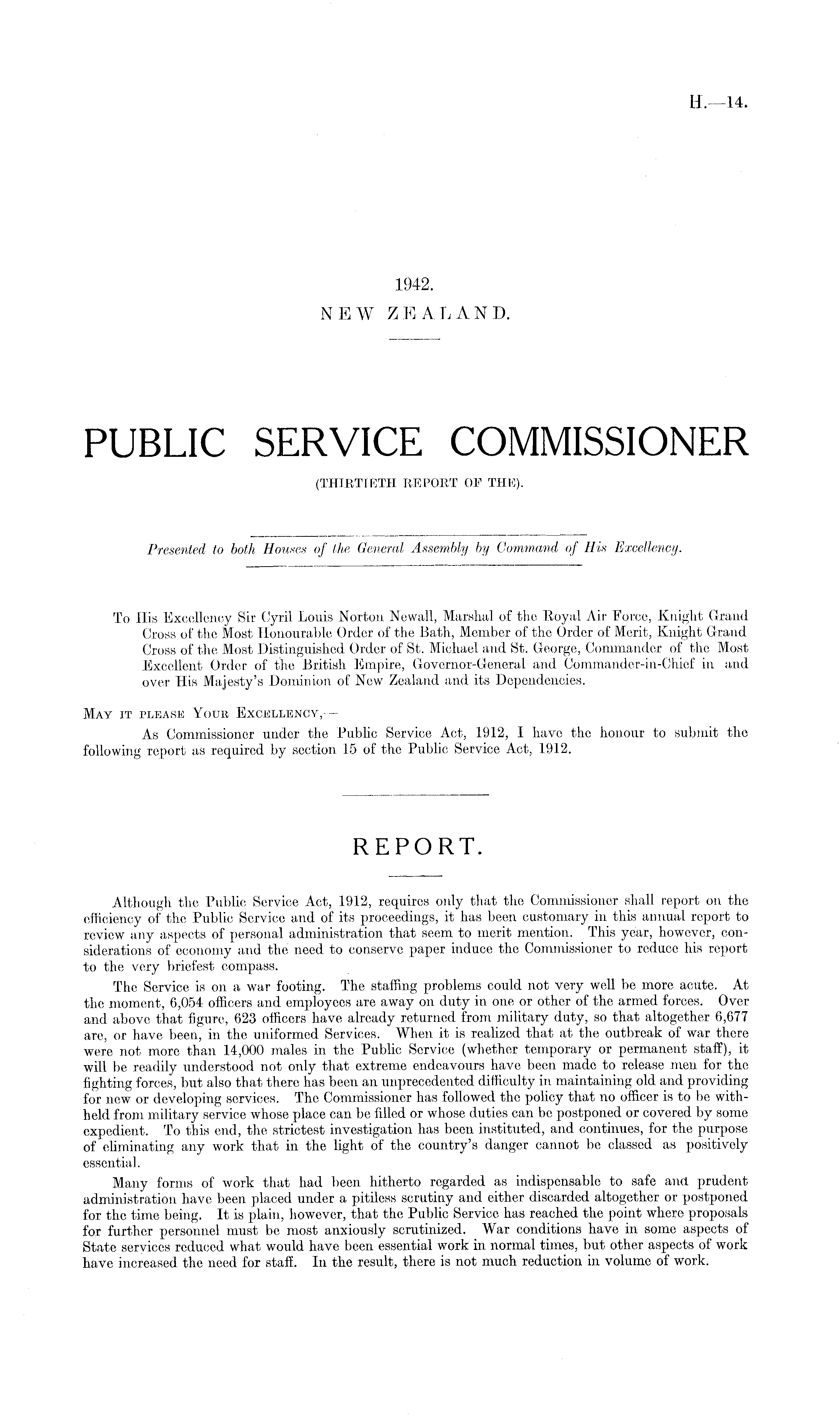 To His Excellency Sir Cyril Louis Norton Newall, Marshal of the Eoyal Air Force, Knight Grand Cross of the Most Honourable Order of the Bath, Member of the Order of Merit, Knight Grand Cross of the Most Distinguished Order of St. Michael and St. George, Commander of the Most Excellent Order of the British Empire, Governor-General and Commander-in-Chief in and over His Majesty's Dominion of New Zealand and its Dependencies. May it please Your Excellency,— As Commissioner under the Public Service Act, 1912, I have the honour to submit the following report as required by section 15 of the Public Service Act, 1912.