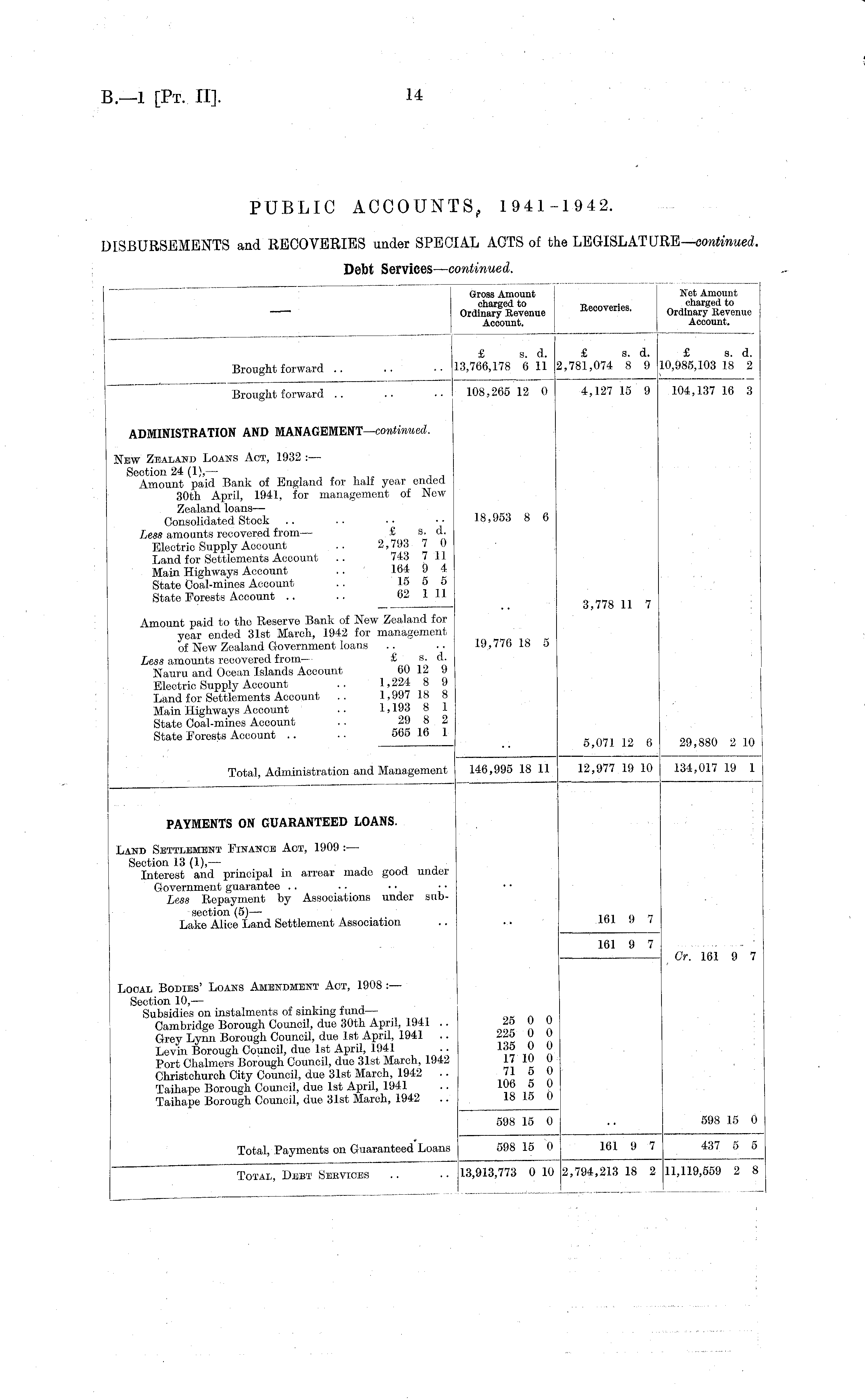 Gross Amount -Net Amount charged to Rpcnvprip.* charged to Ordinary Revenue Ordinary Revenue Account. Account. £ s. d. £ s. d. £ s. d. Brought forward .. .. •• 13,766,178 6 11 2,781,074 8 9 10,985,103 18 2 Brought forward .. .. 108,265 12 0 4,127 15 9 104,137 16 3 ADMINISTRATION AND MANAGEMENT —continued. New Zealand Loans Act, 1932 Section 24 (I), — Amount paid Bank of England for half year ended 30th April, 1941, for management of New Zealand loans — Consolidated Stock .. .. •• • 18,953 8 6 Less amounts recovered from- — £ s. d. Electric Supply Account .. 2,793 7 0 Land for Settlements Account .. 743 7 11 Main Highways Account .. 104 9 4 State Coal-mines Account . . 15 5 5 State Forests Account .. .. 62 1 11 3 778 11 7 Amount paid to the Reserve Bank of New Zealand for year ended 31st March, 1942 for management of New Zealand Government loans .. 19,776 18 5 Less amounts recovered from— £ _ s. d. Nauru and Ocean Islands Account 60 12 9 Electric Supply Account . . 1,224 8 9 Land for Settlements Account 1,997 18 8 Main Highways Account .. 1,193 8 1 State Coal-mines Account .. 29 8 2 State Forests Account .. .. 565 16 1 .. 5,071 12 6 29,880 2 10 Total, Administration and Management 146,995 18 11 12,977 19 10 134,017 19 1 PAYMENTS ON GUARANTEED LOANS. Land Settlement Finance Act, 1909 : — Section 13 (1), — interest and principal in arrear made good under Government guarantee .. Less Repayment by Associations under subsection (5) — Lake Alice Land Settlement Association .. • • J ° ' ■> < 161 9 7 Or. 161 9 7 ! Local Bodies' Loans Amendment Act, 1908 Section 10, — Subsidies on instalments of sinking fund — Cambridge Borough Council, due 30th April, 1941 .. 25 0 0 Grey Lynn Borough Council, due 1st April, 1941 .. 2jo 0 O Levin Borough Council, due 1st April, 1941 .. 135 0 0 Port Chalmers Borough Council, due 31st March, 1942 17 10 0 Christchurch City Council, due 31st March, 1942 .. 71 5 0 Taihape Borough Council, due 1st April, 1941 .. i06 5 0 Taihape Borough Council, due 31st March, 1942 .. 18 15 598 15 0 .. 598 15 0 Total, Payments on Guaranteed Loans 598 15 0 161 9 7 437 5 5 TOTAL, DEBT Sekvices .. • • 13,913,773 0 10 2,794,213 18 2 11,119,559 2 8