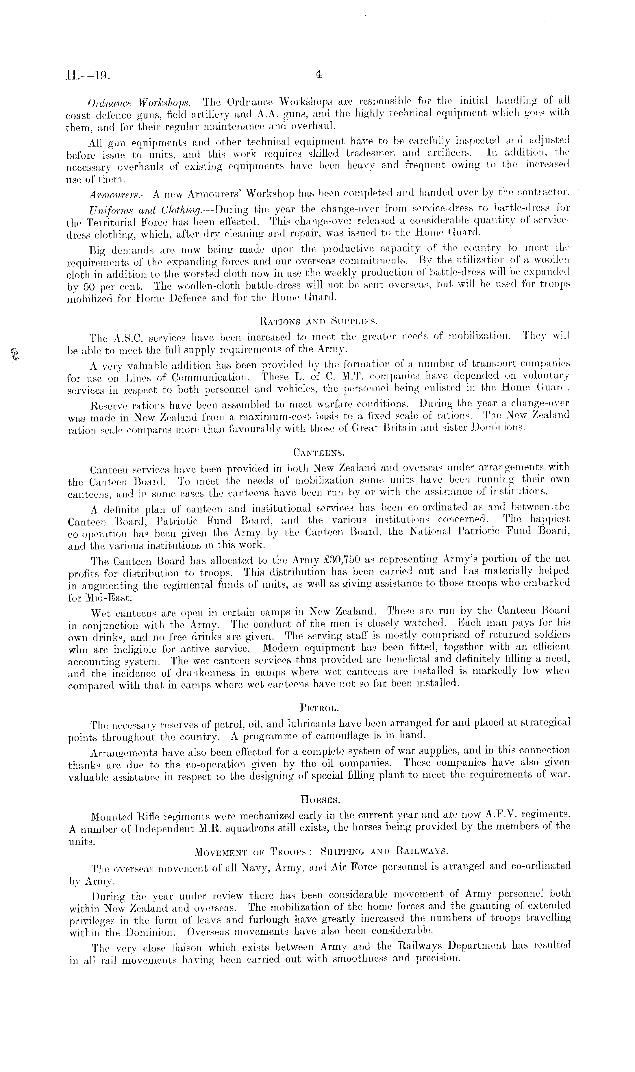 Ordnance Workshops.— The Ordnance Workshops are responsible for the initial handling of all: coast defence guns, field artillery and A.A. guns, and the highly technical equipment which goes with them, and for their regular maintenance and overhaul. All gun equipments and other technical equipment have to be carefully inspected and adjusted before issue to units, and this work requires skilled tradesmen and artificers. In addition, the necessary overhauls of existing equipments have been heavy and frequent owing to the increased use of them. Armourers.— A new Armourers' Workshop has been completed and handed over by the contractor. Uniforms and Clothing. —During the year the change-over from service-dress to battle-dress for the Territorial Force has been effected. This change-over released a considerable quantity of servicedress clothing, which, after dry cleaning and repair, was issued to the Home Guard. Big demands are now being made upon the productive capacity of the country to meet the requirements of the expanding forces and our overseas commitments. By the utilization of a woollen cloth in addition to the worsted cloth now in use the weekly production of battle-dress will be expanded by 50 per cent. The woollen-cloth battle-dress will not be sent overseas, but will be used for troops mobilized for Home Defence and for the Home Guard. Rations and Supplies. The A.S.C. services have been increased to meet the greater needs of mobilization. They will be able to meet the full supply requirements of the Army. A very valuable addition has been provided by the formation of a number of transport companies for use on Lines of Communication. These L. of C. M.T. companies have depended on voluntary services in respect to both personnel and vehicles, the personnel being enlisted in the Home Guard. Reserve rations have been assembled to meet warfare conditions. During the year a change-over was made in New Zealand from a maximum-cost basis to a fixed scale of rations. The New Zealand ration scale compares more than favourably with those of Great Britain and sister Dominions. Canteens. Canteen services have been provided in both New Zealand and overseas under arrangements with the Canteen Board. To meet the needs of mobilization some units have been running their own canteens, and in some cases the canteens have been run by or with the assistance of institutions. A definite plan of canteen and institutional services has been co-ordinated as and between.the Canteen Board, Patriotic Fund Board, and the various institutions concerned. The happiest co-operation has been given the Army by the Canteen Board, the National Patriotic Fund Board, and the various institutions in this work. The Canteen Board has allocated to the Army £30,750 as representing Army's portion of the net profits for distribution to troops. This distribution has been carried out and has materially helped in augmenting the regimental funds of units, as well as giving assistance to those troops who embarked for Mid-East. Wet canteens are open in certain camps in New Zealand. These are run by the Canteen Board in conjunction with the Army. The conduct of the men is closely watched. Each man pays for his own drinks, and no free drinks are given. The serving staff is mostly comprised of returned soldiers who are ineligible for active service. Modern equipment has been fitted, together with an efficient accounting system. The wet canteen services thus provided are beneficial and definitely filling a need, and the incidence of drunkenness in camps where wet canteens are installed is markedly low when compared with that in camps where wet canteens have not so far been installed. Petrol. The necessary reserves of petrol, oil, and lubricants have been arranged for and placed at strategical points throughout the country. A programme of camouflage is in hand. Arrangements have also been effected for a complete system of war supplies, and in this connection thanks are due to the co-operation given by the oil companies. These companies have also given valuable assistance in respect to the designing of special filling plant to meet the requirements of war. Horses. Mounted Rifle regiments were mechanized early in the current year and are now A.F.V. regiments. A number of Independent M.R. squadrons still exists, the horses being provided by the members of the units. Movement of Troops : Shipping and Railways. The overseas movement of all Navy, Army, and Air Force personnel is arranged and co-ordinated by Army. During the year under review there has been considerable movement of Army personnel both within New Zealand and overseas. The mobilization of the home forces and the granting of extended privileges in the form of leave and furlough have greatly increased the numbers of troops travelling within the Dominion. Overseas movements have also been considerable. The very close liaison which exists between Army and the Railways Department has resulted in all rail movements having been carried out with smoothness and precision.