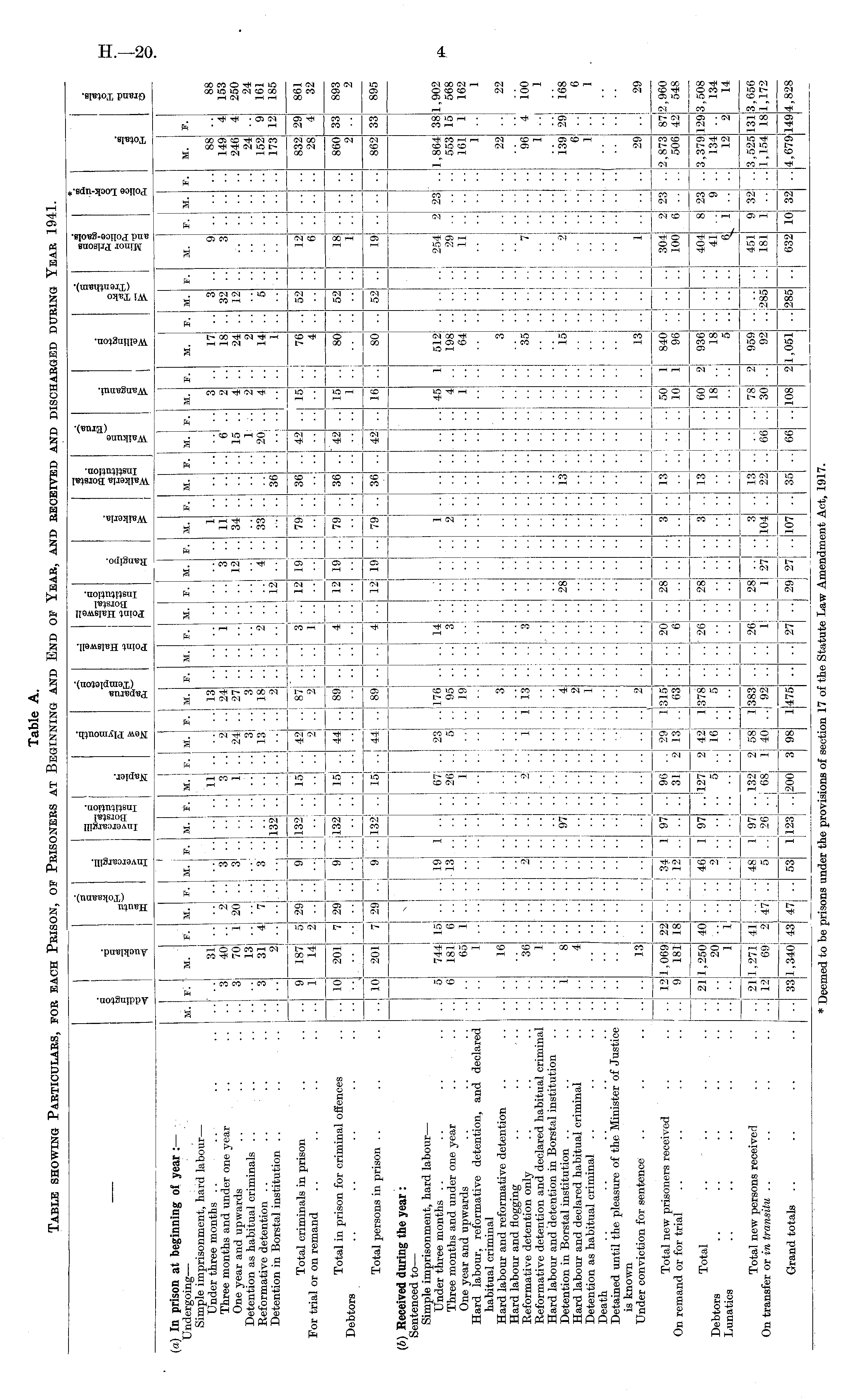 Table A. Table showing Particulars, for each Prison, of Prisoners at Beginning and End of Year, and received and discharged during Year 1941.