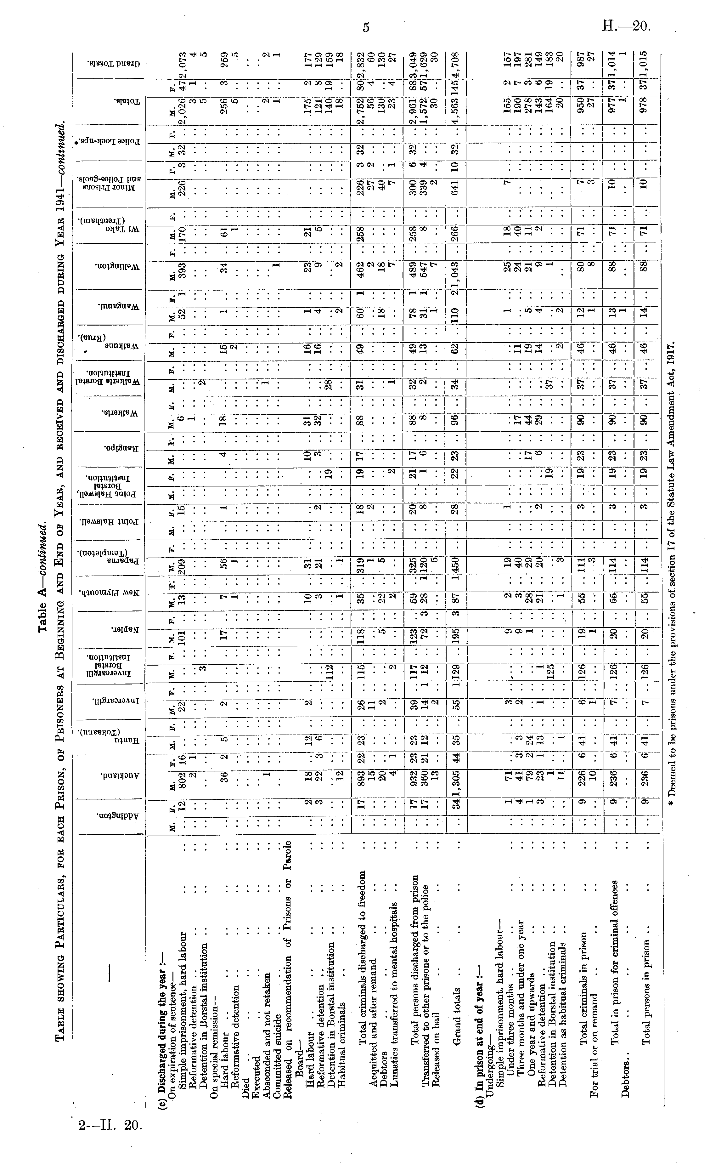 Table A— continued. Table showing Particulars, for each Prison, of Prisoners at Beginning and End of Year, and received and discharged during Year 1941— continued.