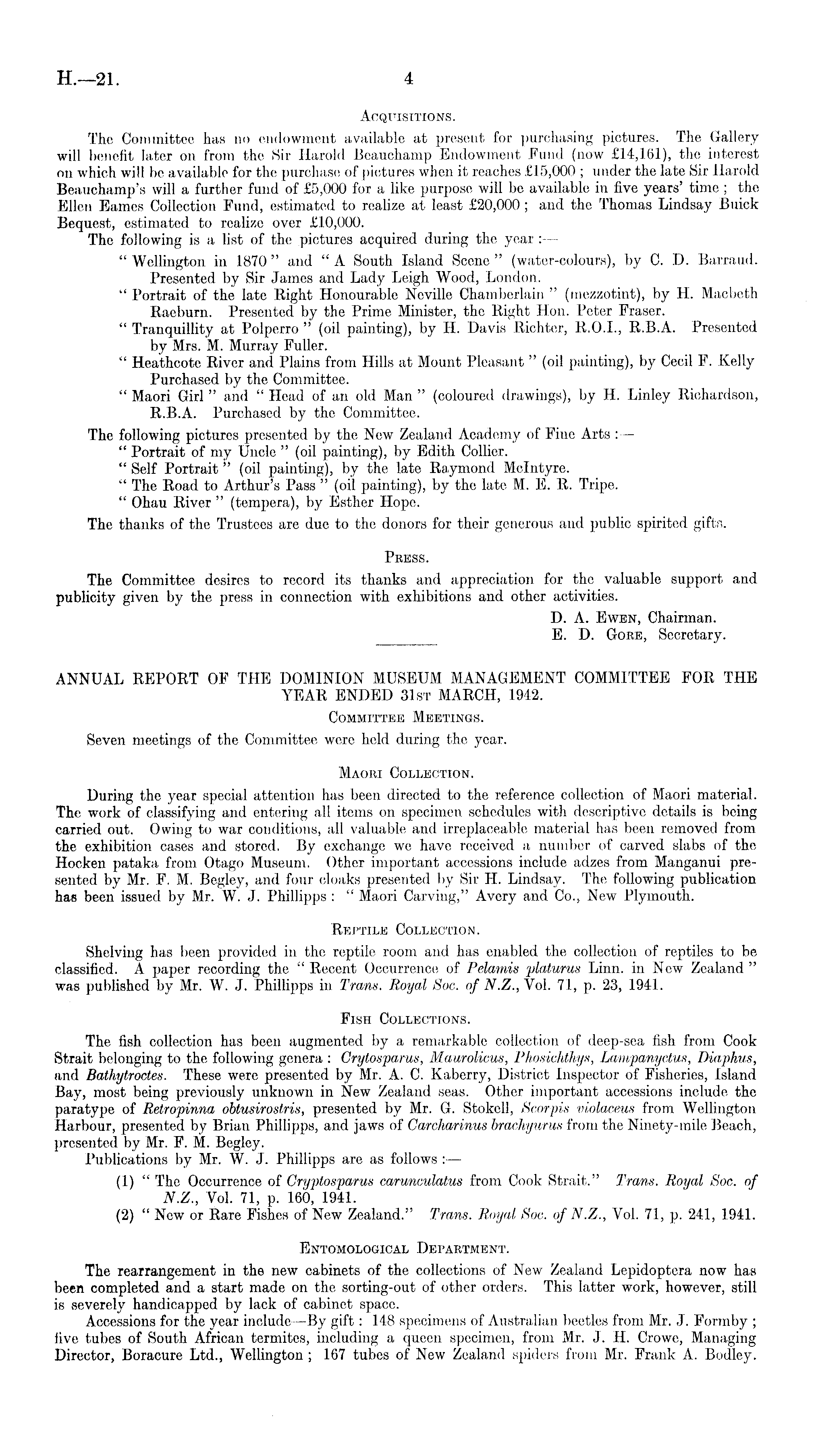 Acquisitions. The Committee has no endowment available at present for purchasing pictures. The Gallery will benefit later on from the Sir Harold Beauchamp Endowment Fund (now £14,161), the interest on which will be available for the purchase of pictures when it reaches £15,000 ; under the late Sir Harold Beauchamp's will a further fund of £5,000 for a like purpose will be available in five years' time ; the Ellen Eames Collection Fund, estimated to realize at least £20,000 ; and the Thomas Lindsay Buick Bequest, estimated to realize over £10,000. The following is a list of the pictures acquired during the year : — " Wellington in 1870 " and " A South Island Scene " (water-colours), by C. D. Barraud. Presented by Sir James and Lady Leigh Wood, London. " Portrait of the late Right Honourable Neville Chamberlain " (mezzotint), by H. Macbeth Raeburn. Presented by the Prime Minister, the Right Hon. Peter Fraser. " Tranquillity at Polperro " (oil painting), by H. Davis Richter, R. 0.1., R.B.A. Presented by Mrs. M. Murray Fuller. " Heathcote River and Plains from Hills at Mount Pleasant " (oil painting), by Cecil F. Kelly Purchased by the Committee. " Maori Girl" and " Head of an old Man " (coloured drawings), by H. Linley Richardson, R.B.A. Purchased by the Committee. The following pictures presented by the New Zealand Academy of Fine Arts :— " Portrait of my Uncle " (oil painting), by Edith Collier. " Self Portrait" (oil painting), by the late Raymond Mclntyre. " The Road to Arthur's Pass " (oil painting), by the late M. E. R. Tripe. " Ohau River " (tempera), by Esther Hope. The thanks of the Trustees are due to the donors for their generous and public spirited gifts. Press. The Committee desires to record its thanks and appreciation for the valuable support and publicity given by the press in connection with exhibitions and other activities. D. A. Ewen, Chairman. E. D. Gore, Secretary. ANNUAL REPORT OF THE DOMINION MUSEUM MANAGEMENT COMMITTEE FOR THE YEAR ENDED 31st MARCH, 1942. Committee Meetings. Seven meetings of the Committee were hold during the year. Maori Collection. During the year special attention has been directed to the reference collection of Maori material. The work of classifying and entering all items on specimen schedules with descriptive details is being carried out. Owing to war conditions, all valuable and irreplaceable material has been removed from the exhibition cases and stored. By exchange we have received a number of carved slabs of the Hocken pataka from Otago Museum. Other important accessions include adzes from Manganui presented by Mr. F. M. Begley, and four cloaks presented by Sir H. Lindsay. The following publication has been issued by Mr. W. J. Phillipps : " Maori Carving," Avery and Co., New Plymouth. Reptile Collection. Shelving has been provided in the reptile room and has enabled the collection of reptiles to be classified. A paper recording the " Recent Occurrence of Pelamis platurus Linn, in New Zealand " was published by Mr. W. J. Phillipps in Trans. Royal Soc. of N.Z., Vol. 71, p. 23, 1941. Fish Collections. The fish collection has been augmented by a remarkable collection of deep-sea fish from Cook Strait belonging to the following genera : Crytosparus, Maurolicus, Phosichthys, Lampanyctus, Diaphus, and Bathytroctes. These were presented by Mr. A. C. Kaberry, District Inspector of Fisheries, Island Bay, most being previously unknown in New Zealand seas. Other important accessions include the paratype of Retropinna obtusirostris, presented by Mr. G. Stokell, Scorpis violaceus from Wellington Harbour, presented by Brian Phillipps, and jaws of Carcharinus brackyurus from the Ninety-mile Beach, presented by Mr. F. M. Begley. Publications by Mr. W. J. Phillipps are as follows :— (1) " The Occurrence of Cryptosparus carunculatus from Cook Strait." Trans. Royal Soc. of N.Z., Vol. 71, p. 160, 1941. (2) " New or Rare Fishes of New Zealand." Trans. Royal Soc. of N.Z., Vol. 71, p. 241, 1941. Entomological Department. The rearrangement in the new cabinets of the collections of New Zealand Lepidoptera now has been completed and a start made on the sorting-out of other orders. This latter work, however, still is severely handicapped by lack of cabinet space. Accessions for the year include—By gift: 148 specimens of Australian beetles from Mr. J. Formby ; five tubes of South African termites, including a queen specimen, from Mr. J. H. Crowe, Managing Director, Boracure Ltd., Wellington ; 167 tubes of New Zealand spiders from Mr. Frank A. Bodley.