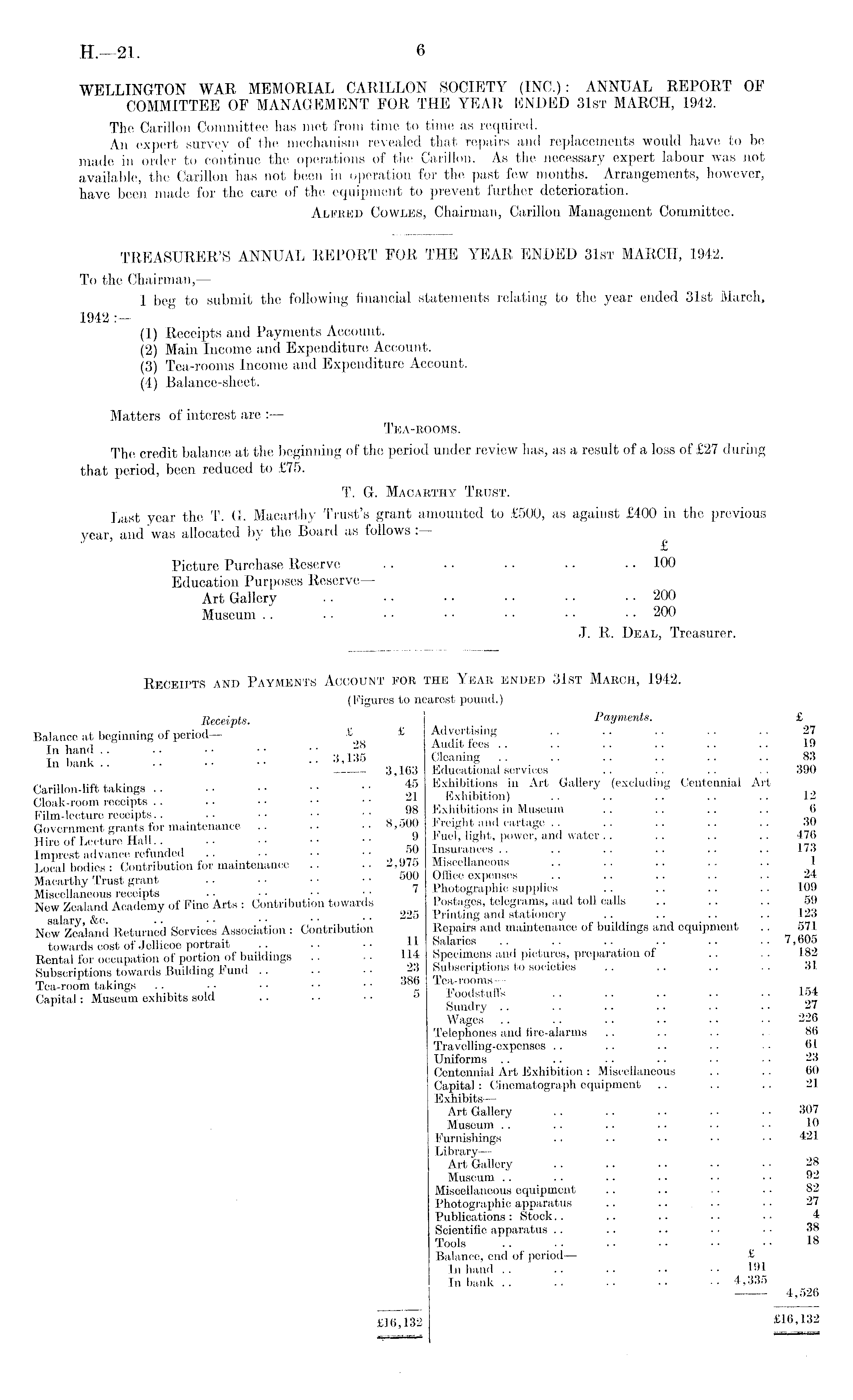 WELLINGTON WAR MEMORIAL CARILLON SOCIETY (INC.): ANNUAL REPORT OF COMMITTEE OF MANAGEMENT FOR THE YEAR ENDED 31st MARCH, 1942. The Carillon Committee has met from time to time as required. An expert survey of the mechanism revealed that repairs and replacements would have to be made in order to continue the operations of the Carillon. As the necessary expert labour was not available, the Carillon has not been in operation for the past few months. Arrangements, however, have been made for the care of the equipment to prevent further deterioration. Alfred Cowles, Chairman, Carillon Management Committee. TREASURER'S ANNUAL REPORT FOR THE YEAR ENDED 31st MARCH, 1942. To the Chairman,— I beg to submit the following financial statements relating to the year ended 31st March, 1942 :— (1) Receipts and Payments Account. (2) Main Income and Expenditure Account. (3) Tea-rooms Income and Expenditure Account. (4) Balance-sheet. Matters of interest are : — Tea-rooms. The credit balance at the beginning of the period under review has, as a result of a loss of £27 during that period, been reduced to £75. T. G. Macarthy Trust. Last year the T. G. Macarthy Trust's grant amounted to £500, as against £400 in the previous year, and was allocated by the Board as follows: Picture Purchase Reserve .. .. .. .. .. 100 Education Purposes ReserveArt Gallery . • • • • • • • • • • • 200 Museum .. .. • • ■ ■ • • • • • • 200 J. R. Deal, Treasurer. Receipts and Payments Account for the Year ended 31st March, 1942. (Figures to nearest pound.) Receipts. . . Payments. £ Balance at beginning of period— £ £ Advertising .. .. . . . . . . 27 In hand.. , , Audit fees 19 Tn bank .. •• ■■ 3 > 135 Cleaning .. .. .. .. .. .. 83 3,163 Educational services .. .. .. .. 390 Carillon-lift takings 45 Exhibitions in Art Gallery (excluding Centennial Art Cloak-room receipts .. . • • • ■ • • • „a t? i°" M " " " " r Film-lecture receipts 98 Exhibitions in Museum 6 Government grants for maintenance .. .. .. 8,000 Freight and cartage .. .. .. .. .. 30 Hire of Lecture Hall ® Fuel, light, power, and water 476 Imprest advance refunded 50 Insurances 173 Local bodies: Contribution for maintenance .. .. 2,970 Miscellaneous .. .. .. .. .. 1 Macarthy Trust grant 500 Office expenses 24 Miscellaneous receipts .. V 7 Photographic supplies 109 New Zealand Academy of Fine Arts : Contribution towards Postages, telegrams, and toll calls 59 salary &c • • • • • • 225 Printing and stationery .. .. .. .. 123 New Zealand Returned Services Association : Contribution Repairs and maintenance of buildings and equipment . . 571 towards cost of Jellicoe portrait .. .. •• | 1 Salaries .. .. .. .. .. ~7,605 Rental for occupation of portion of buildings .. .. 114 Specimens and pictures, preparation of .. .. 182 Subscriptions towards Building Fund 23 Subscriptions to societies 31 Tea-room takings 38 6 Te^ r0 , OI fV lfi4 Capital: Museum exhibits sold 5 foodstuffs 154 Wages .. .. .. . • .. • ■ 226 Telephones and fire-alarms .. .. .. . • 86 Travelling-expenses .. .. . ■ .. • • 61 Uniforms .. .. .. . • ■ • • • 23 Centennial Art Exhibition : Miscellaneous .. .. 60 Capital: Cinematograph equipment .. . . . . 21 Exhibits— Art Gallery . . .. .. .. ■ • 307 Museum . . .. .. . • • • • • 10 Furnishings .. .. . • • • • • 421 Library— Art Gallery .. .. .. ~ • • 28 Museum .. . . .. . • • • • • 92 Miscellaneous equipment .. .. . . . • 82 Photographic apparatus .. .. .. . • 27 Publications: Stock.. .. .. •• •• 4 Scientific apparatus .. .. .. • • ■ • 38 Tools 18 Balance, end of period— £ In hand .. .. .. ■• • • 191 In bank .. .. .. •• ..4,335 4,526 £16,!32 £16,132