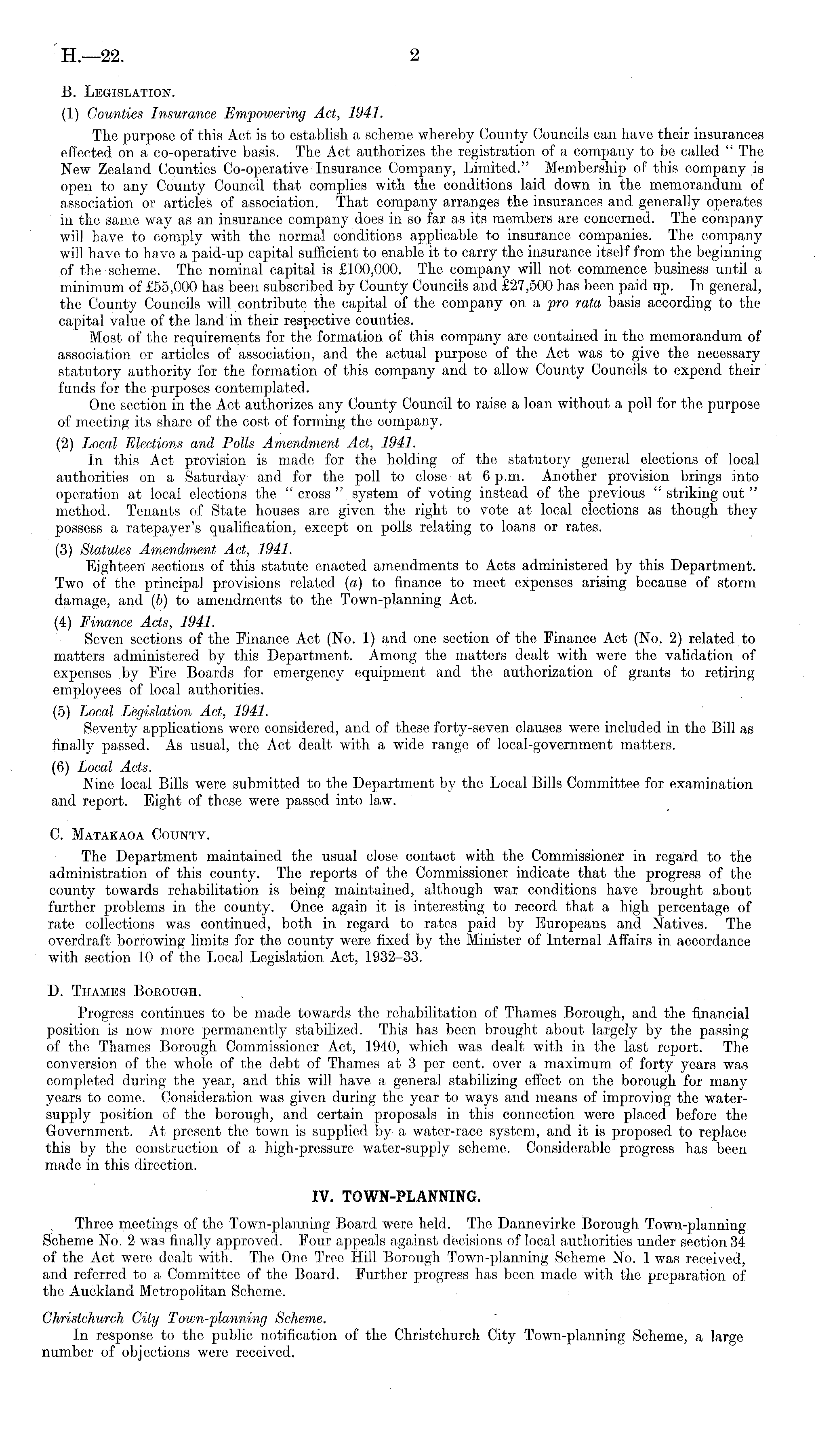 B. Legislation. (1) Counties Insurance Empowering Act, 1941. The purpose of this Act is to establish a scheme whereby County Councils can have their insurances effected on a co-operative basis. The Act authorizes the registration of a company to be called " The New Zealand Counties Co-operative Insurance Company, Limited." Membership of this company is open to any County Council that complies with the conditions laid down in the memorandum of association or articles of association. That company arranges the insurances and generally operates in the same way as an insurance company does in so far as its members are concerned. The company will have to comply with the normal conditions applicable to insurance companies. The company will have to have a paid-up capital sufficient to enable it to carry the insurance itself from the beginning of the scheme. The nominal capital is £100,000. The company will not commence business until a minimum of £55,000 has been subscribed by County Councils and £27,500 has been paid up. In general, the County Councils will contribute the capital of the company on a pro rata basis according to the capital value of the land in their respective counties. Most of the requirements for the formation of this company are contained in the memorandum of association or articles of association, and the actual purpose of the Act was to give the necessary statutory authority for the formation of this company and to allow County Councils to expend their funds for the purposes contemplated. One section in the Act authorizes any County Council to raise a loan without a poll for the purpose of meeting its share of the cost of forming the company. (2) Local Elections and Polls Amendment Act, 1941. In this Act provision is made for the holding of the statutory general elections of local authorities on a Saturday and for the poll to close at 6 p.m. Another provision brings into operation at local elections the " cross system of voting instead of the previous " striking out " method. Tenants of State houses are given the right to vote at local elections as though they possess a ratepayer's qualification, except on polls relating to loans or rates. (3) Statutes Amendment Act, 1941. Eighteen sections of this statute enacted amendments to Acts administered by this Department. Two of the principal provisions related (a) to finance to meet expenses arising because of storm damage, and (b) to amendments to the Town-planning Act. (4) Finance Acts, 1941. Seven sections of the Finance Act (No. .1) and one section of the Finance Act (No. 2) related to matters administered by this Department. Among the matters dealt with were the validation of expenses by Fire Boards for emergency equipment and the authorization of grants to retiring employees of local authorities. (5) Local Legislation Act, 1941. Seventy applications were considered, and of these forty-seven clauses were included in the Bill as finally passed. As usual, the Act dealt with a wide range of local-government matters. (6) Local Acts. Nine local Bills were submitted to the Department by the Local Bills Committee for examination and report. Eight of these were passed into law. C. Matakaoa County. The Department maintained the usual close contact with the Commissioner in regard to the administration of this county. The reports of the Commissioner indicate that the progress of the county towards rehabilitation is being maintained, although war conditions have brought about further problems in the county. Once again it is interesting to record that a high percentage of rate collections was continued, both in regard to rates paid by Europeans and Natives. The overdraft borrowing limits for the county were fixed by the Minister of Internal Affairs in accordance with section 10 of the Local Legislation Act, 1932-33. D. Thames Borough. Progress continues to be made towards the rehabilitation of Thames Borough, and the financial position is now more permanently stabilized. This has been brought about largely by the passing of the Thames Borough Commissioner Act, 1940, which was dealt with in the last report. The conversion of the whole of the debt of Thames at 3 per cent, over a maximum of forty years was completed during the year, and this will have a general stabilizing effect on the borough for many years to come. Consideration was given during the year to ways and means of improving the watersupply position of the borough, and certain proposals in this connection were placed before the Government. At present the town is supplied by a water-race system, and it is proposed to replace this by the construction of a high-pressure water-supply scheme. Considerable progress has been made in this direction. IV. TOWN-PLANNING. Three meetings of the Town-planning Board were held. The Dannevirke Borough Town-planning Scheme No. 2 was finally approved. Four appeals against decisions of local authorities under section 34 of the Act were dealt with. The One Tree Hill Borough Town-planning Scheme No. I was received, and referred to a Committee of the Board. Further progress has been made with the preparation of the Auckland Metropolitan Scheme. Christchurch City Town-planning Scheme. In response to the public notification of the Christchurch City Town-planning Scheme, a large number of objections were received.
