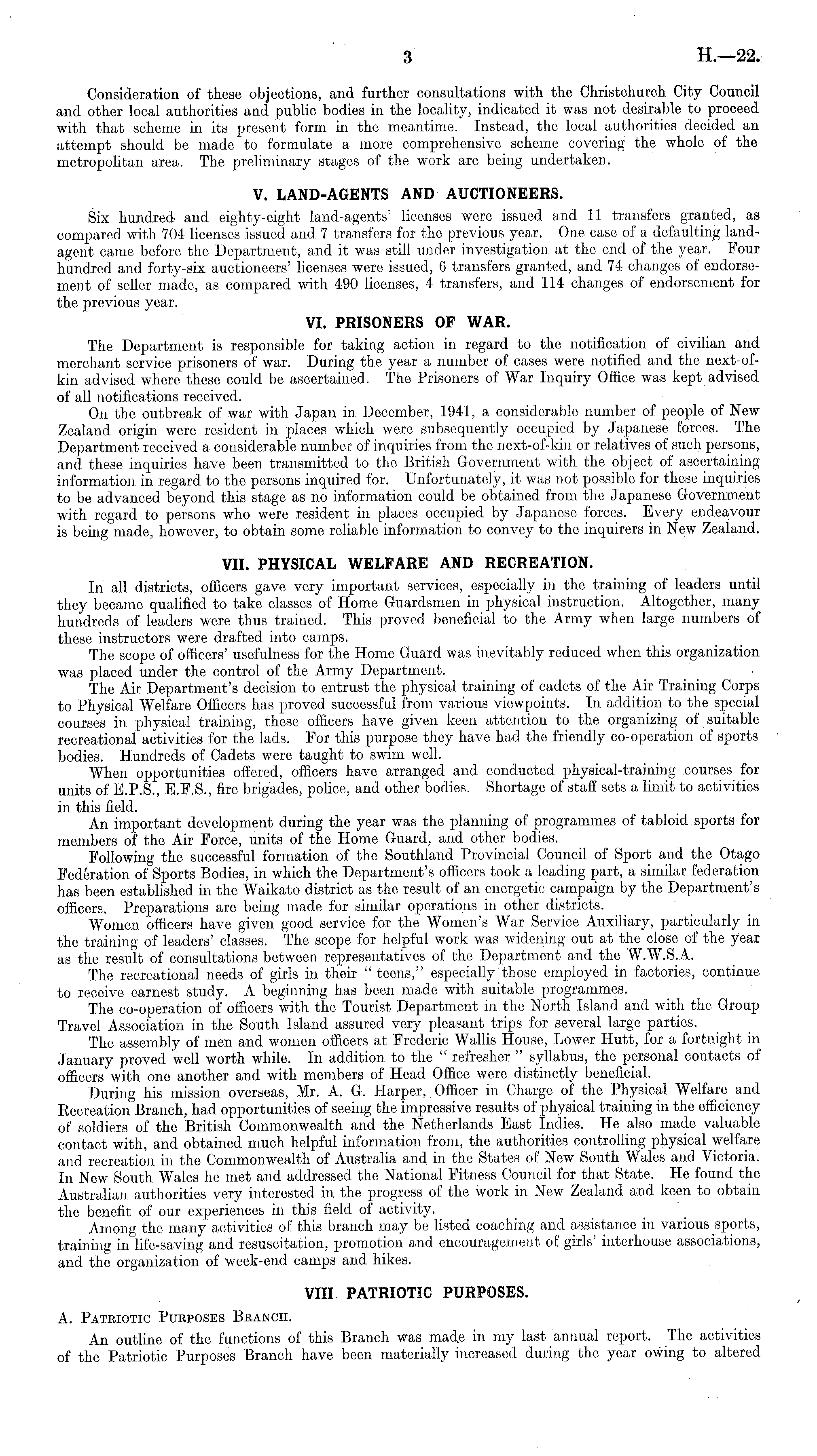 Consideration of these objections, and further consultations with the Christchurch City Council and other local authorities and public bodies in the locality, indicated it was not desirable to proceed with that scheme in its present form in the meantime. Instead, the local authorities decided an attempt should be made to formulate a more comprehensive scheme covering the whole of the metropolitan area. The preliminary stages of the work are being undertaken. V. LAND-AGENTS AND AUCTIONEERS. Six hundred and eighty-eight land-agents' licenses were issued and 11 transfers granted, as compared with 704 licenses issued and 7 transfers for the previous year. One case of a defaulting landagent came before the Department, and it was still under investigation at the end of the year. Four hundred and forty-six auctioneers' licenses were issued, 6 transfers granted, and 74 changes of endorsement of seller made, as compared with 490 licenses, 4 transfers, and 114 changes of endorsement for the previous year. VI. PRISONERS OF WAR. The Department is responsible for taking action in regard to the notification of civilian and merchant service prisoners of war. During the year a number of cases were notified and the next-of-kin advised where these could be ascertained. The Prisoners of War Inquiry Office was kept advised of all notifications received. On the outbreak of war with Japan in December, 1941, a considerable number of people of New Zealand origin were resident in places which were subsequently occupied by Japanese forces. The Department received a considerable number of inquiries from the next-of-kin or relatives of such persons, and these inquiries have been transmitted to the British Government with the object of ascertaining information in regard to the persons inquired for. Unfortunately, it was not possible for these inquiries to be advanced beyond this stage as no information could be obtained from the Japanese Government with regard to persons who were resident in places occupied by Japanese forces. Every endeavour is being made, however, to obtain some reliable information to convey to the inquirers in New Zealand. VII. PHYSICAL WELFARE AND RECREATION. In all districts, officers gave very important services, especially in the training of loaders until they became qualified to take classes of Home Guardsmen in physical instruction. Altogether, many hundreds of leaders were thus trained. This proved beneficial to the Army when large numbers of these instructors were drafted into camps. The scope of officers' usefulness for the Home Guard was inevitably reduced when this organization was placed under the control of the Army Department. The Air Department's decision to entrust the physical training of cadets of the Air Training Corps to Physical Welfare Officers has proved successful from various viewpoints. In addition to the special courses in physical training, these officers have given keen attention to the organizing of suitable recreational activities for the lads. For this purpose they have had the friendly co-operation of sports bodies. Hundreds of Cadets were taught to swim well. When opportunities offered, officers have arranged and conducted physical-training courses for units of E.P.S., E.F.S., fire brigades, police, and other bodies. Shortage of staff sets a limit to activities in this field. An important development during the year was the planning of programmes of tabloid sports for members of the Air Force, units of the Home Guard, and other bodies. Following the successful formation of the Southland Provincial Council of Sport and the Otago Federation of Sports Bodies, in which the Department's officers took a leading part, a similar federation has been established in the Waikato district as the result of an energetic campaign by the Department's officers. Preparations are being made for similar operations in other districts. Women officers have given good service for the Women's War Service Auxiliary, particularly in the training of leaders' classes. The scope for helpful work was widening out at the close of the year as the result of consultations between representatives of the Department and the W.W.S.A. The recreational needs of girls in their " teens," especially those employed in factories, continue to receive earnest study. A beginning has been made with suitable programmes. The co-operation of officers with the Tourist Department in the North Island and with the Group Travel Association in the South Island assured very pleasant trips for several large parties. The assembly of men and women officers at Frederic Wallis House, Lower Tlutt, for a fortnight in January proved well worth while. In addition to the " refresher syllabus, the personal contacts of officers with one another and with members of Head Office were distinctly beneficial. During his mission overseas, Mr. A. G. Harper, Officer in Charge of the Physical Welfare and Recreation Branch, had opportunities of seeing the impressive results of physical training in the efficiency of soldiers of the British Commonwealth and the Netherlands East Indies. He also made valuable contact with, and obtained much helpful information from, the authorities controlling physical welfare and recreation in the Commonwealth of Australia and in the States of New South Wales and Victoria. In New South Wales he met and addressed the National Fitness Council for that State. He found the Australian authorities very interested in the progress of the work in New Zealand and keen to obtain the benefit of our experiences in this field of activity. Among the many activities of this branch may be listed coaching and assistance in various sports, training in life-saving and resuscitation, promotion and encouragement of girls' interhouse associations, and the organization of week-end camps and hikes. VIII PATRIOTIC PURPOSES. A. Patriotic Purposes Branch. An outline of the functions of this Branch was mad.e in my last annual report. The acti