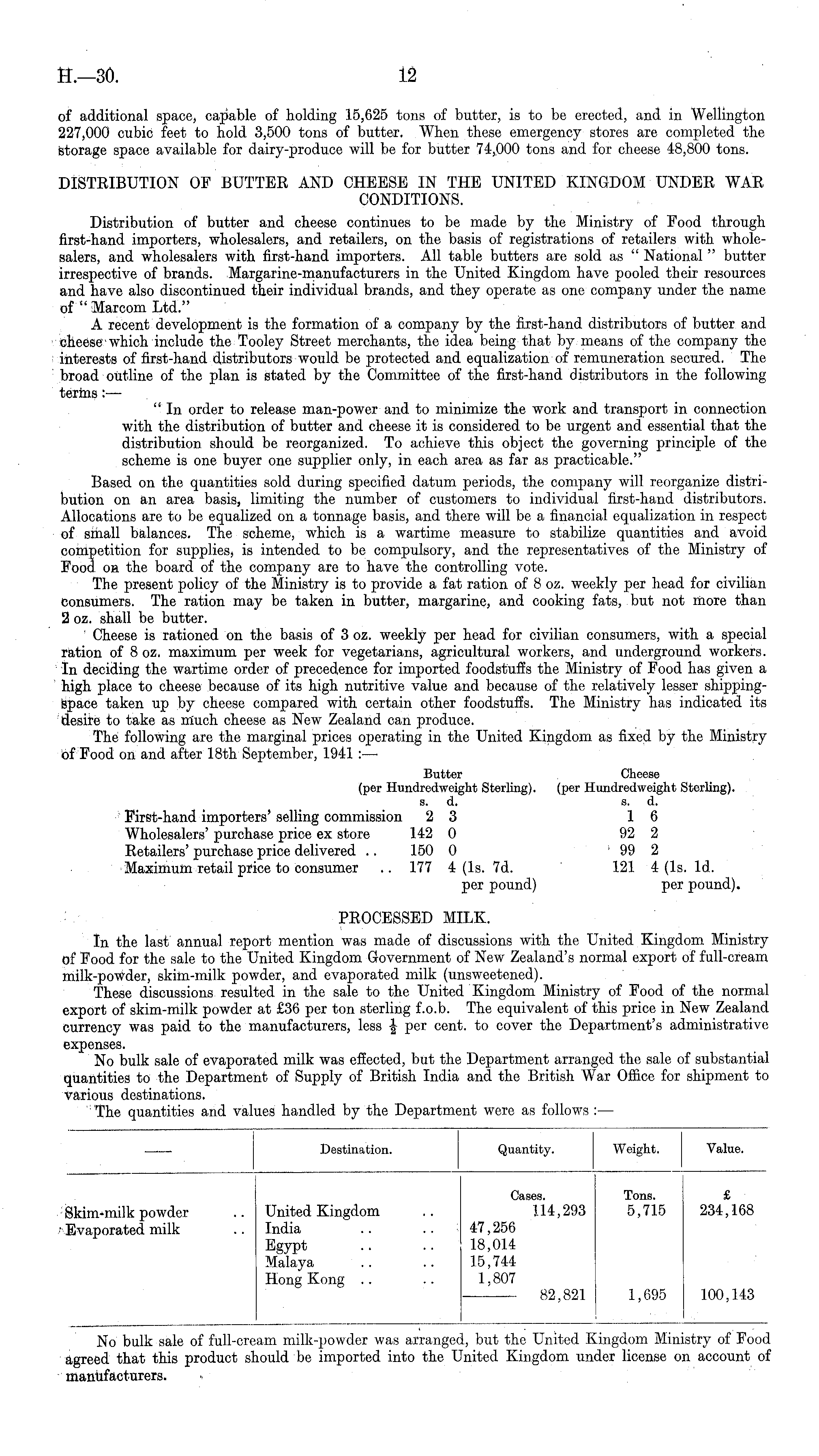 of additional space, capable of holding 15,625 tons of butter, is to be erected, and in Wellington 227,000 cubic feet to hold 3,500 tons of butter. When these emergency stores are completed the storage space available for dairy-produce will be for butter 74,000 tons and for cheese 48,800 tons. DISTRIBUTION OF BUTTER AND CHEESE IN THE UNITED KINGDOM UNDER WAR CONDITIONS. Distribution of butter and cheese continues to be made by the Ministry of Food through first-hand importers, wholesalers, and retailers, on the basis of registrations of retailers with wholesalers, and wholesalers with first-hand importers. All table butters are sold as " National " butter irrespective of brands. Margarine-manufacturers in the United Kingdom have pooled their resources and have also discontinued their individual brands, and they operate as one company under the name of " Marcom Ltd." A recent development is the formation of a company by the first-hand distributors of butter and cheese which include the Tooley Street merchants, the idea being that by means of the company the interests of first-hand distributors would bo protected and equalization of remuneration secured. The broad outline of the plan is stated by the Committee of the first-hand distributors in the following terhis :— " In order to release man-power and to minimize the work and transport in connection with the distribution of butter and cheese it is considered to be urgent and essential that the distribution should be reorganized. To achieve this object the governing principle of the scheme is one buyer one supplier only, in each area as far as practicable." Based on the quantities sold during specified datum periods, the company will reorganize distribution on an area basis, limiting the number of customers to individual first-hand distributors. Allocations are to be equalized on a tonnage basis, and there will be a financial equalization in respect of small balances. The scheme, which is a wartime measure to stabilize quantities and avoid competition for supplies, is intended to be compulsory, and the representatives of the Ministry of Food oh the board of the company are to have the controlling vote. The present policy of the Ministry is to provide a fat ration of 8 oz. weekly per head for civilian consumers. The ration may be taken in butter, margarine, and cooking fats, but not more than 2 oz. shall be butter. Cheese is rationed on the basis of 3 oz. weekly per head for civilian consumers, with a special ration of 8 oz. maximum per week for vegetarians, agricultural workers, and underground workers. In deciding the wartime order of precedence for imported foodstuffs the Ministry of Food has given a high place to cheese because of its high nutritive value and because of the relatively lesser shippinggpace taken up by cheese compared with certain other foodstuffs. The Ministry has indicated its desire to take as much cheese as New Zealand can produce. The following are the marginal prices operating in the United Kingdom as fixed by the Ministry of Food on and after 18th September, 1941 : —■ Butter Cheese (per Hundredweight Sterling). (per Hundredweight Sterling). s. d. s. d. First-hand importers' selling commission 2 3 16 Wholesalers' purchase price ex store 142 0 92 2 Retailers' purchase price delivered 150 0 ' 99 2 Maximum retail price to consumer .. 177 4 (Is. 7d. 121 4 (Is. Id. per pound) per pound). PROCESSED MILK. In the last annual report mention was made of discussions with the United Kingdom Ministry of Food for the sale to the United Kingdom Government of New Zealand's normal export of full-cream milk-powder, skim-milk powder, and evaporated milk (unsweetened). These discussions resulted in the sale to the United Kingdom Ministry of Food of the normal export of skim-milk powder at £36 per ton sterling f.o.b. The equivalent of this price in New Zealand currency was paid to the manufacturers, less -J per cent, to cover the Department's administrative expenses. No bulk sale of evaporated milk was effected, but the Department arranged the sale of substantial quantities to the Department of Supply of British India and the British War Office for shipment to various destinations. The quantities and values handled by the Department were as follows : —