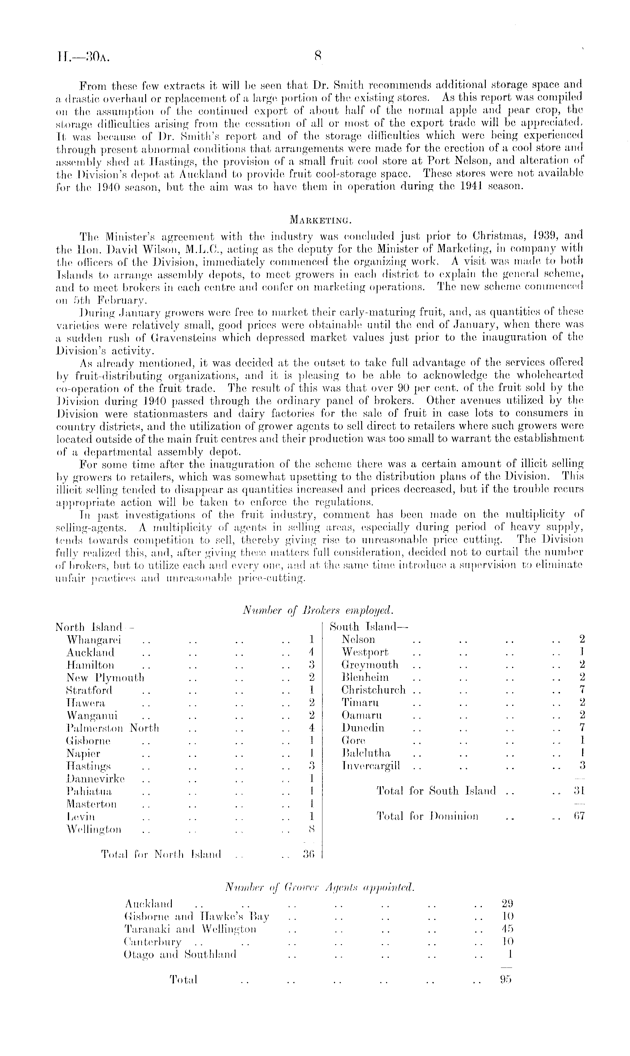 From these few extracts it will be segn that Dr, Smith recommends additional storage space and a drastic overhaul or replacement of a large portion of the existing stores. As this report was compiled on the assumption of the continued export of about half of the normal apple and pear crop, the storage difficulties arising from the cessation of all or most of the export trade will be appreciated, It was because of Dr. Smith's report and of the storage difficulties which were being experienced through present abnormal conditions that arrangements were made for the erection of a cool store and assembly shed at Hastings, the provision of a small fruit cool store at Port Nelson, and alteration of the Division's depot at Auckland to provide fruit cool-storage space. These stores were not available for the 1940 season, but the aim was to have them in operation during the 1941 season. Marketing. The Minister's agreement with the industry was concluded just prior to Christmas, 1939, and the Hon. David Wilson, M.L.C., acting as the deputy for the Minister of Marketing, in company with the officers of the Division, immediately commenced the organizing work, A visit was made to both Islands to arrange assembly depots, to meet growers in each district to explain the general scheme, and to meet brokers in each centre and confer on marketing operations. The new scheme commenced on sth February. During January growers were free to market their early-maturing fruit, and, as quantities of these varieties were relatively small, good priccs were obtainable until the end of January, when there was a sudden rush of Gravensteins which depressed market values just prior to the inauguration of the Division's activity. As already mentioned, it was decided at the outset to take full advantage of the services offered by fruit-distributing organizations, and it is pleasing to be able to acknowledge the wholehearted co-operation of the fruit trade. The result of this was that over 90 per cent, of the fruit sold by the Division during 1940 passed through the ordinary panel of brokers. Other avenues utilized by the Division were stationmasters and dairy factories for the sale of fruit in case lots to consumers in country districts, and the utilization of grower agents to sell direct to retailers whore such growers were located outside of the main fruit centres and their production was too small to warrant the establishment of a departmental assembly depot. For some time after the inauguration of the scheme there was a certain amount of illicit selling by growers to retailers, which was somewhat upsetting to the distribution plans of the Division. This illicit selling tended to disappear as quantities increased and prices decreased, but if the trouble recurs appropriate action will be taken to enforce the regulations. In past investigations of the fruit industry, comment has been made on the multiplicity of selling-agents. A multiplicity of agents in selling areas, especially during period of heavy supply, tends towards competition to sell, thereby giving rise to unreasonable price cutting. The Division fully realized this, and, after giving these matters fall consideration, decided not to curtail the number of brokers, but to utilize each and every one, and at the same time introduce a supervision to eliminate unfair practices and unreasonable price-cutting. Number of Brokers employed. North Island— South Island— Whangarei .. .. .. 1 Nelson .. .. .. 2 Auckland .. .. .. 4 Westport .. .. .. 1 Hamilton .. .. .. 3 Greymouth . . .. .. 2 New Plymouth .. . . 2 Blenheim .. .. . . 2 Stratford .. .. .. 1 Christchurch .. .. .. 7 Hawera .. .. .. 2 Timaru .. .. .. 2 Wanganui .. . . . . 2 Oamaru .. .. .. 2 Palmerston North . . . . .. 4 Dunedin . . . . . . 7 Gisborne .. .. .. 1 Gore .. .. .. 1 Napier .. .. .. 1 Balclutha .. .. .. .. 1 Hastings .. .. .. 3 Invercargill .. .. .. 3 Dannevirke ........ 1 — Pahiatua .. .. .. 1 Total for South Island .. 31 Masterton ........ 1 Levin .. .. .. 1 Total for Dominion .. G7 Wellington .. . . .. 8 Total for North Island .. .. 36 Number of Grower Agents appointed. Auckland .. .. .. .. .. .. 29 Gisborne and Hawke's Bay .. .. .. .. 10 Taranaki and Wellington . . .. .. .. 45 Canterbury .. . . .. . . . . .. 10 Otago and Southland .. . . . . .. .. 1 Total ~ ~ .. .. .. .. 95