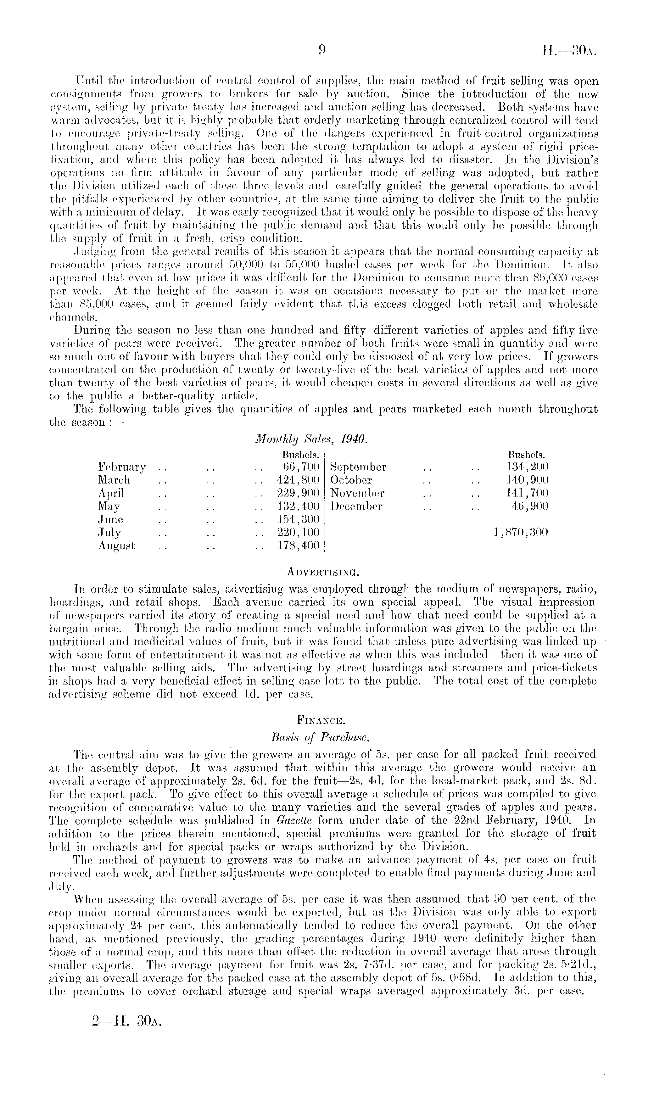 Until the introduction of central control of supplies, the main method of fruit selling was open consignments from growers to brokers for sale by auction. Since the introduction of the new system, selling by private treaty has increased and auction selling has decreased. Both systems have warm advocates, but it is highly probable that orderly marketing through centralized control will tend to encourage private-treaty selling. One of the dangers experienced in fruit-control organizations throughout many other countries has been the strong temptation to adopt a system of rigid pricefixation, and where this policy has been adopted it has always led to disaster. In the Division's operations no firm attitude in favour of any particular mode of selling was adopted, but rather the Division utilized each of these three levels and carefully guided the general operations to avoid the pitfalls experienced by other countries, at the same time aiming to deliver the fruit to the public with a minimum of delay. It was early recognized that it would only be possible to dispose of the heavy quantities of fruit by maintaining the public demand and that this would only be possible through the supply of fruit in a fresh, crisp condition. Judging from the general results of this season it appears that the normal consuming capacity at reasonable prices ranges around 50,000 to 55,000 bushel cases per week for the Dominion. It also appeared that even at low prices it was difficult for the Dominion to consume more than 85,000 cases per week. At the height of the season it was on occasions necessary to put on the market more than 85,000 cases, and it seemed fairly evident that this excess clogged both retail and wholesale channels. During the season no less than one hundred and fifty different varieties of apples and fifty-five varieties of pears were received. The greater number of both fruits were small in quantity and were so much out of favour with buyers that they could only be disposed of at very low prices. If growers concentrated on the production of twenty or twenty-five of the best varieties of apples and not more than twenty of the best varieties of pears, it would cheapen costs in several directions as well as give to the public a better-quality article. The following table gives the quantities of apples and pears marketed each month throughout the season Monthly Sales, 1940. Bushels. Bushels. February .. .. .. 66,700 September .. .. 134,200 March .. .. .. 424,800 October .. .. 140,900 April .. .. .. 229,900 November .. .. 141,700 May .. .. .. 132,400 December .. .. 46,900 June .. .. .. 154,300 July .. .. .. 220,100 1,870,300 August .. .. .. 178,400 Advertising. In order to stimulate sales, advertising was employed through the medium of newspapers, radio, hoardings, and retail shops. Each avenue carried its own special appeal. The visual impression of newspapers carried its story of creating a special need, and how that need could be supplied at a bargain price. Through the radio medium much valuable information was given to the public on the nutritional and medicinal values of fruit, but it was found that unless pure advertising was linked up with some form of entertainment it was not as effective as when this was included—then it was one of the most valuable selling aids. The advertising by street hoardings and streamers and price-tickets in shops had a very beneficial effect in selling case lots to the public. The total cost of the complete advertising scheme did not exceed Id. per case. Finance. Basis of Purchase. The central aim was to give the growers an average of ss. per case for all packed fruit received at the assembly depot. It was assumed that within this average the growers would receive an overall average of approximately 2s. 6d. for the fruit —2s. 4d. for the local-market pack, and 2s. Bd. for the export pack. To give effect to this overall average a schedule of prices was compiled to give recognition of comparative value to the many varieties and the several grades of apples and pears. The complete schedule was published in Gazette form under date of the 22nd February, 1940. In addition to the prices therein mentioned, special premiums were granted for the storage of fruit held in orchards and for special packs or wraps authorized by the Division. The method of payment to growers was to make an advance payment of 4s. per case on fruit received each week, and further adjustments were completed to enable final payments during June and July. When assessing the overall average of ss. per case it was then assumed that 50 per cent, of the crop under normal circumstances would be exported, but as the Division was only able to export approximately 24 per cent, this automatically tended to reduce the overall payment. On the other hand, as mentioned previously, the grading percentages during 1940 were. definitely higher than those of a normal crop, and this more than offset the reduction in overall average that arose through smaller exports. The average payment for fruit was 2s. 7-37 d. per case, and for packing 2s. 5-21 d., giving an overall average for the packed case at the assembly depot of ss. 0-58 d. In addition to this, the premiums to cover orchard storage and special wraps averaged approximately 3d. per case.