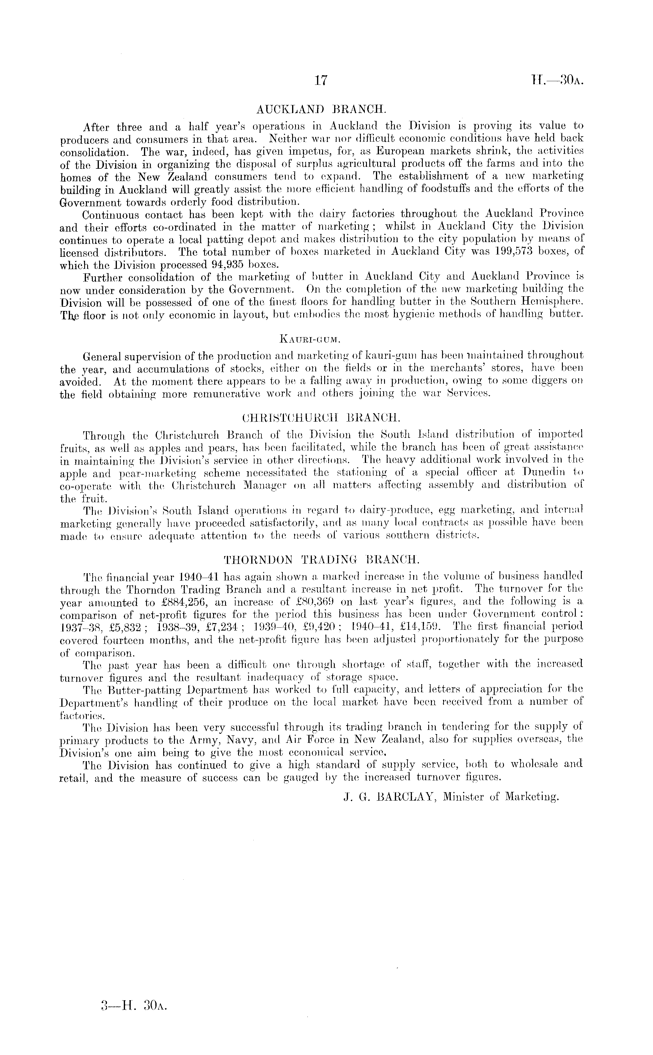 AUCKLAND BRANCH. After three and a half year's operations in Auckland the Division is proving its value to producers and consumers in that area. Neither war nor difficult economic conditions have held back consolidation. The war, indeed, has given impetus, for, as European markets shrink, the activities of the Division in organizing the disposal of surplus agricultural products off the farms and into the homes of the New Zealand consumers tend to expand. The establishment of a new marketing building in Auckland will greatly assist the more efficient handling of foodstuffs and the efforts of the Government towards orderly food distribution. Continuous contact has been kept with the dairy factories throughout the Auckland Province and their efforts co-ordinated in the matter of marketing ; whilst in Auckland City the Division continues to operate a local patting depot and makes distribution to the city population by means of licensed distributors. The total number of boxes marketed in Auckland City was 199,573 boxes, of which the Division processed 94,935 boxes. Further consolidation of the marketing of butter in Auckland City and Auckland Province is now under consideration by the Government. On the completion, of the new marketing building the Division will be possessed of one of the finest floors for handling butter in the Southern Hemisphere. Thp floor is not only economic in layout, but embodies the most hygienic methods of handling butter. Kauri-gum. General supervision of the production and marketing of kauri-gum has been maintained throughout the year, and accumulations of stocks, either on the fields or in the merchants' stores, have been avoided. At the moment there appears to be a falling away in production, owing to some diggers on the field obtaining more remunerative work and others joining the war Services. CHRISTCHURCH BRANCH. Through the Christchurch Branch of the Division the South Island distribution of imported fruits, as well as apples and pears, has been facilitated, while the branch has been of great assistance in maintaining the Division's service in other directions. The heavy additional work involved in the apple and pear-marketing scheme necessitated the stationing of a special officer at Dunedin to co-operate with the Christchurch Manager on all matters affecting assembly and distribution of the fruit. The Division's South Island operations in regard to dairy-produce, egg marketing, and internal marketing generally have proceeded satisfactorily, and as many local contracts as possible have been made to ensure adequate attention to the needs of various southern districts. THORNDON TRADING BRANCH. The financial year 1940-41 has again shown a marked increase in the volume of business handled through the Thorndon Trading Branch and a resultant increase in net profit. The turnover for the year amounted to £884,256, an increase of £80,369 on last year's figures, and the following is a comparison of net-profit figures for the period this business has been under Government control: 1937-38, £5,832 ; 1938-39, £7,234 ; 1939-40, £9,420 ; 1940-41, £14,159. The first financial period covered fourteen months, and the net-profit figure has been adjusted proportionately for the purpose of comparison. The past year has been a difficult one through shortage of staff, together with the increased turnover figures and the resultant inadequacy of storage space. The Butter-patting Department has worked to full capacity, and letters of appreciation for the Department's handling of their produce on the local market have been received from a number of factories. The Division has been very successful through its trading branch in tendering for the supply of primary products to the Army, Navy, and Air Force in New Zealand, also for supplies overseas, the Division's one aim being to give the most economical service. The Division has continued to give a high standard of supply service, both to wholesale and retail, and the measure of success can be gauged by the increased turnover figures. J. G. BARCLAY, Minister of Marketing.