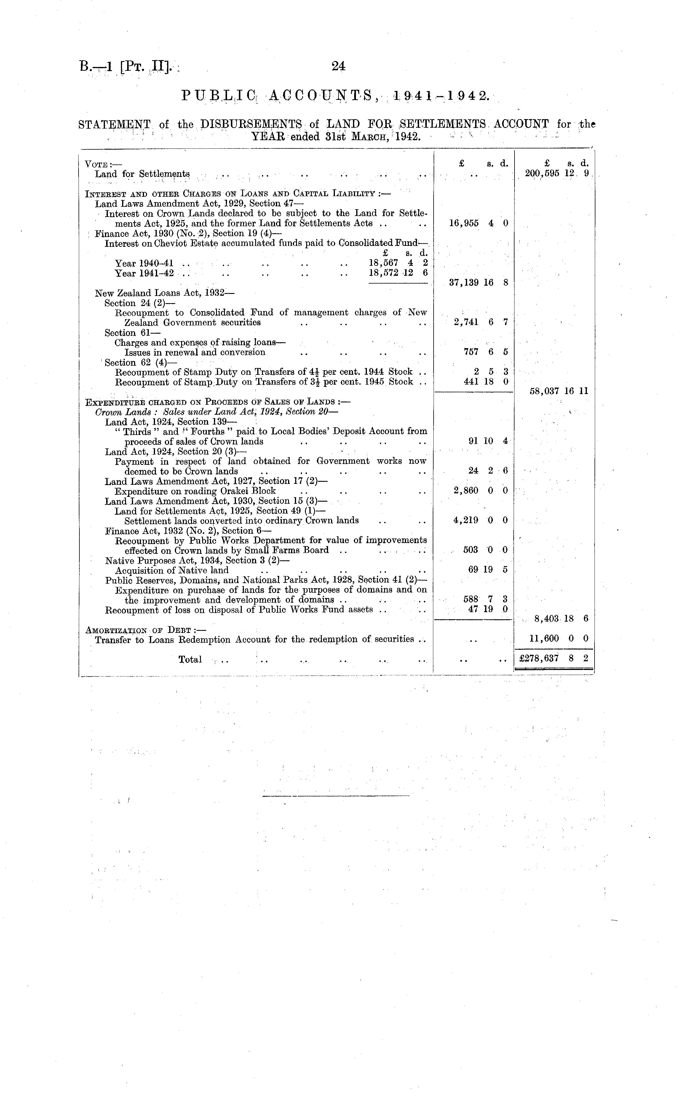 Vote: —■ £ s. d. £ s. d. Land for Settlements .. ... .. .. .. .. .. 200,595 12 9 Interest and other Charges on Loans and Capital Liability :— Land Laws Amendment Act, .1929, Section 47 —■ Interest on Crown Lands declared to be subject to the Land for Settlements Act, 1925, and the former Land for Settlements Acts .. .. 16,955 4 0 Finance Act, 1930 (No. 2), Section 19 (4) — Interest on Cheviot Estate accumulated funds paid to Consolidated Fund— £ s. d. Year 1940-41 .. .. .. .. .. 18,507 4 2 Year 1941-42 .. .. .. .. .. 18,572 12 6 37,139 16 8 New Zealand Loans Act, 1932— Section 24 (2) — Recoupment to Consolidated Fund of management charges of Now Zealand Government securities .. .. .. .. 2,741 6 7 Section 61 — Charges and expenses of raising loans— Issues in renewal and conversion .. .. .. .. 757 6 5 Section 62 (4) — Recoupment of Stamp Duty on Transfers of 4J per cent. 1944 Stock .. 2 5 3 Recoupment of Stamp Duty on Transfers of 3| per cent. 1945 Stock .. 441 18 0 58,037 16 11 Expenditure charged on Proceeds of Sales of Lands :— Crown Lands : Sales under Land Act, 1924, Section 20 — Land Act, 1924, Section 139 — " Thirds " and " Fourths " paid to Local Bodies' Deposit Account from proceeds of sales of Crown lands .. .. .. .. 91 10 4 Land Act, 1924, Section 20 (3) — Payment in respect of land obtained for Government works now deemed to be Crown lands .. .. .. .. .. 24 2 6 Land Laws Amendment Act, 1927, Section 17 (2) — Expenditure on roading Orakei Block . . .. .. .. 2,860 0 0 Land Laws Amendment Act, 1930, Section 15 (3) — Land for Settlements Apt, 1925, Section 49 (1) — Settlement lands converted into ordinary Crown lands .. .. 4,219 0 0 Finance Act, 1932 (No. 2), Section 6— Recoupment by Public Works Department for value of improvements effected on Crown lands by Small Farms Board .. .. .. 503 0 0 Native Purposes Act, 1934, Section 3 (2) — Acquisition of Native land .. .. .. .. .. 69 19 5 Public Reserves, Domains, and National Parks Act, 1928, Section 41 (2) — Expenditure on purchase of lands for the purposes of domains and on the improvement and development of domains .. .. .. 588 7 3 Recoupment of loss on disposal of Public Works Fund assets .. .. 47 19 0 8,403 18 6 Amortization of Debt : — Transfer to Loans Redemption Account for the redemption of securities .. .. 11,600 0 0 Total ... .. ... .. .. ... .. .. £278,637 8 2