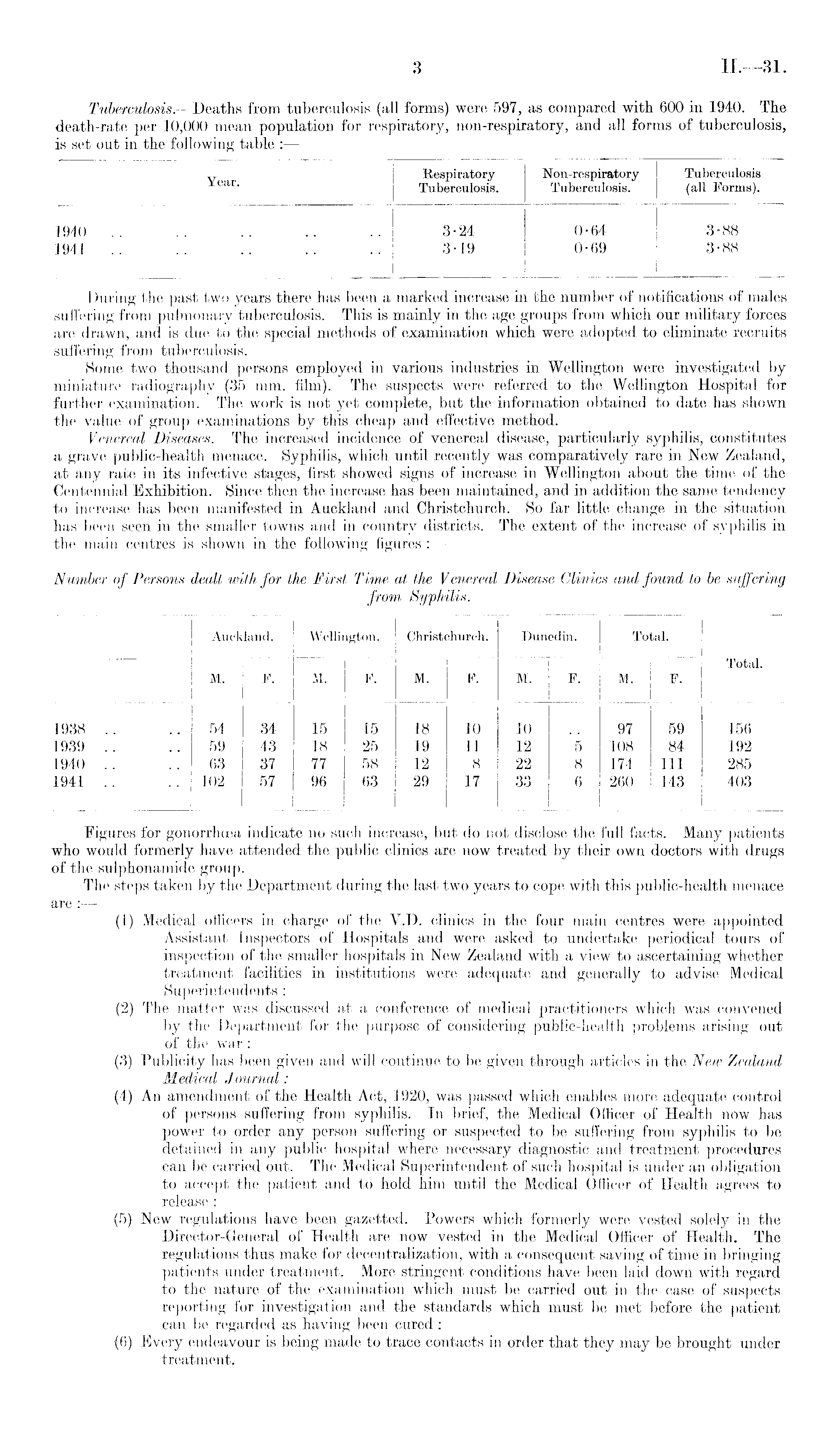 During the past two years there has been a marked increase in the number of notifications of males suffering from pulmonary tuberculosis. This is mainly in the age groups from which our military forces are drawn, and is due to the special methods of examination which were adopted to eliminate recruits suffering from tuberculosis. Some two thousand persons employed in various industries in Wellington were investigated by miniature radiography (35 mm. film). The suspects were referred to the Wellington Hospital for further examination. The work is not yet complete, but the information obtained to date has shown the value of group examinations by this cheap and effective method. Venereal Diseases. —The increased incidence of venereal disease, particularly syphilis, constitutes a grave public-health menace. Syphilis, which until recently was comparatively rare in New Zealand, at any rate in its infective stages, first showed signs of increase in Wellington about the time of the Centennial Exhibition. Since then the increase has been maintained, and in addition the same tendency to increase has been manifested in Auckland and Christchurch. So far little change in the situation has been seen in the smaller towns and in country districts. The extent of the increase of syphilis in the main centres is shown in the following figures : —