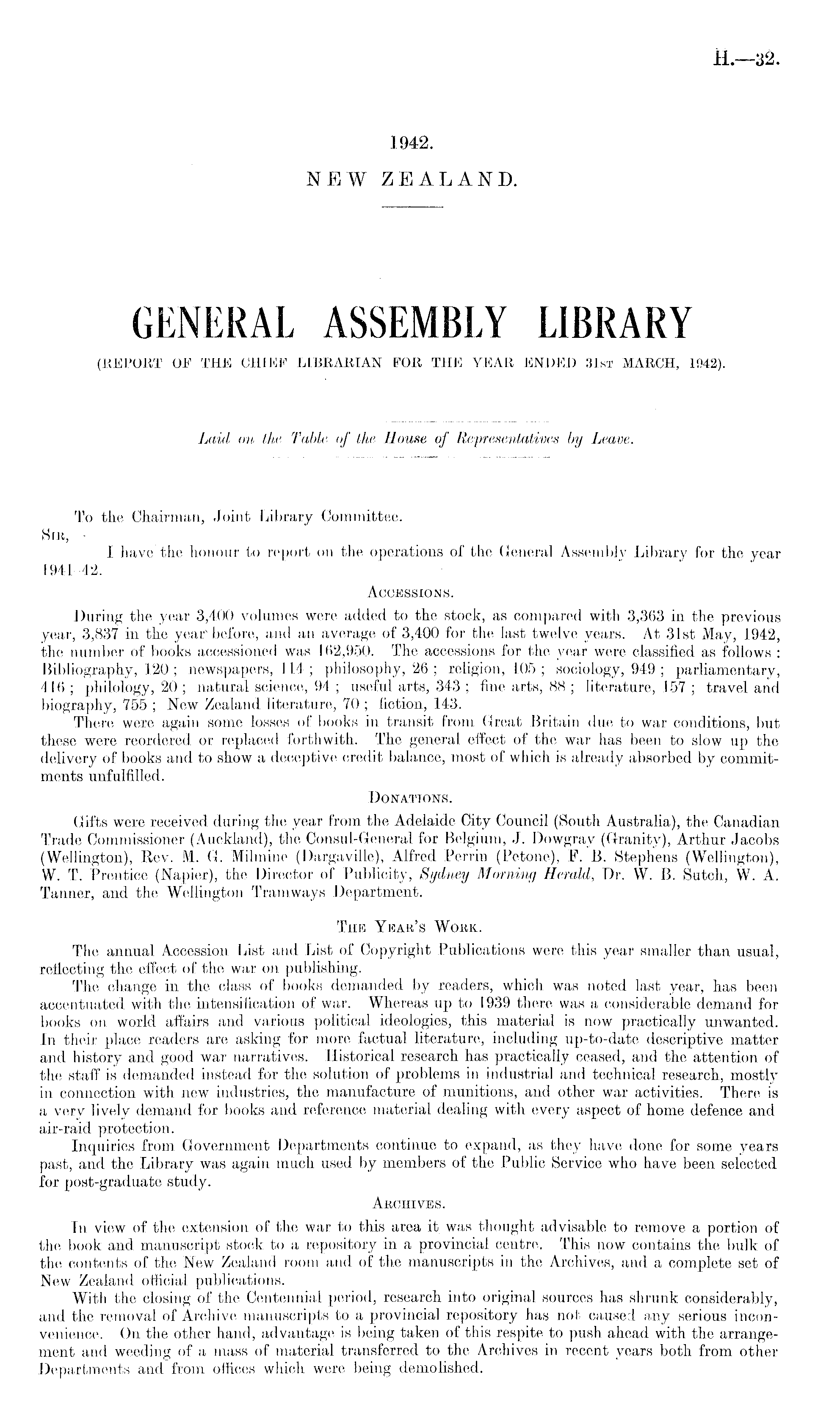 To the Chairman, Joint Library Committee. Sir, — I have the honour to report 011 the operations of the General Assembly Library for the year 1941-42. Accessions. Daring the year 3,400 volumes were added to the stock, as compared with 3,363 in the previous year, 3,837 in the year before, and an average of 3,400 for the last twelve years. At 31st May, 1942, the number of books accessioned was 162,950. The accessions for the year were classified as follows : Bibliography, 120 ; newspapers, 114 ; philosophy, 26 ; religion, 105 ; sociology, 949 ; parliamentary, 416 ; philology, 20 ; natural science, 94 ; useful arts, 343 ; fine arts, 88 ; literature, 157 ; travel and biography, 755 ; New Zealand literature, 70 ; fiction, 143. There were again some losses of books in transit from Great Britain due to war conditions, but these were reordered or replaced forthwith. The general effect of the war has been to slow up the delivery of books and to show a deceptive credit balance, most of which is already absorbed by commitments unfulfilled. Donations. Gifts were received during the year from the Adelaide City Council (South Australia), the Canadian Trade Commissioner (Auckland), the Consul-General for Belgium, J. Dowgray (Granitv), Arthur Jacobs (Wellington), Rev. M. G. Milmine (Dargaville), Alfred Perrin (Petone), P. B. Stephens (Wellington), W. T. Prentice (Napier), the Director of Publicity, Sydney Morning Herald, Dr. W. B. Sutch, W. A. Tanner, and the Wellington Tramways Department. The Year's Work. The annual Accession List and List of Copyright Publications were this year smaller than usual, reflecting the effect of the war on publishing. The change in the class of books demanded by readers, which was noted last year, has been accentuated with the intensification of war. Whereas up to 1939 there was a considerable demand for books on world affairs and various political ideologies, this material is now practically unwanted. In their place readers are asking for more factual literature, including up-to-date descriptive matter and history and good war narratives. Historical research has practically ceased, and the attention of the staff is demanded instead for the solution of problems in industrial and technical research, mostly in connection with new industries, the manufacture of munitions, and other war activities. There is a very lively demand for books and reference material dealing with every aspect of home defence and air-raid protection. Inquiries from Government Departments continue to expand, as they have done for some years past, and the Library was again much used by members of the Public Service who have been selected for post-graduate study. Archives. In view of the extension of the war to this area it was thought advisable to remove a portion of the book and manuscript stock to a repository in a provincial centre. This now contains the bulk of the contents of the New Zealand room and of the manuscripts in the Archives, and a complete set of New Zealand official publications. With the closing of the Centennial period, research into original sources has shrunk considerably, and the removal of Archive manuscripts to a provincial repository has not caused any serious inconvenience. On the other hand, advantage is being taken of this respite to push ahead with the arrangement and weeding of a mass of material transferred to the Archives in recent years both from other Departments and from offices which were being demolished.