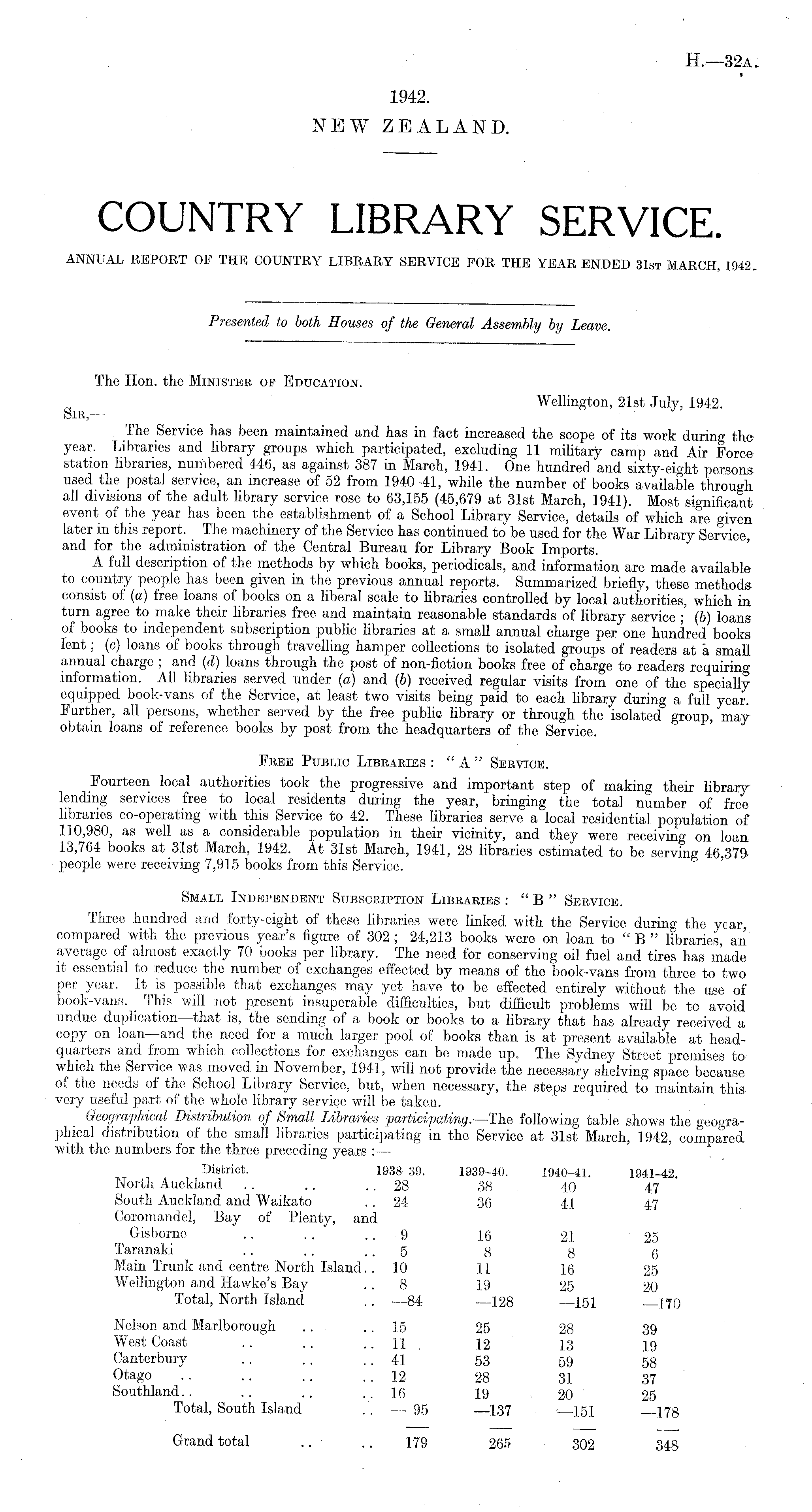 Presented to both Houses of the General Assembly by Leave. The Hon. the Minister of Education. Wellington, 21st July, 194-2. Sir, — The Service has been maintained and has in fact increased the scope of its work during the year. Libraries and library groups which participated, excluding 11 military camp and Air Force station libraries, numbered 446, as against 387 in March, 1941. One hundred and sixty-eight persons, used the postal service, an increase of 52 from 1940-41, while the number of books available through all divisions of the adult library service rose to 63,155 (45,679 at 31st March, 1941). Most significant event of the year has been the establishment of a School Library Service, details of which are given later in this report. The machinery of the Service has continued to be used for the War Library Service, and for the administration of the Central Bureau for Library Book Imports. A full description of the methods by which books, periodicals, and information are made available to country people has been given in the previous annual reports. Summarized briefly, these methods consist of (a) free loans of books on a liberal scale to libraries controlled by local authorities, which in turn agree to make their libraries free and maintain reasonable standards of library service (b) loans of books to independent subscription public libraries at a small annual charge per one hundred books lent; (c) loans of books through travelling hamper collections to isolated groups of readers at a small annual charge ; and (d) loans through the post of non-fiction books free of charge to readers requiring information. All libraries served under (a) and (b) received regular visits from one of the specially equipped book-vans of the Service, at least two visits being paid to each library during a full year. Further, all persons, whether served by the free public library or through the isolated group, may obtain loans of reference books by post from the headquarters of the Service. Free Public Libraries : "A" Service. Fourteen local authorities took the progressive and important step of making their library lending services free to local residents during the year, bringing the total number of free libraries co-operating with this Service to 42. These libraries serve a local residential population of 110,980, as well as a considerable population in their vicinity, and they were receiving on loan 13,764 books at 31st March, 1942. At 31st March, 1941, 28 libraries estimated to be serving 46,379' people were receiving 7,915 books from this Service. Small Independent Subscription Libraries : "B " Service. Three hundred and forty-eight of these libraries were linked with the Service during the year compared with the previous year's figure of 302; 24,213 books were on loan to "B" libraries, an average of almost exactly 70 books per library. The need for conserving oil fuel and tires has made it essential to reduce the number of exchanges effected by means of the book-vans from three to two per year. It is possible that exchanges may yet have to be effected entirely without the use of book-vans. This will not present insuperable difficulties, but difficult problems will be to avoid undue duplication that is, the sending of a book or books to a library that has already received a copy on loan—and the need for a much larger pool of books than is at present available at headquarters and from which collections for exchanges can be made up. The Sydney Street promises to which the Service was moved in November, 1941, will not provide the necessary shelving space because o! the needs oi the School Library Service, but, when necessary, the steps required to maintain this very useful part of the whole library service will be taken. Geographical Distribution of Small Libraries participating—The following table shows the geographical distribution of the small libraries participating in the Service at 31st March, 1942, compared with the numbers for the three preceding years :— District. 1938-39. 1939-40. 1940-41. 1941-42. North Auckland .. .. .. 28 38 40 47 South Auckland and Waikato .. 24 36 41 47 Coromandel, Bay of Plenty, and Gisborne .. .. .. 9 16 21 25 Taranaki .. .. .. 5 8 8 6 Main Trunk and centre North Island. . 10 11 16 25 Wellington and Hawke's Bay 8 19 25 20 Total, North Island .. —84 —128 —151 170 Nelson and Marlborough . . 15 25 28 39 West Coast .. .. ..11 12 13 19 Canterbury .. .. .. 41 53 59 58 Otago .. .. .. . . 12 28 31 37 Southland.. .. .. ..10 19 20 25 Total, South Island .. —95 —137 151 178 Grand total .. .. 179 265 302 348