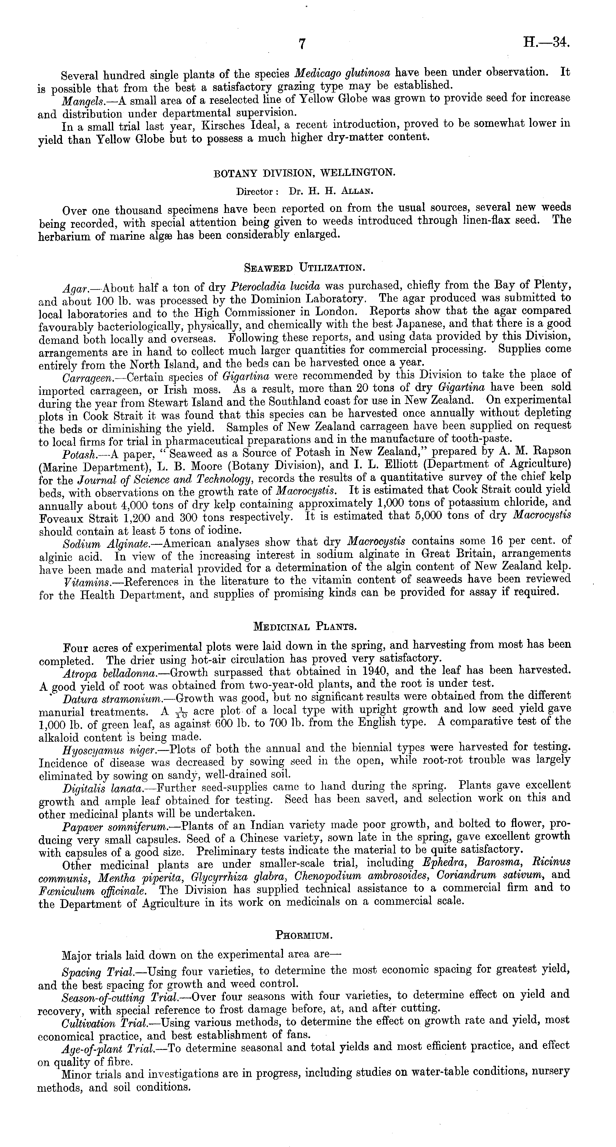 Several hundred single plants of the species Medicago glutinosa have been under observation. It is possible that from the best a satisfactory grazing type may be established. Mangels. —A small area of a reselected line of Yellow Globe was grown to provide seed for increase and distribution under departmental supervision. In a small trial last year, Kirsches Ideal, a recent introduction, proved to be somewhat lower in yield than Yellow Globe but to possess a much higher dry-matter content. BOTANY DIVISION, WELLINGTON. Director: Dr. H. H. Allan. Over one thousand specimens have been reported on from the usual sources, several new weeds being recorded, with special attention being given to weeds introduced through linen-flax seed. The herbarium of marine algse has been considerably enlarged. Seaweed Utilization. Agar.—About half a ton of dry Pterocladia lucida was purchased, chiefly from the Bay of Plenty, and about 100 lb. was processed by the Dominion Laboratory. The agar produced was submitted to local laboratories and to the High Commissioner in London. Reports show that the agar compared favourably bacteriologically, physically, and chemically with the best Japanese, and that there is a good demand both locally and overseas. Following, these reports, and using data provided by this Division, arrangements are in hand to collect much larger quantities for commercial processing. Supplies come entirety from the North Island, and the beds can be harvested once a year. _ Carrageen. —Certain species of Gigartina were recommended by this Division to take the place of imported carrageen, or Irish moss. As a result, more than 20 tons of dry Gigartina have been sold during the year from Stewart Island and the Southland coast for use in New Zealand. On experimental plots in Cook Strait it was found that this species can be harvested oncc annually without depleting the beds or diminishing the yield. Samples of New Zealand carrageen have been supplied on request to local firms for trial in pharmaceutical preparations and in the manufacture of tooth-paste. Potash. —A paper, " Seaweed as a Source of Potash in New Zealand," prepared by A. M. Rapson (Marine Department), L. 13. Moore (Botany Division), and I. L. Elliott (Department of Agriculture) for the Journal of Science and Technology, records the results of a quantitative survey of the chief kelp beds, with observations on the growth rate of Macrocystis. It is estimated that Cook Strait could yield annually about 4,000 tons of dry kelp containing approximately 1,000 tons of potassium chloride, and Foveaux Strait 1,200 and 300 tons respectively. It is estimated that 5,000 tons of dry Macrocystis should contain at least 5 tons of iodine. Sodium Alginate. —American analyses show that dry Macrocystis contains some 16 per cent, of alginic acid. In view of the increasing interest in sodium alginate in Great Britain, arrangements have been made and material provided for a determination of the algin content of New Zealand kelp. Vitamins. —References in the literature to the vitamin content of seaweeds have been reviewed for the Health Department, and supplies of promising kinds can be provided for assay if required. Medicinal Plants. Four acres of experimental plots were laid down in the spring, and harvesting from most has been completed. The drier using hot-air circulation has proved very satisfactory. Atropa belladonna.—Growth surpassed that obtained in 1940, and the leaf has been harvested. A good yield of root was obtained from two-year-old plants, and the root is under test. ' Datura stramonium.—Growth was good, but no significant results were obtained from the different manurial treatments. A acre plot of a local type with upright growth and low seed yield gave 1,000 lb. of green leaf, as against 600 lb. to 700 lb. from the English type. A comparative test of the alkaloid content is being made. Hyoscyamus niger.—'?lots of both the annual and the biennial types were harvested for testing. Incidence 'of disease was decreased by sowing seed in the open, while root-rot trouble was largely eliminated by sowing on sandy, well-drained soil. Digitalis lanata.—Further seed-supplies came to hand during the spring. Plants gave excellent growth' and ample leaf obtained for testing. Seed has been saved, and selection work on this and other medicinal plants will be undertaken. Papaver somniferum.- —Plants of an Indian variety made poor growth, and bolted to flower, producing very small capsules. Seed of a Chinese variety, sown late in the spring, gave excellent growth with capsules of a good size. Preliminary tests indicate the material to be quite satisfactory. Other medicinal plants are under smaller-scale trial, including Ephedra, Barosma, Ricinus communis, Mentha piperita, Glycyrrhiza glabra, Ghenopodium ambrosoides, Coriandrum sativum, and jFccniculum officinale. The Division has supplied technical assistance to a commercial firm and to the Department of Agriculture in its work on medicinals on a commercial scale. Phormium. Major trials laid down on the experimental area are — Spacing Trial—Using four varieties, to determine the most economic spacing for greatest yield, and the best spacing for growth and weed control. Season-of-cutting Trial—Over four seasons with four varieties, to determine effect on yield and recovery, with special reference to frost damage before, at, and after cutting. Cultivation Trial.—Using various methods, to determine the effect on growth rate and yield, most economical practice, and best establishment of fans. Age-of-plant Trial—To determine seasonal and total yields and most efficient practice, and effect on quality of fibre. Minor trials and investigations are in progress, including studies on water-table conditions, nursery methods, and soil conditions.