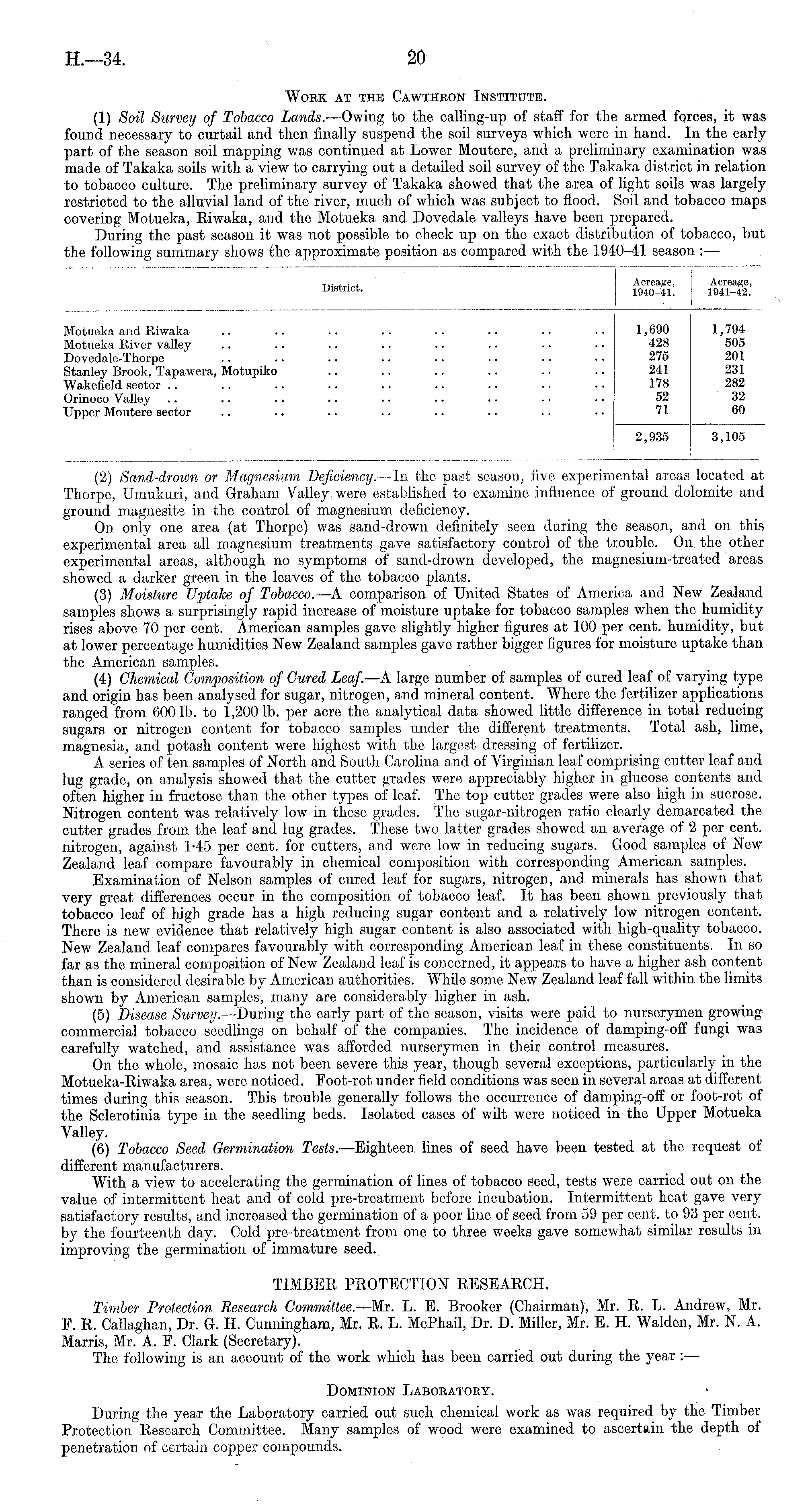 WOBK AT THE CaWTHRON INSTITUTE. (1) Soil Survey of Tobacco Lands. —Owing to the oalling-up of staff for the armed forces, it was found necessary to curtail and then finally suspend the soil surveys which were in hand. In the early part of the season soil mapping was continued at Lower Moutere, and a preliminary examination was made of Takaka soils with a view to carrying out a detailed soil survey of the Takaka district in relation to tobacco culture. The preliminary survey of Takaka showed that the area of light soils was largely restricted to the alluvial land of the river, much of which was subject to flood. Soil and tobacco maps covering Motueka, Eiwaka, and the Motueka and Dovedale valleys have been prepared. During the past season it was not possible to check up on the exact distribution of tobacco, but the following summary shows the approximate position as compared with the 1940-41 season : —